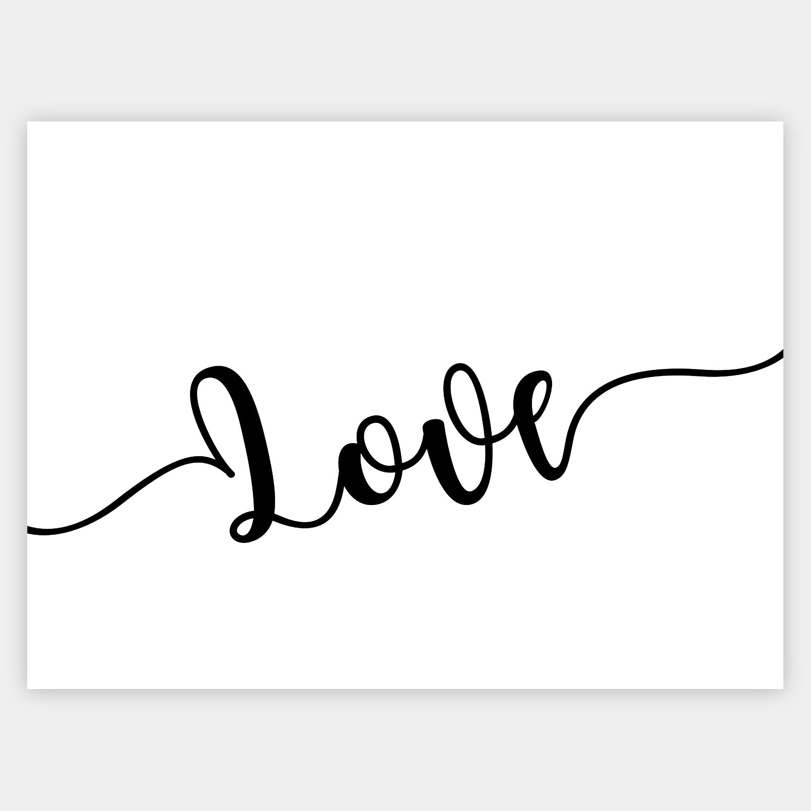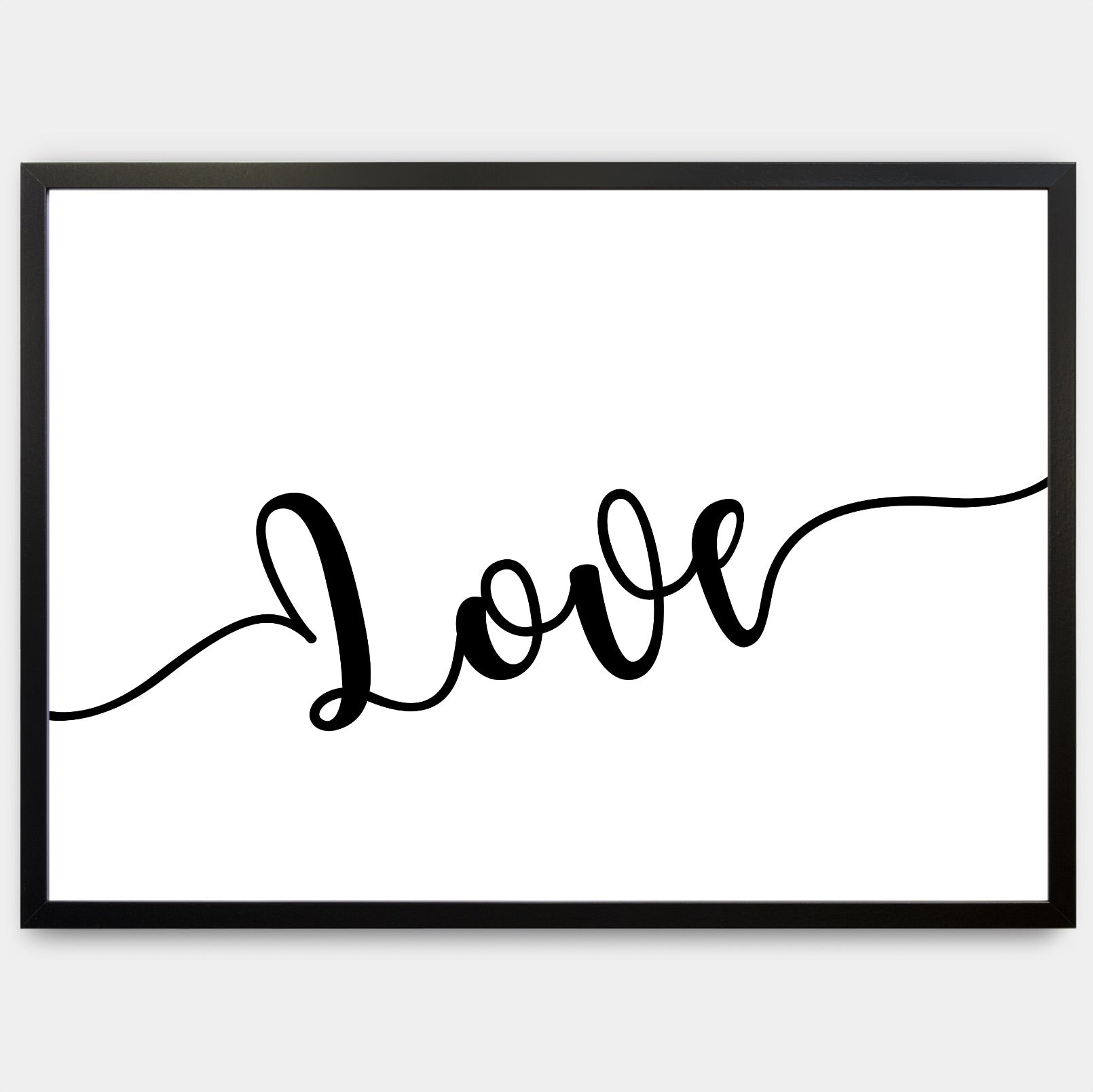Plakát s moderním kaligrafickým nápisem Love. Poster se prodává bez rámu s možností doobjednat tenký dřevěný rám o tloušťce 1,2 cm. Na výběr jsou tři barevná provedení - bílý , černý a dubový design.