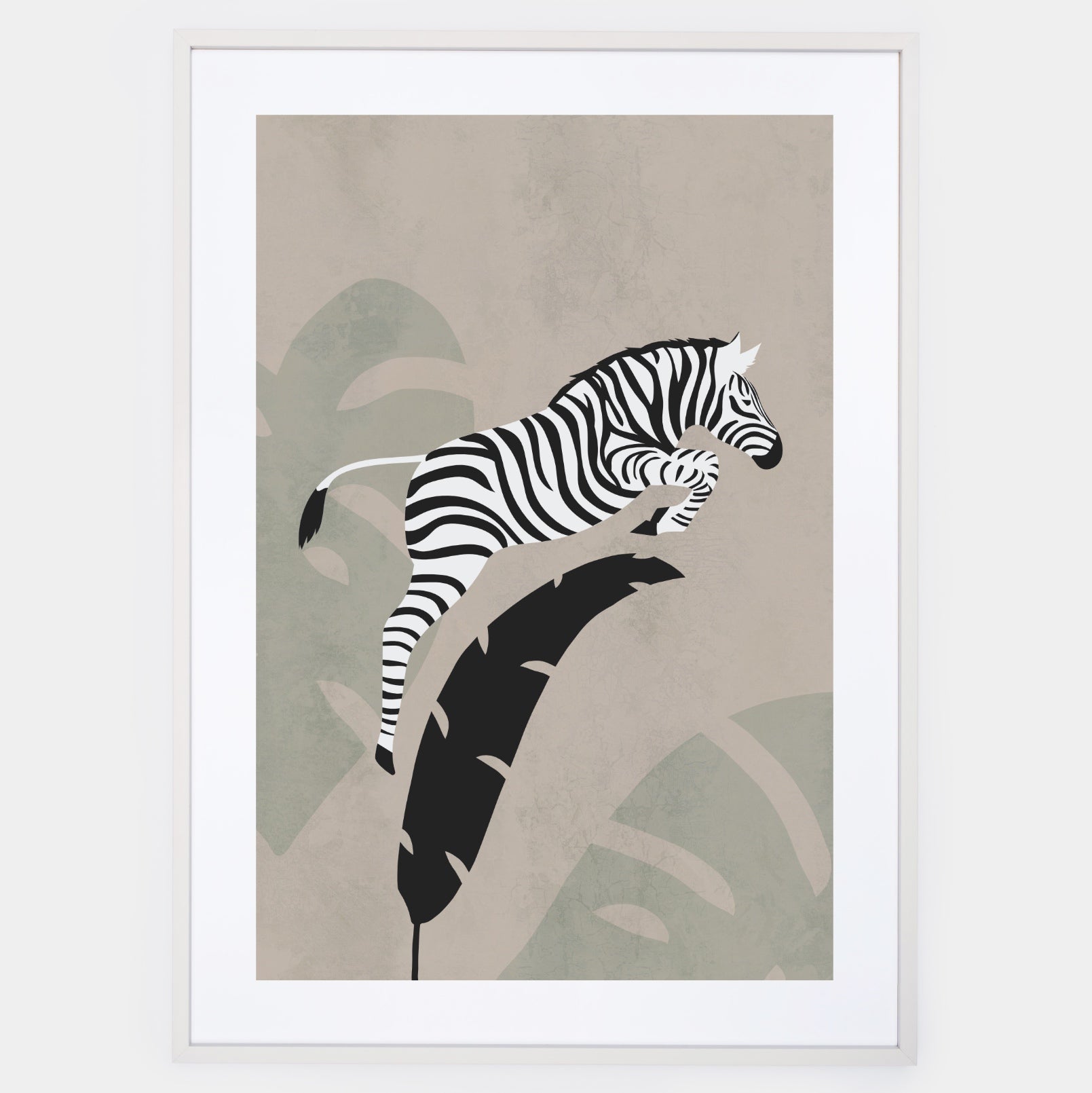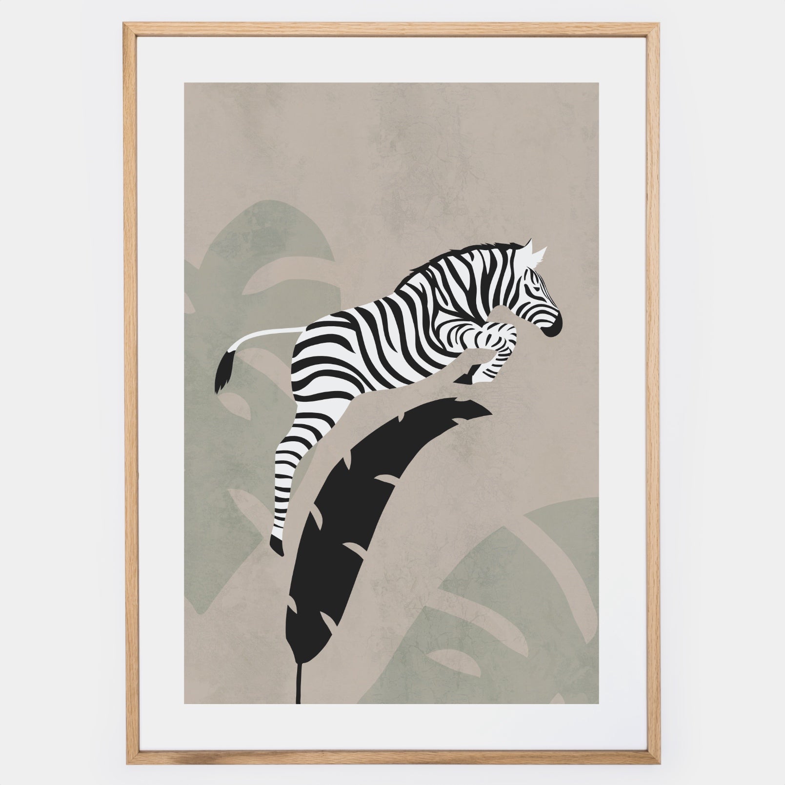 Plakát s grafikou skáčecí zebry. Elegantní bílý okraj je součástí printu. Poster se prodává bez rámu s možností doobjednat tenký dřevěný rám o tloušťce 1,2 cm. Na výběr jsou tři barevná provedení - bílý , černý a dubový design.