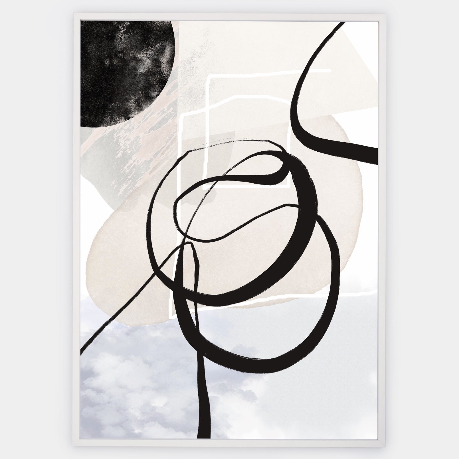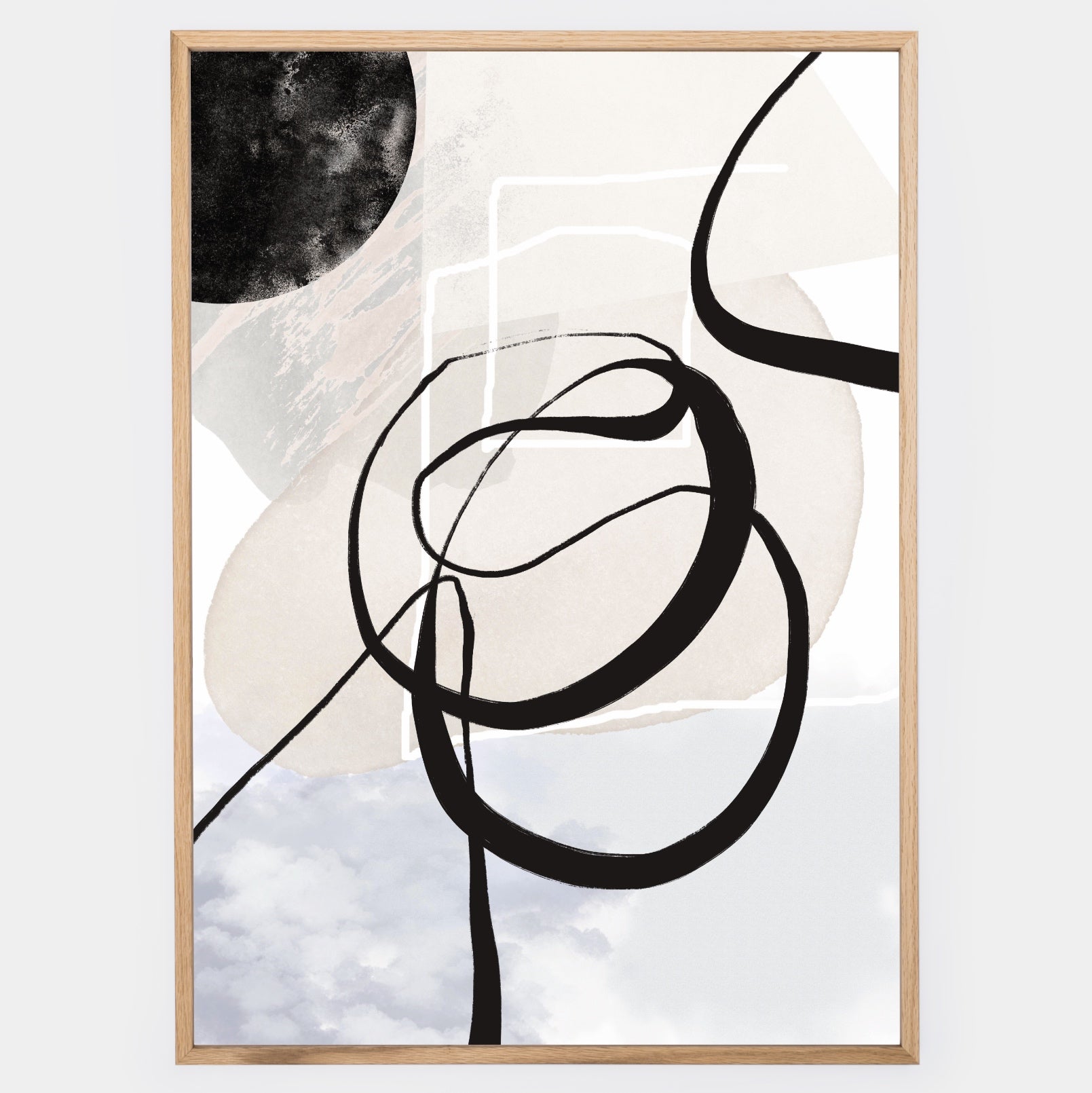 Poster with abstract graphics on a neutral background "Black Spray" No. 2. The poster is sold without a frame, with the option to order a thin wooden frame with a thickness of 1.2 cm. There are three color options to choose from - white , black and oak design.