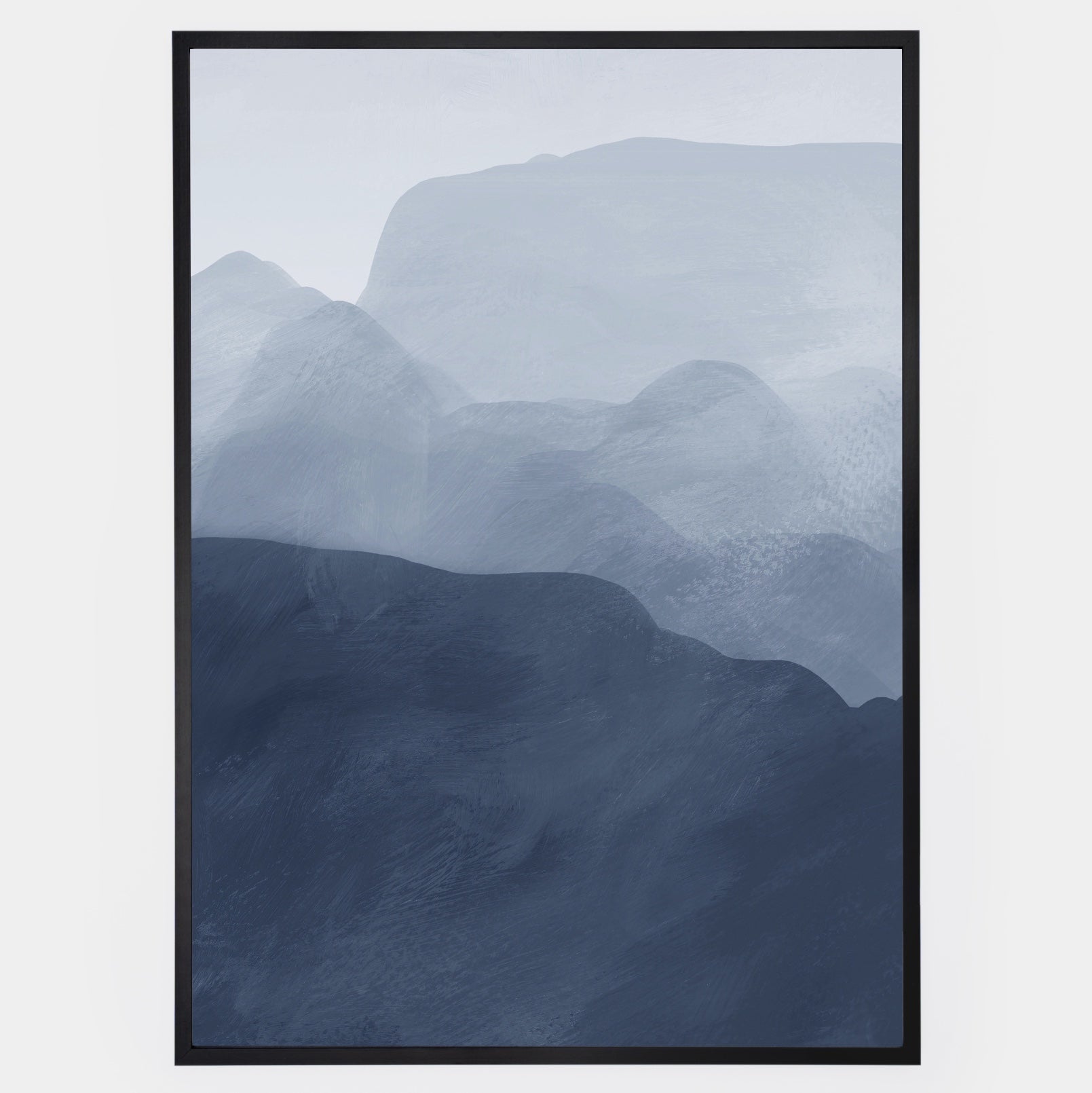 Poster with abstract graphics of blue mountains "Blue Mountains" No. 1. The poster is sold without a frame, with the option to order a thin wooden frame with a thickness of 1.2 cm. There are three color options to choose from - white , black and oak design.