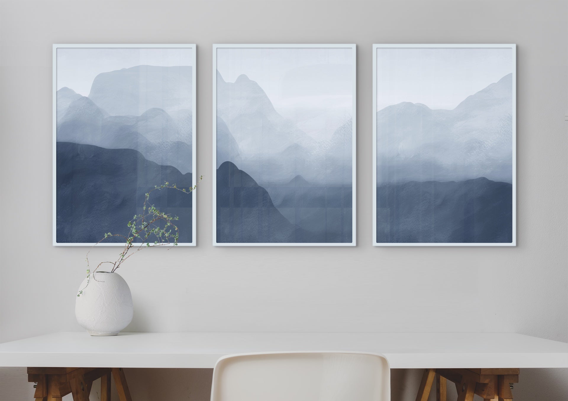 Poster with abstract graphics of blue mountains "Blue Mountains" No. 2. The poster is sold without a frame, with the option to order a thin wooden frame with a thickness of 1.2 cm. There are three color options to choose from - white , black and oak design.