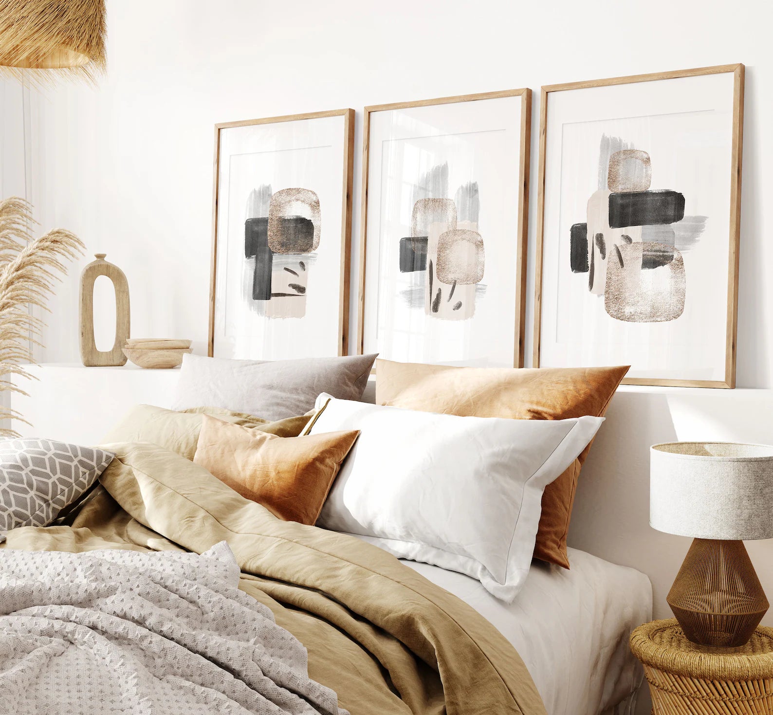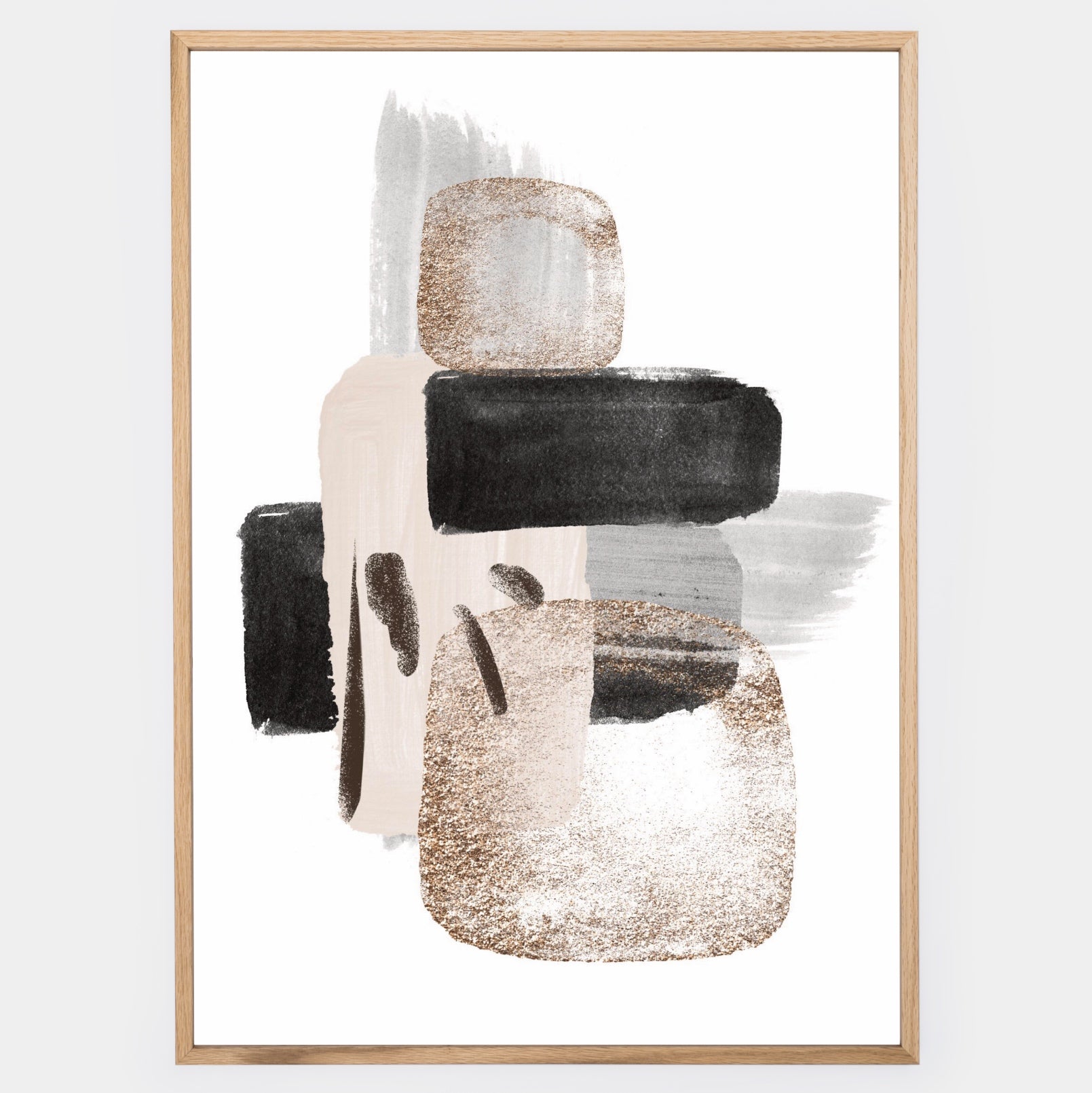 Poster with abstract graphics "Neutral Gold" No. 3. The poster is sold without a frame, with the option to order a thin wooden frame with a thickness of 1.2 cm. There are three color options to choose from - white , black and oak design.