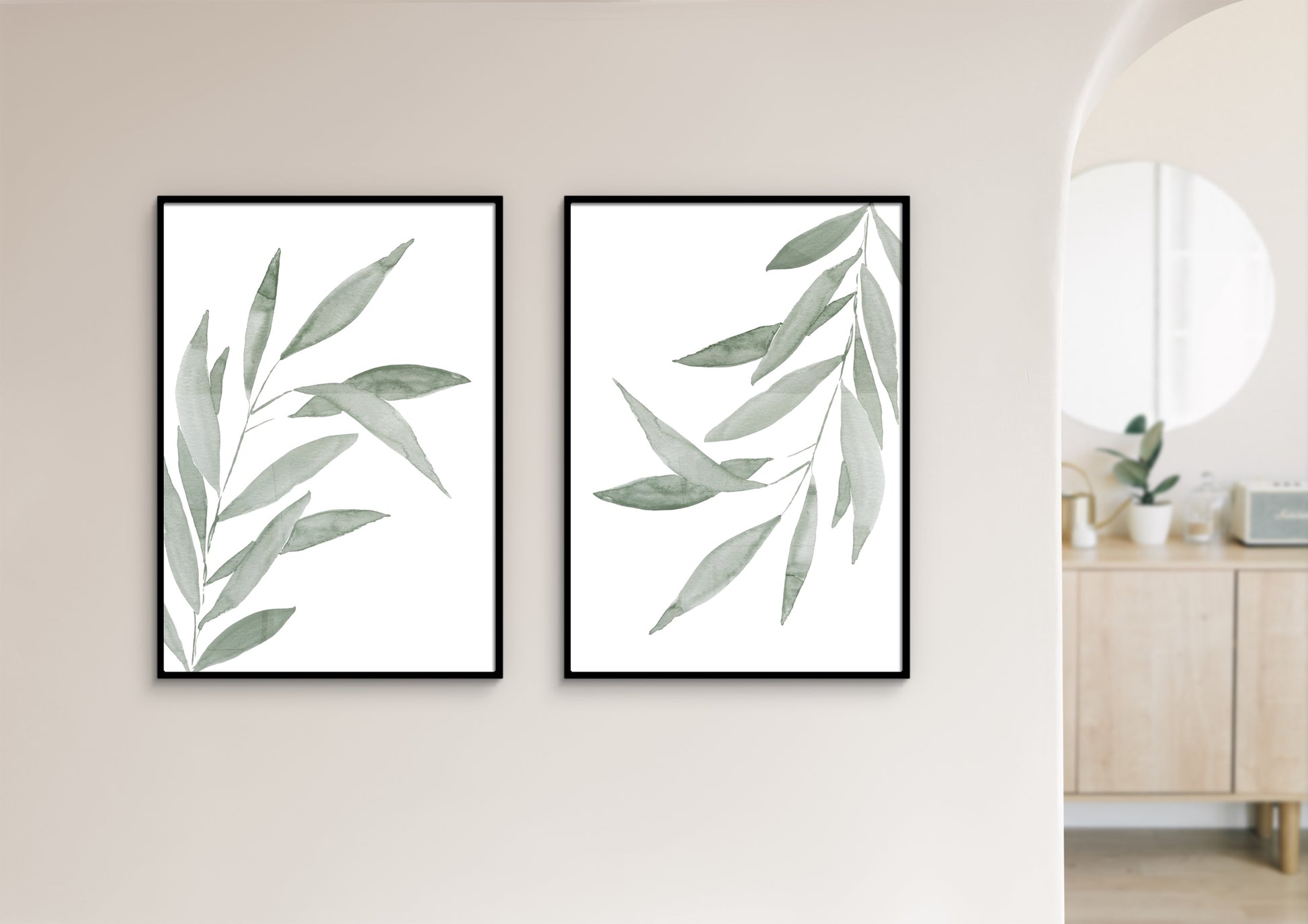 Boho poster with watercolor painting of twig with leaves 1. The poster is sold without a frame, with the option to order a thin wooden frame with a thickness of 1.2 cm. There are three color options to choose from - white , black and oak design.