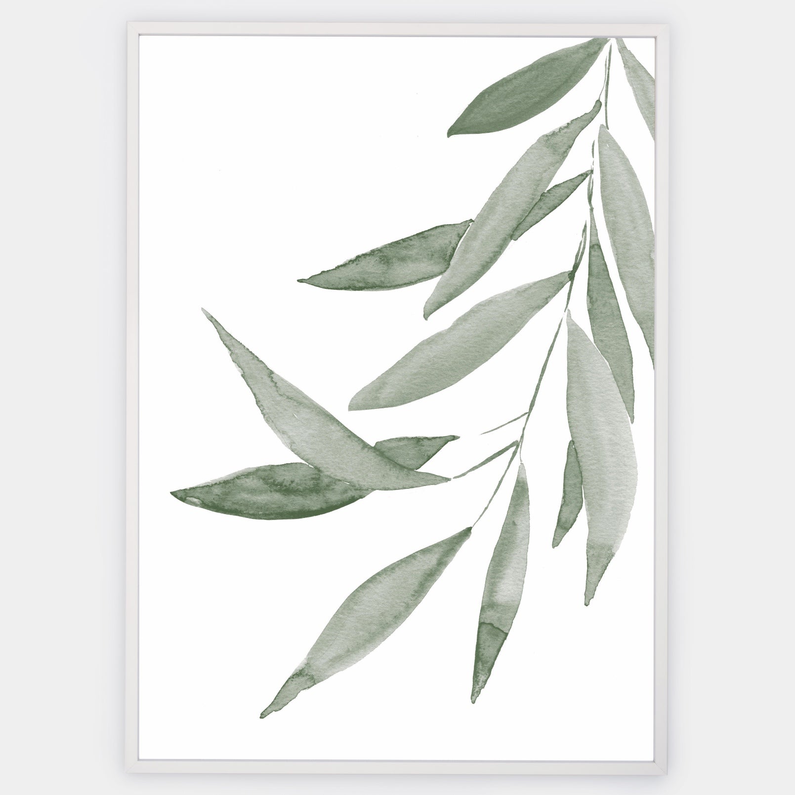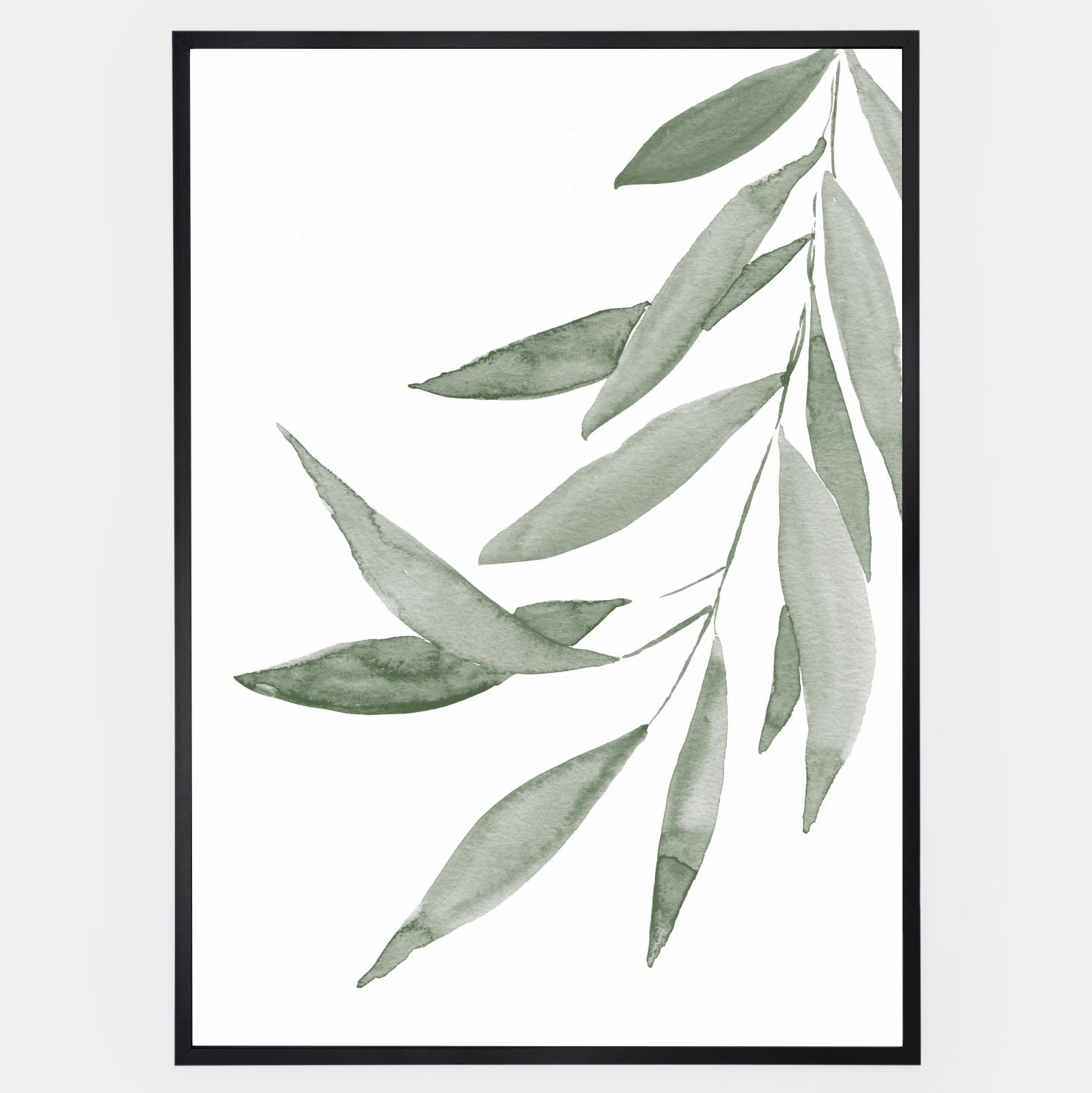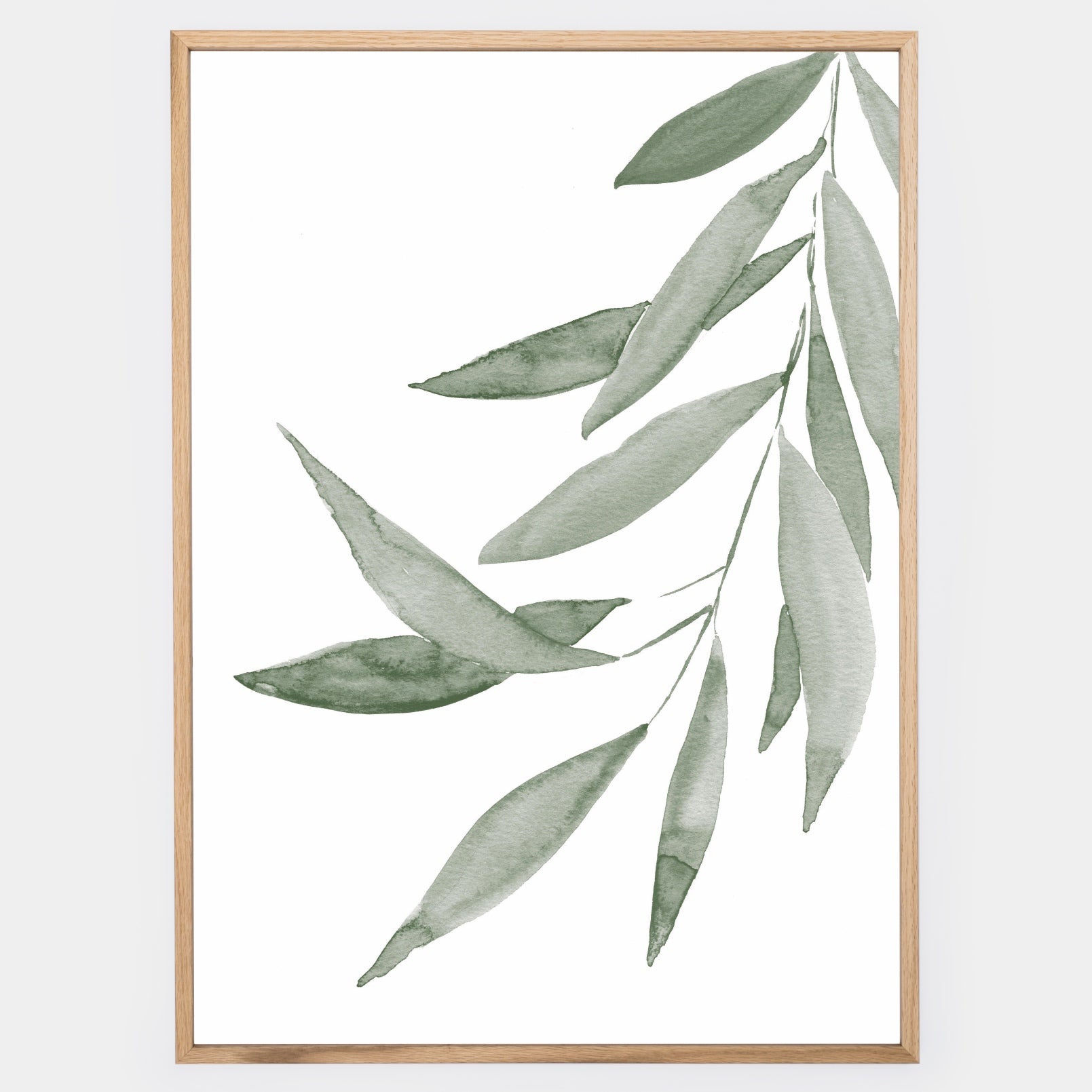 Boho poster with watercolor painting of twigs with leaves 2. The poster is sold without a frame, with the option to order a thin wooden frame with a thickness of 1.2 cm. There are three color options to choose from - white , black and oak design.