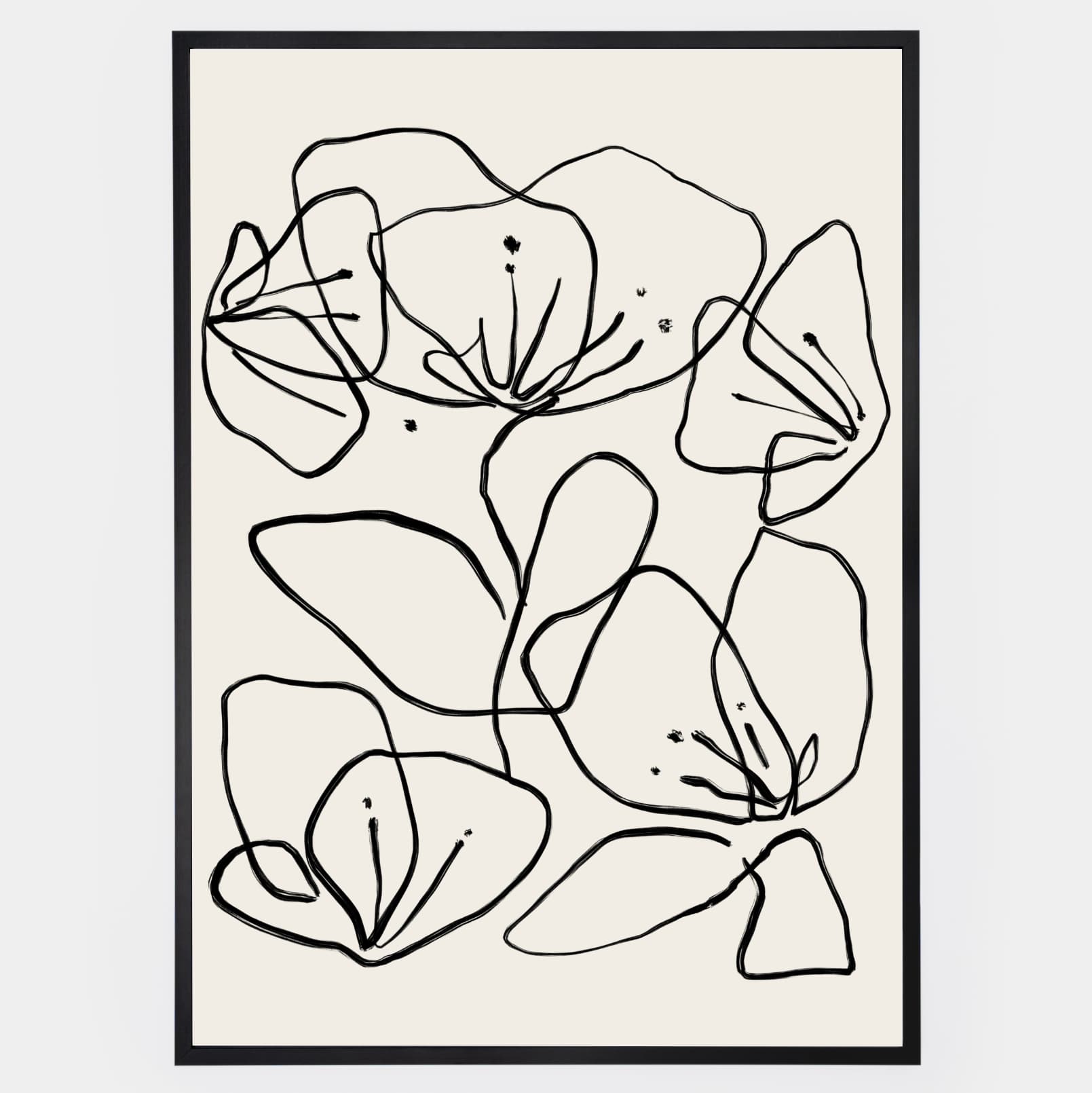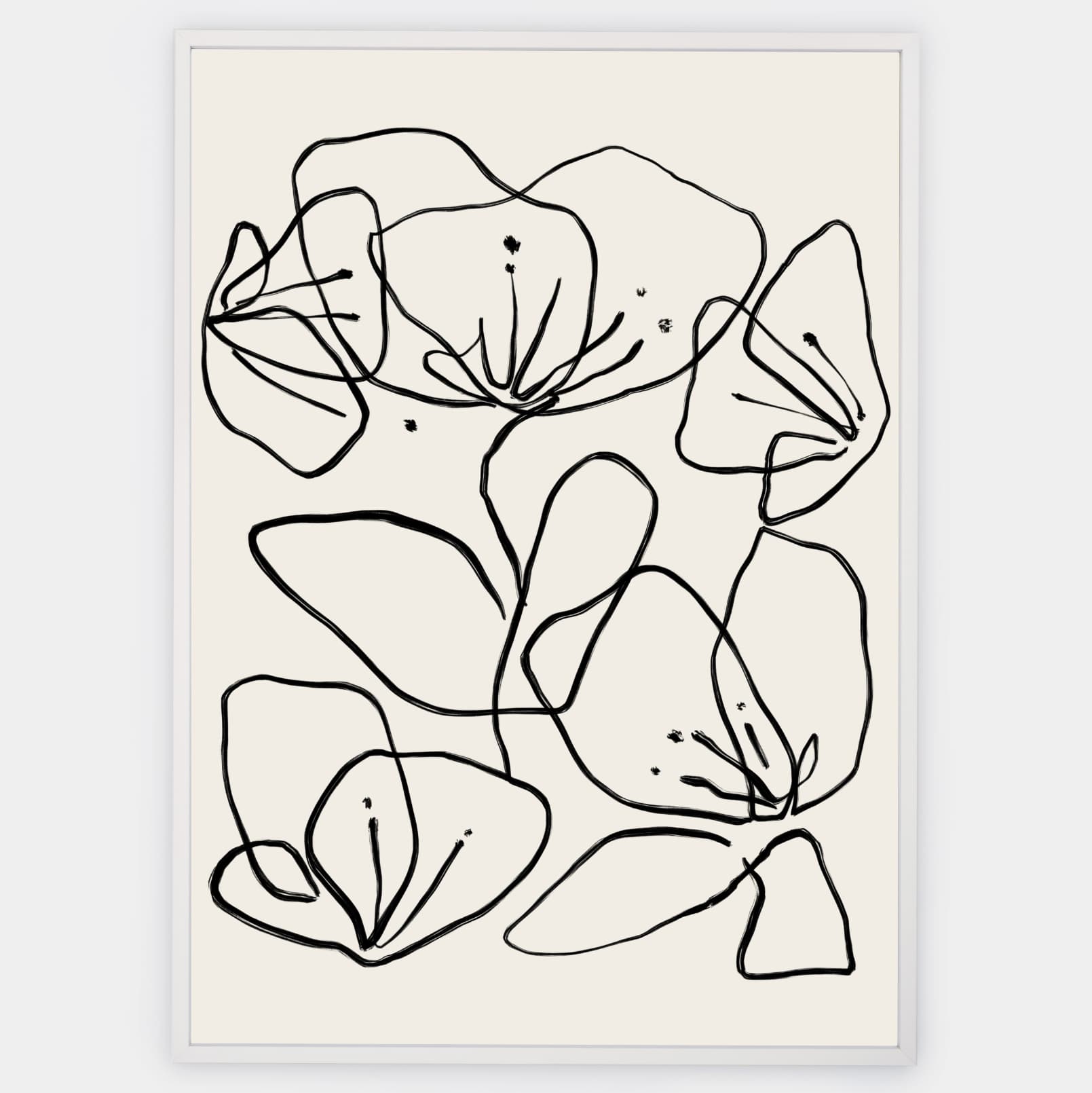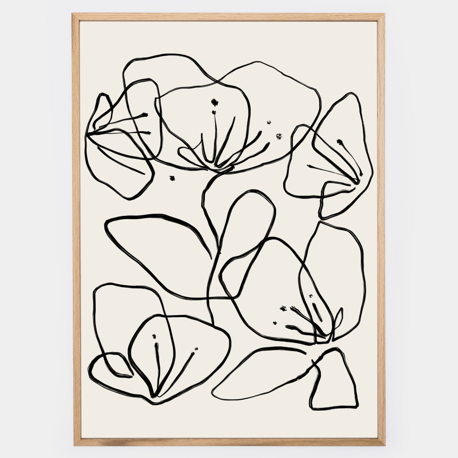 Boho poster with "Flower line" graphic set 1 on a beige background. The poster is sold without a frame, with the option to order a thin wooden frame with a thickness of 1.2 cm. There are three color options to choose from - white , black and oak design.