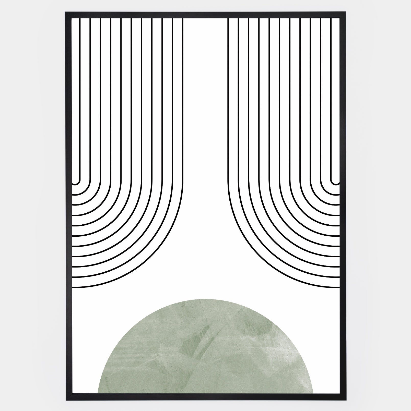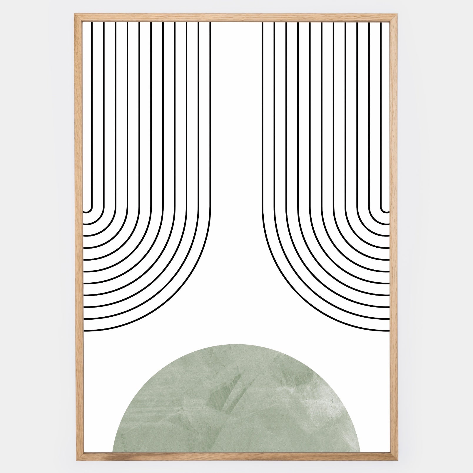 Boho poster with graphics of arches and circles "Green" 1. The poster is sold without a frame, with the option to order a thin wooden frame with a thickness of 1.2 cm. There are three color options to choose from - white , black and oak design.