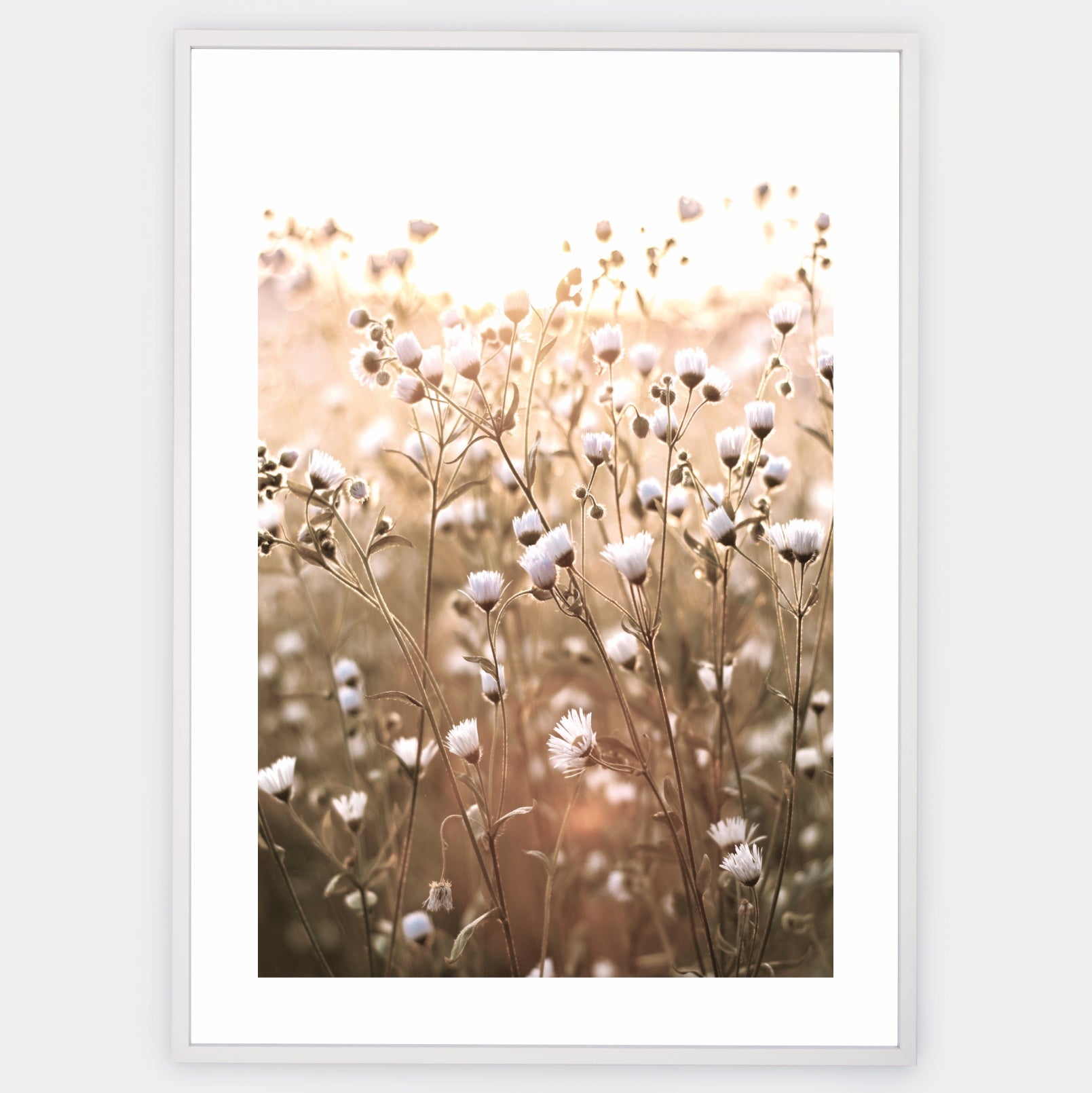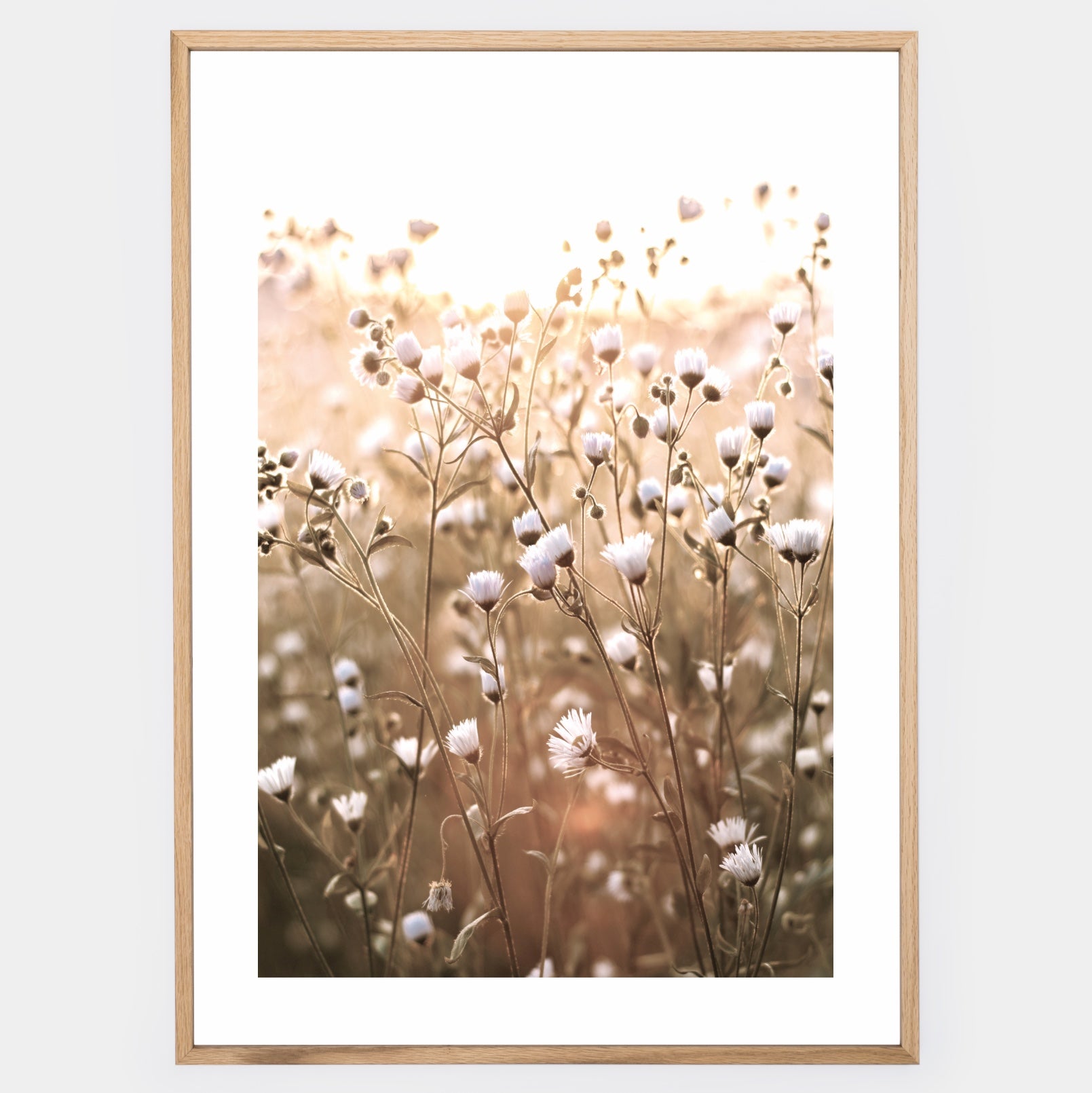 Boho poster with a photograph of meadow flowers. An elegant white border is part of the print. The poster is sold without a frame, with the option to order a thin wooden frame with a thickness of 1.2 cm. There are three color options to choose from - white , black and oak design.
