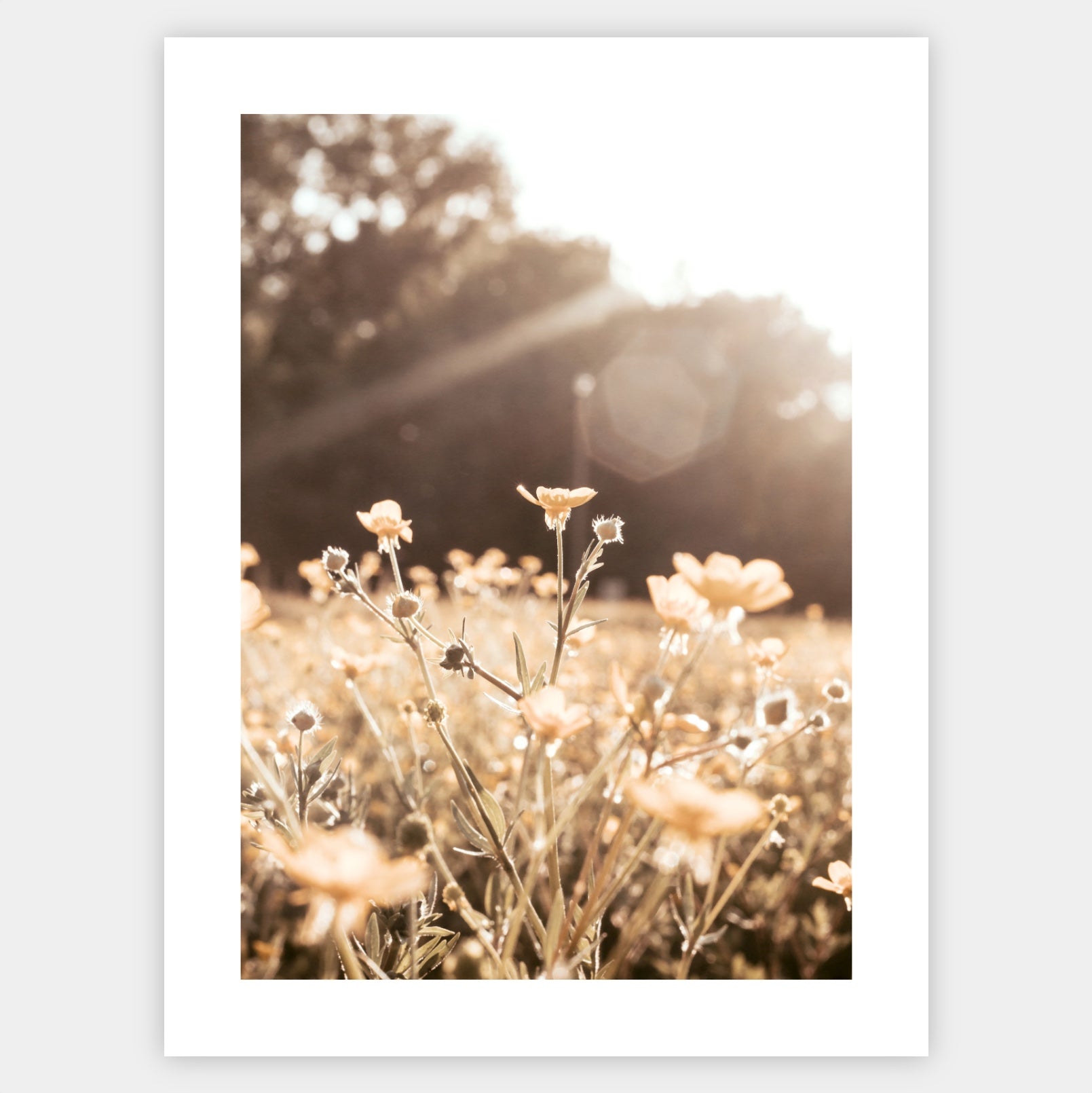 Boho poster with a photograph of meadow flowers at sunset. Elegant white border is part of the print. The poster is sold without a frame, with the option to order a thin wooden frame with a thickness of 1.2 cm. There are three color options to choose from - white , black and oak design.