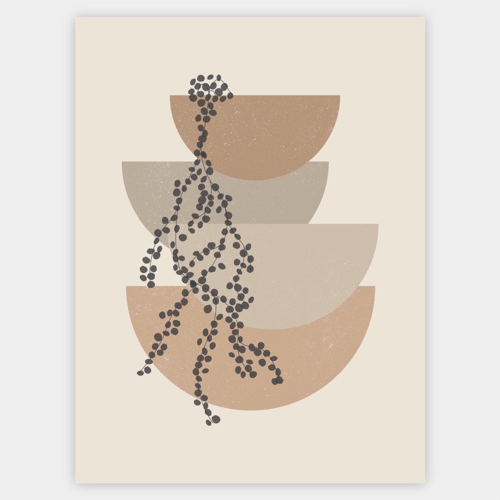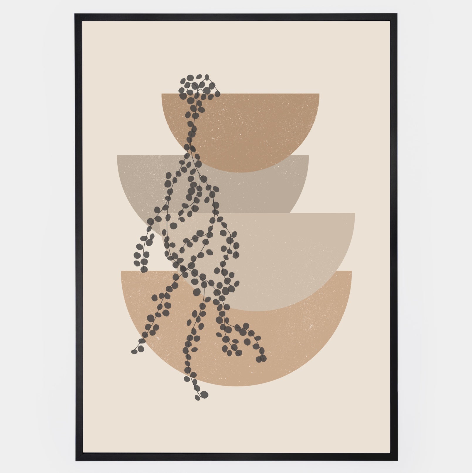 Boho poster with geometric shapes and a trailing plant in beige tones. The poster is sold without a frame, with the option to order a thin wooden frame with a thickness of 1.2 cm. There are three color options to choose from - white , black and oak design.