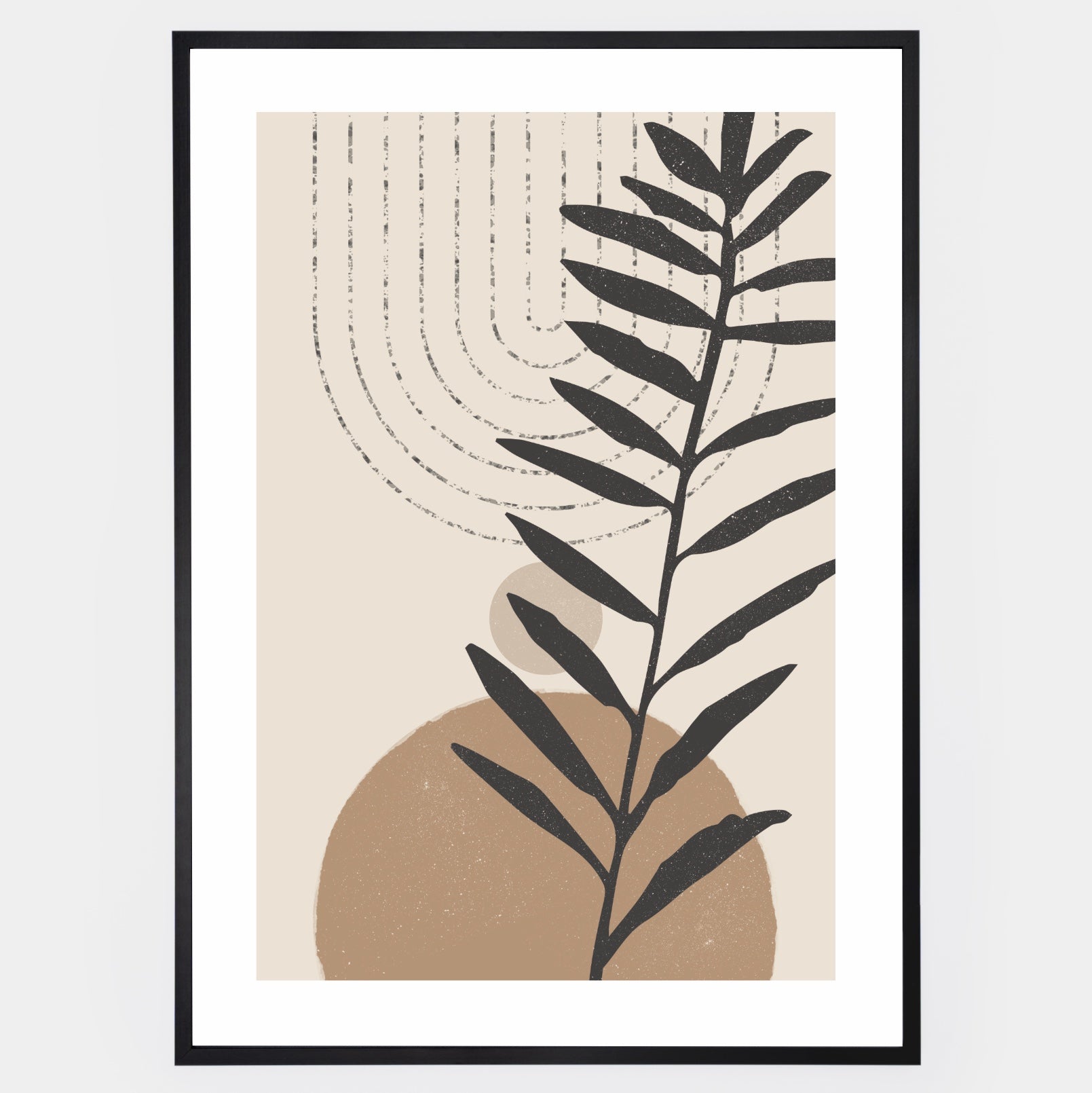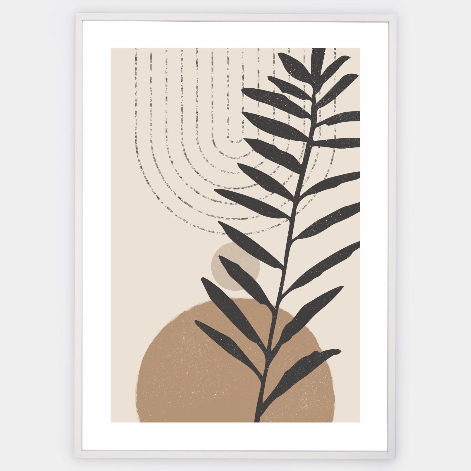 Boho poster with rounded geometric shapes in beige tones with a palm leaf silhouette. An elegant white border is part of the print. The poster is sold without a frame, with the option to order a thin wooden frame with a thickness of 1.2 cm. There are three color options to choose from - white , black and oak design.