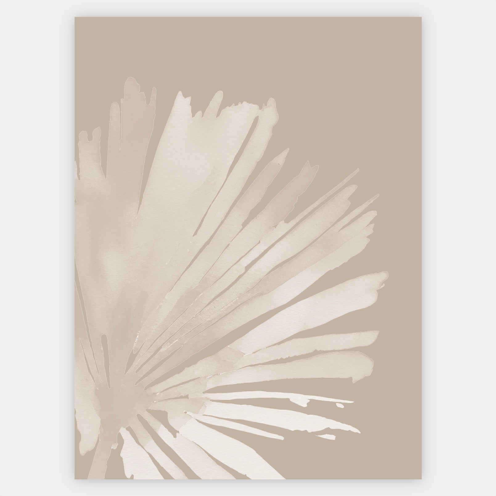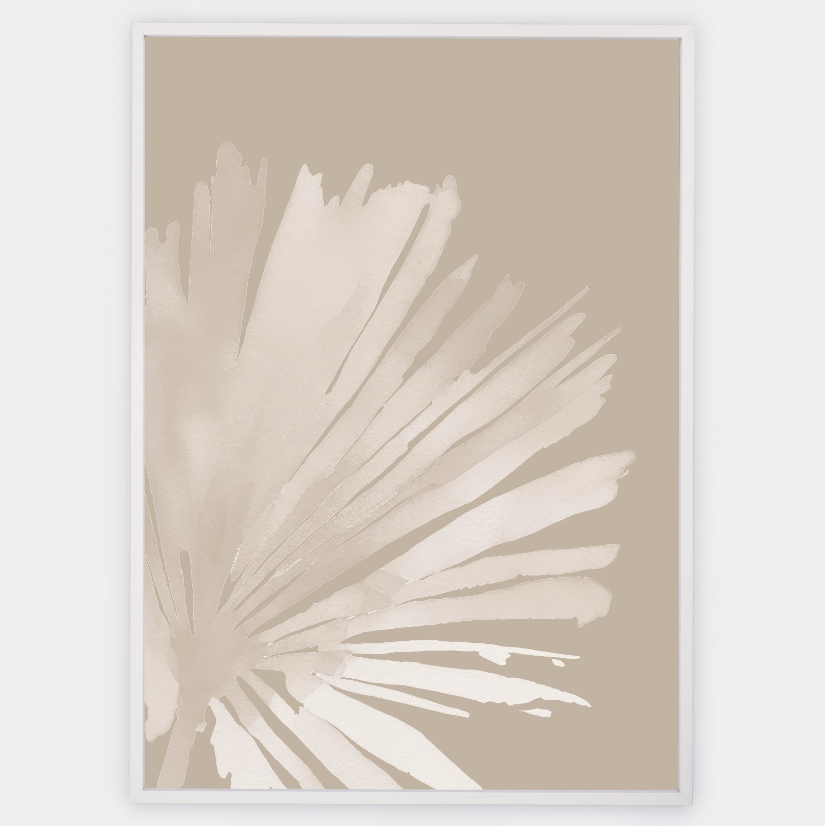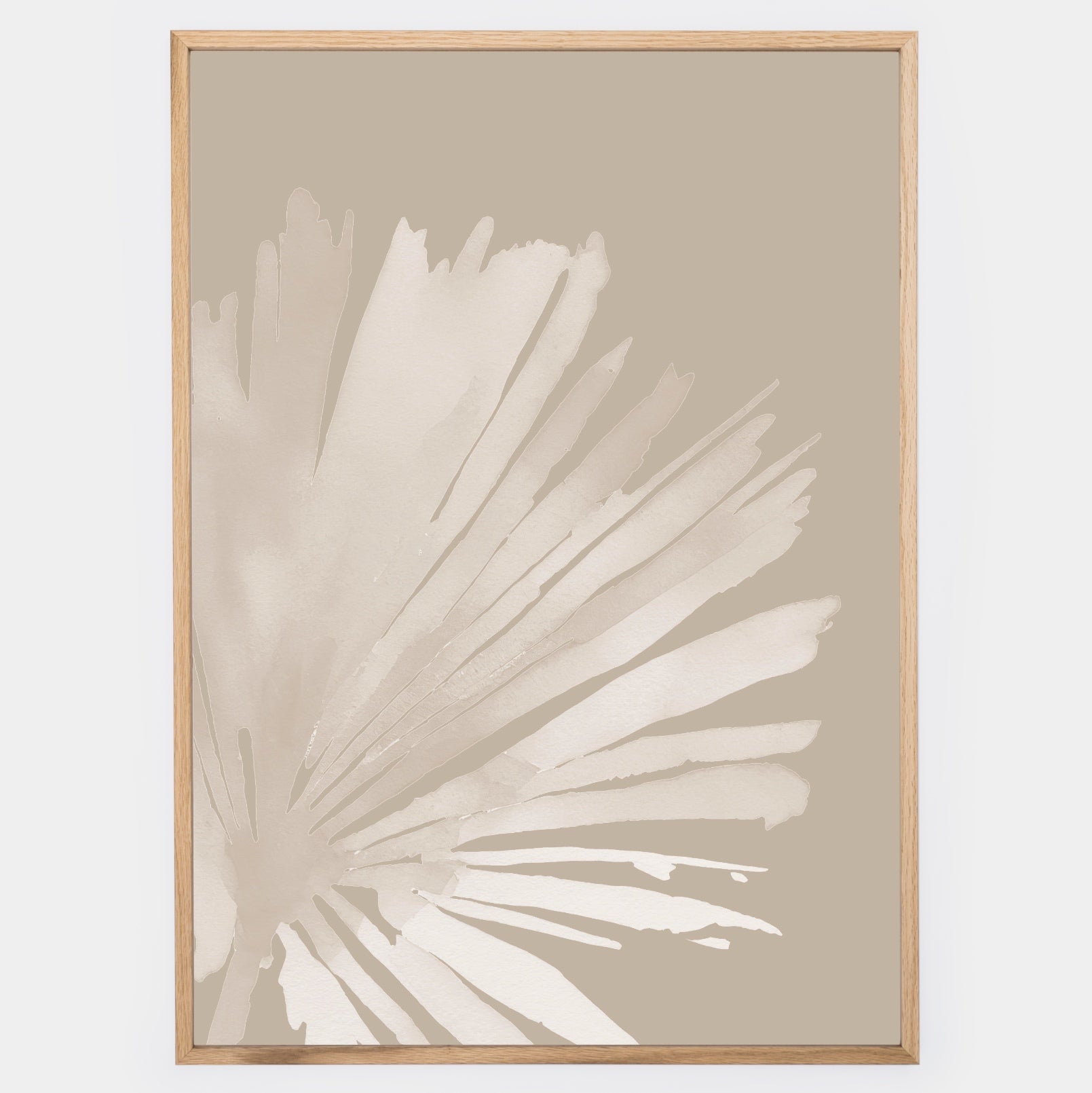 Boho poster with watercolor painting of a palm leaf on a beige background 1. The poster is sold without a frame, with the option to order a thin wooden frame with a thickness of 1.2 cm. There are three color options to choose from - white , black and oak design.