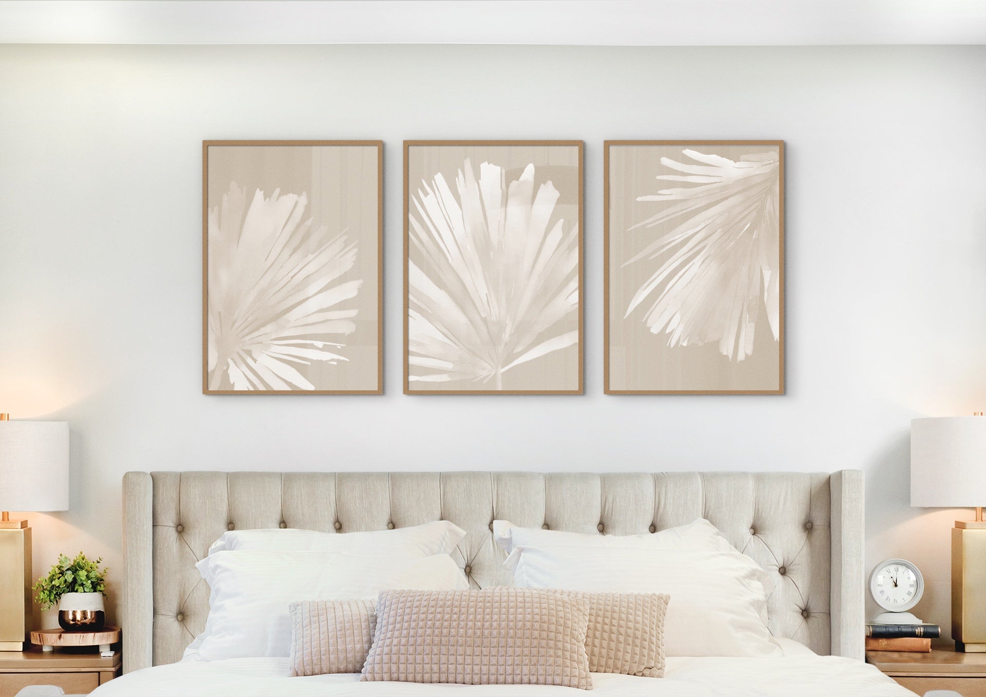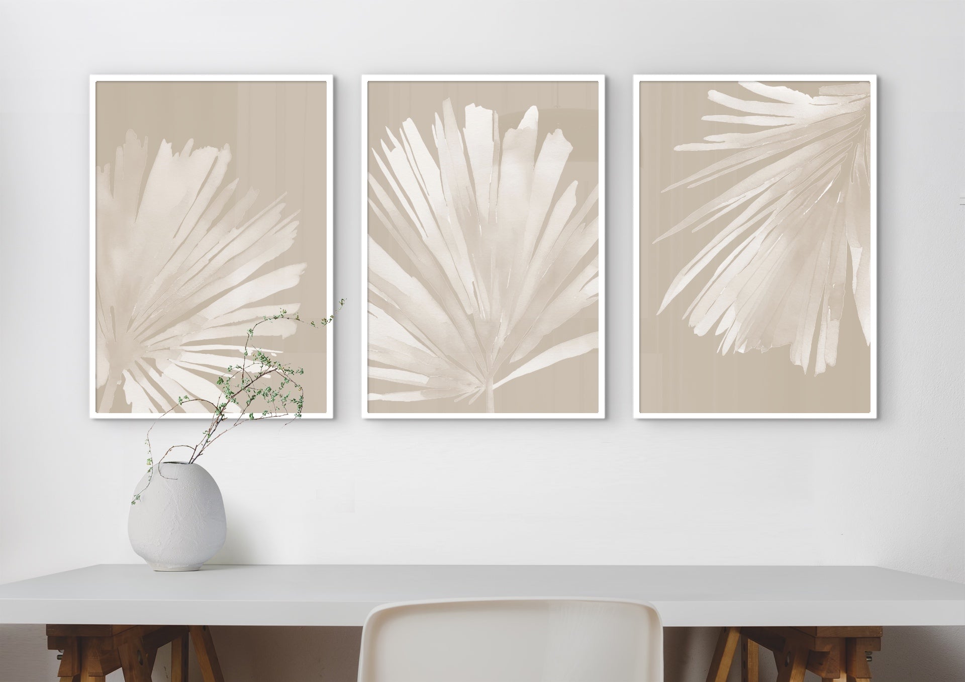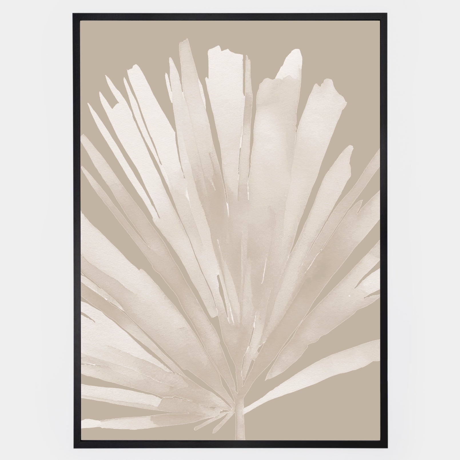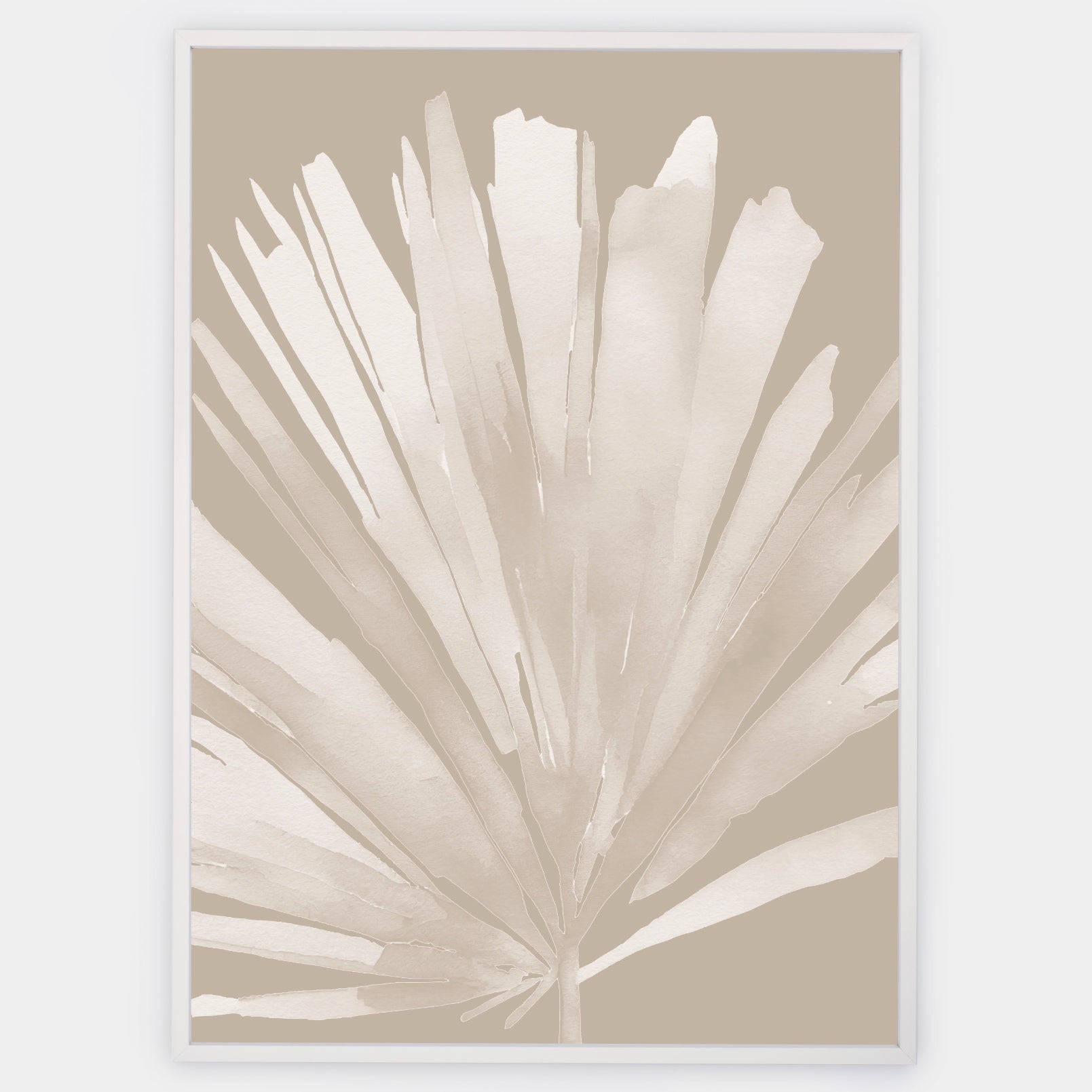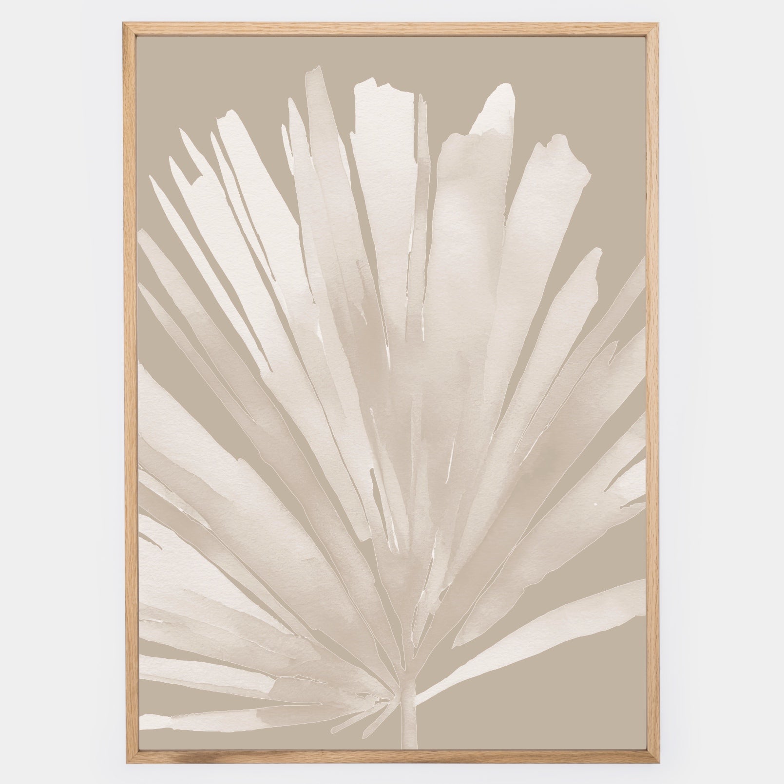 Boho poster with watercolor painting of palm leaf on beige background 2. The poster is sold without a frame, with the option to order a thin wooden frame with a thickness of 1.2 cm. There are three color options to choose from - white , black and oak design.