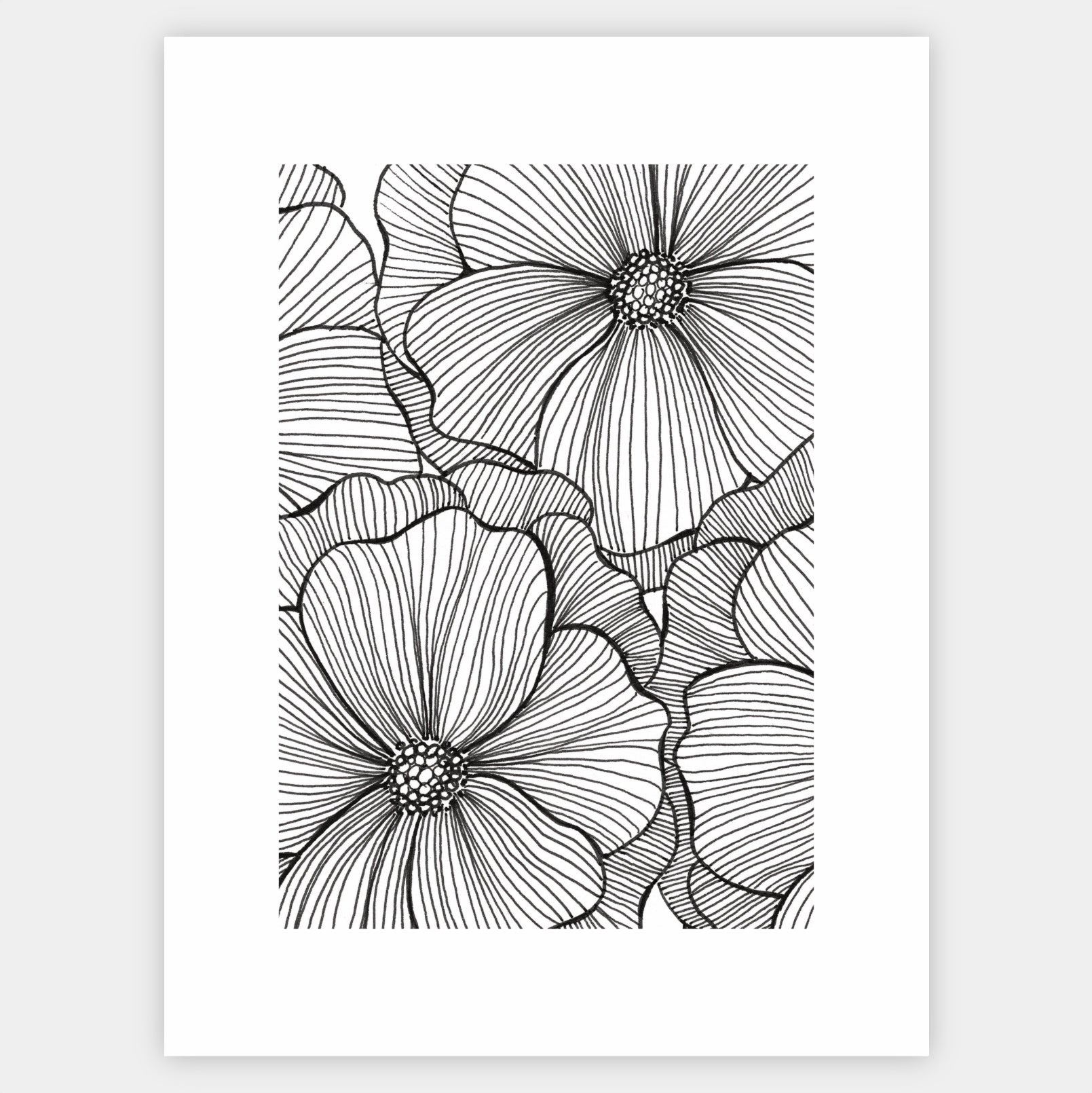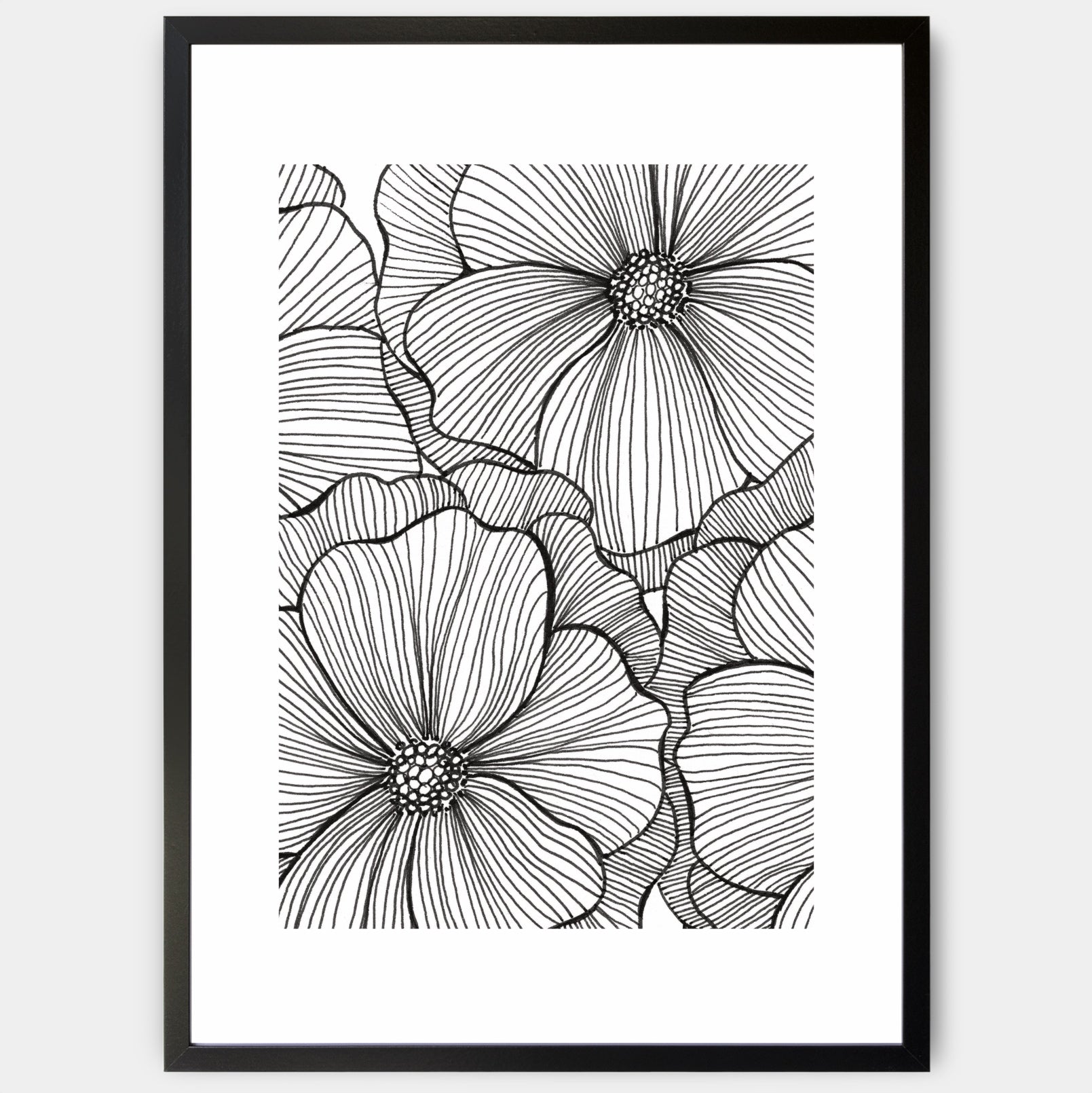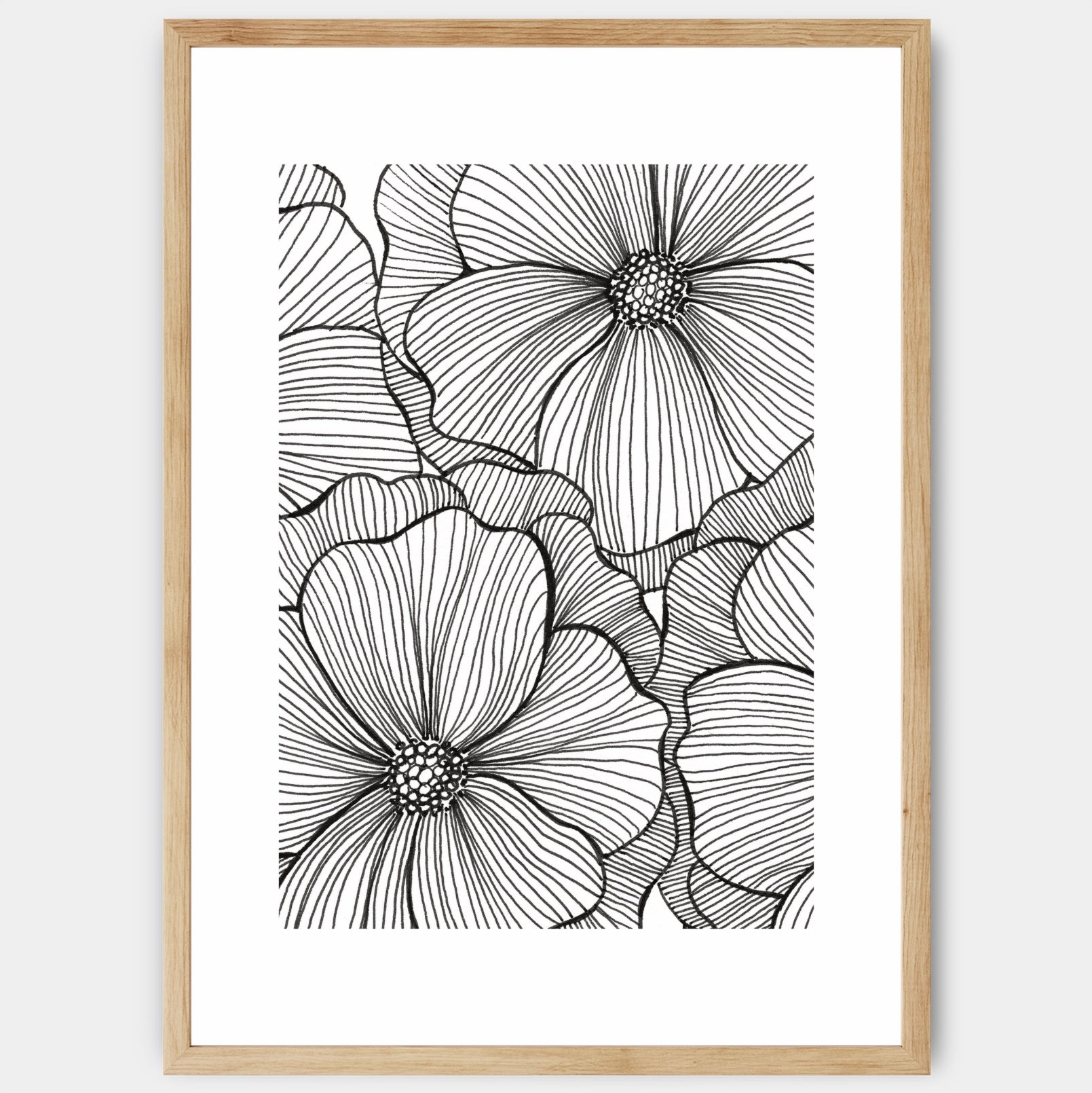 Print with a floral motif on a white background. An elegant white border is part of the poster. The poster is sold without a frame, with the option to order a thin wooden frame with a thickness of 1.2 cm. There are three color options to choose from - white , black and oak design.
