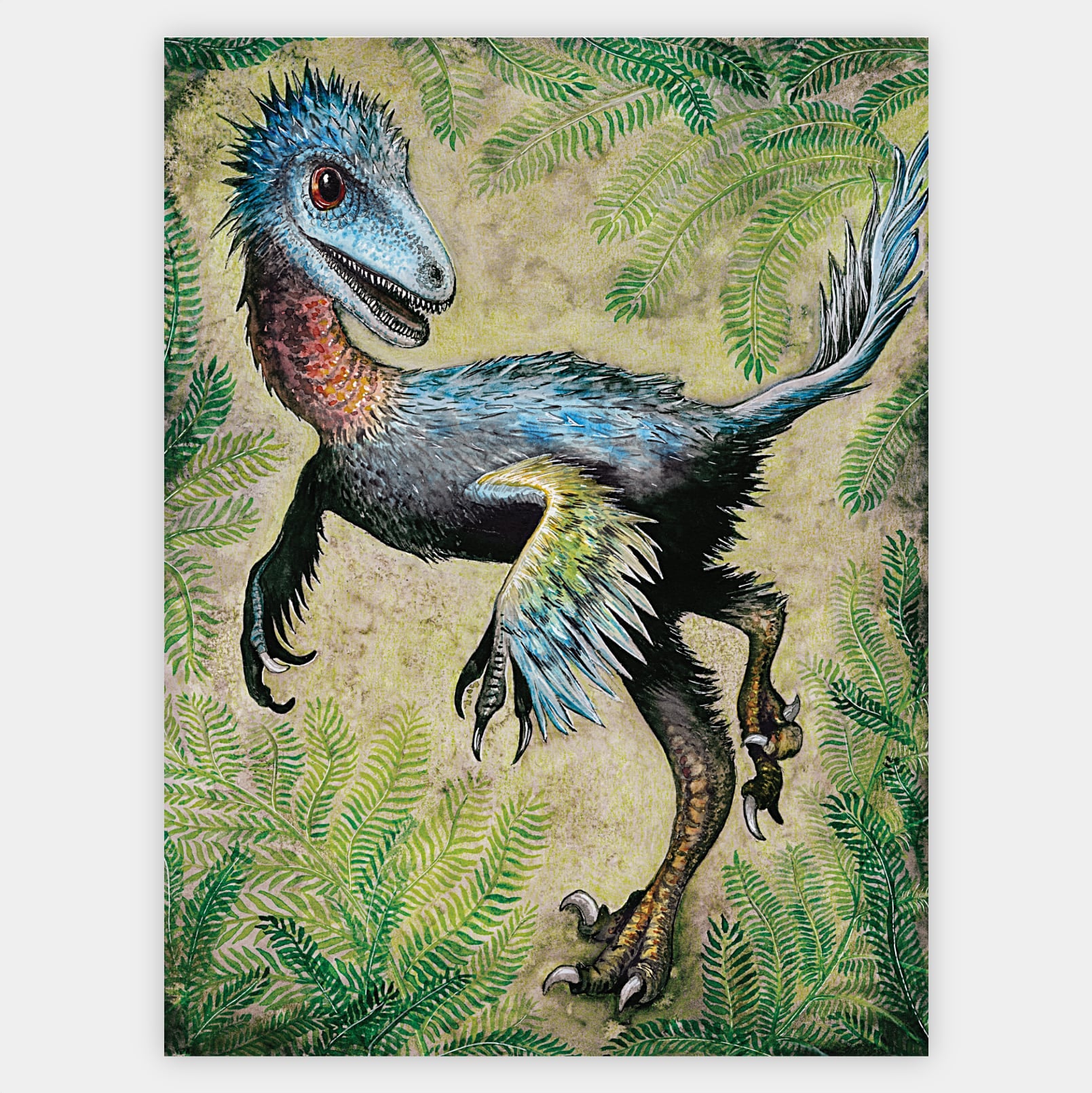 This cute watercolor art print captures a friendly dinosaur, whose curious gaze and soft colors will brighten up any child's room. Its feathered appearance and playful expression will spark children's imagination and interest in the prehistoric world.