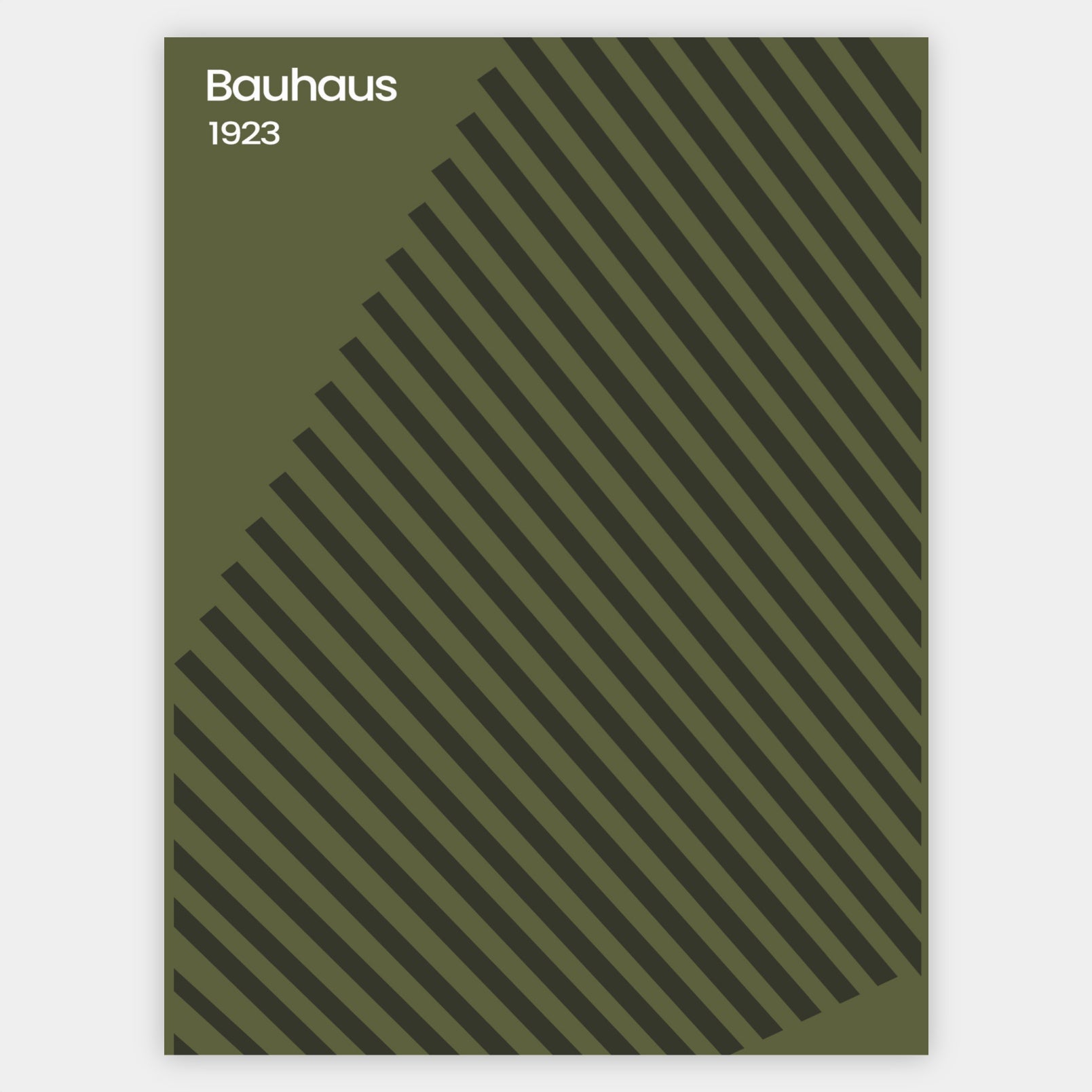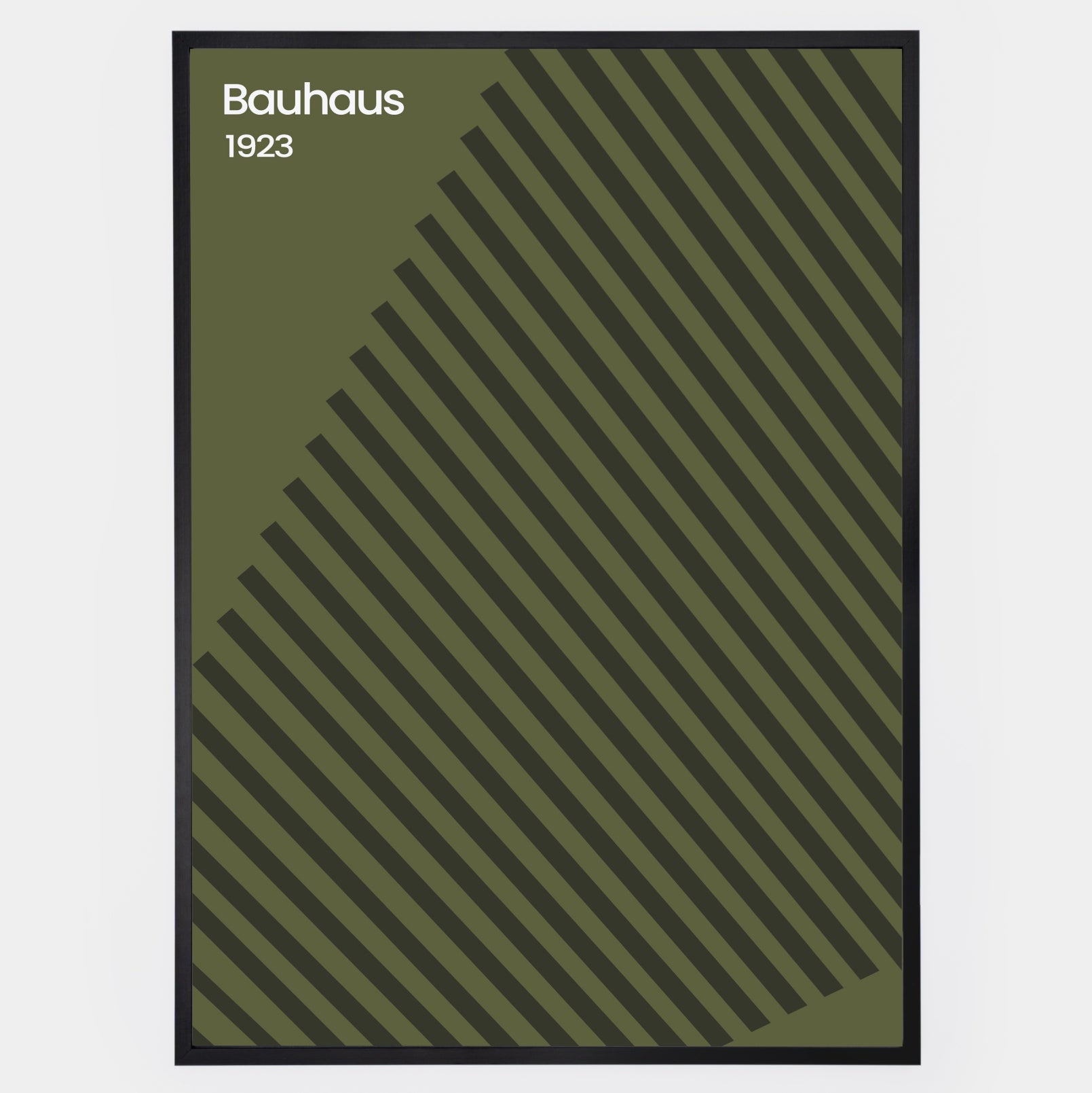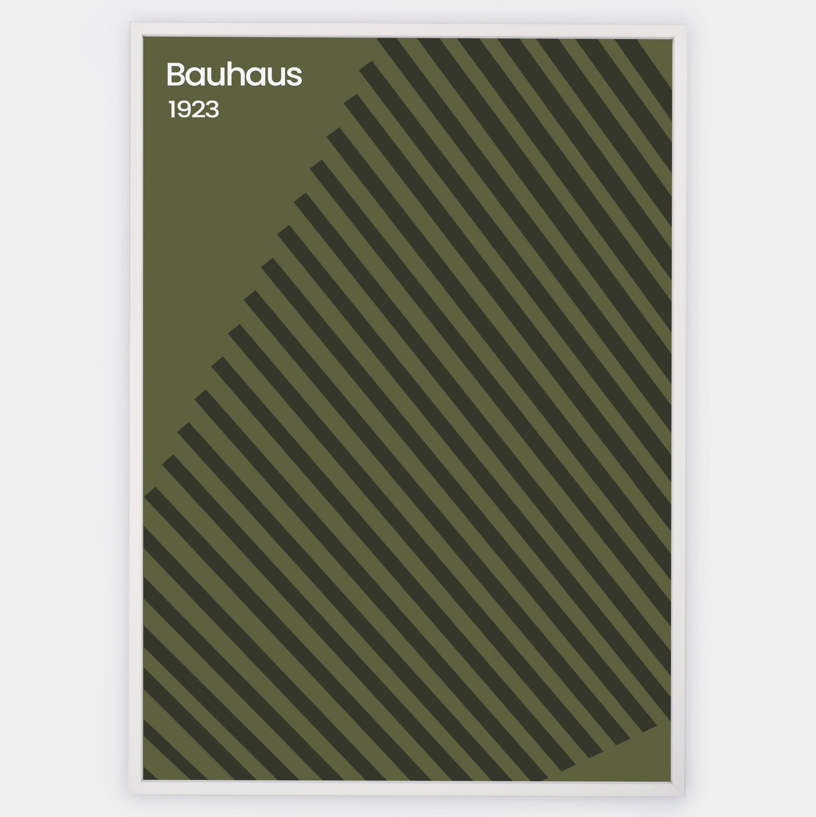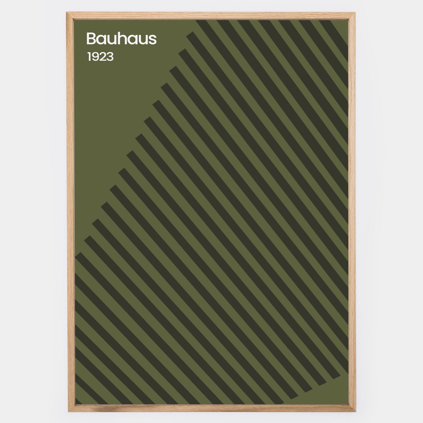 Poster with graphics inspired by the famous German art school Bauhaus in khaki green. The poster is sold without a frame, with the option to order a thin wooden frame with a thickness of 1.2 cm. There are three color options to choose from - white , black and oak design.
