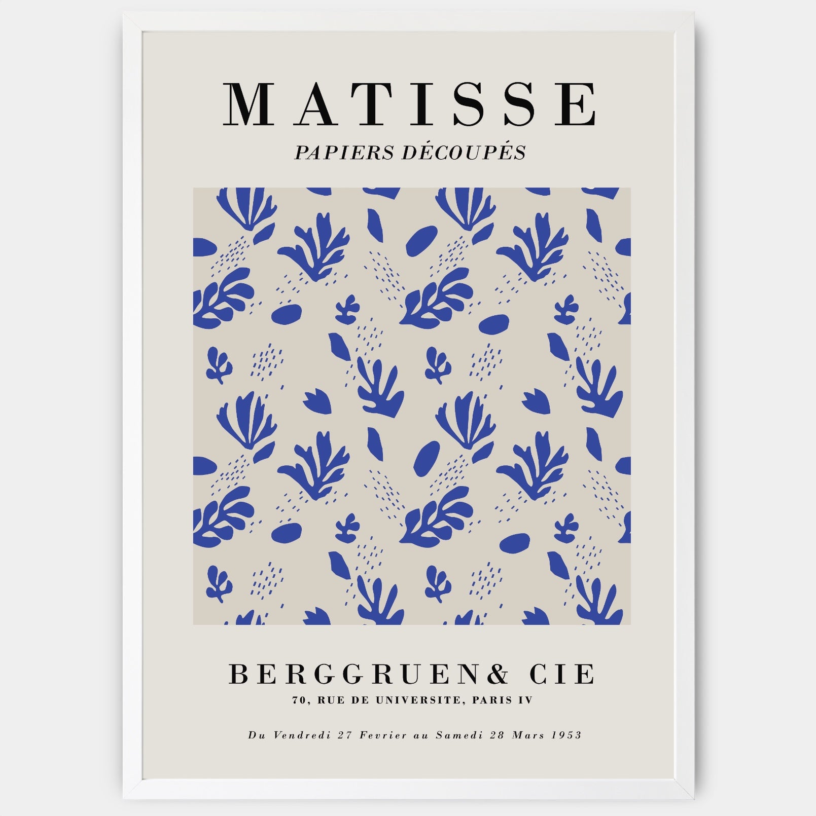 A remake of a 1953 exhibition poster with a floral motif by Henri Matisse. The poster is sold without a frame, with the option to order a thin wooden frame with a thickness of 1.2 cm. There are three color options to choose from - white , black and oak design.