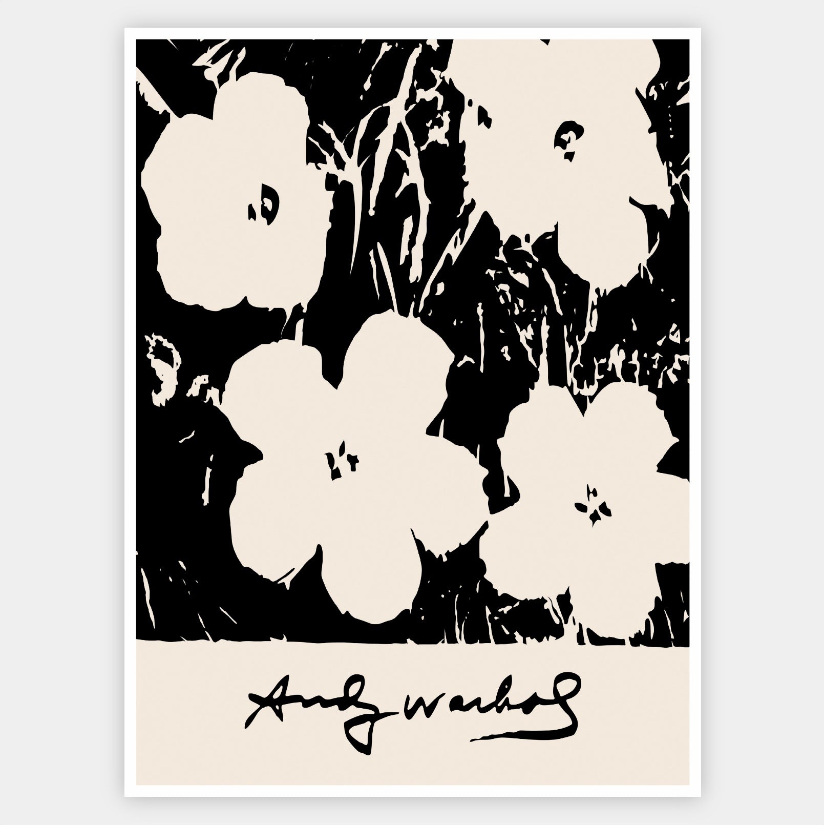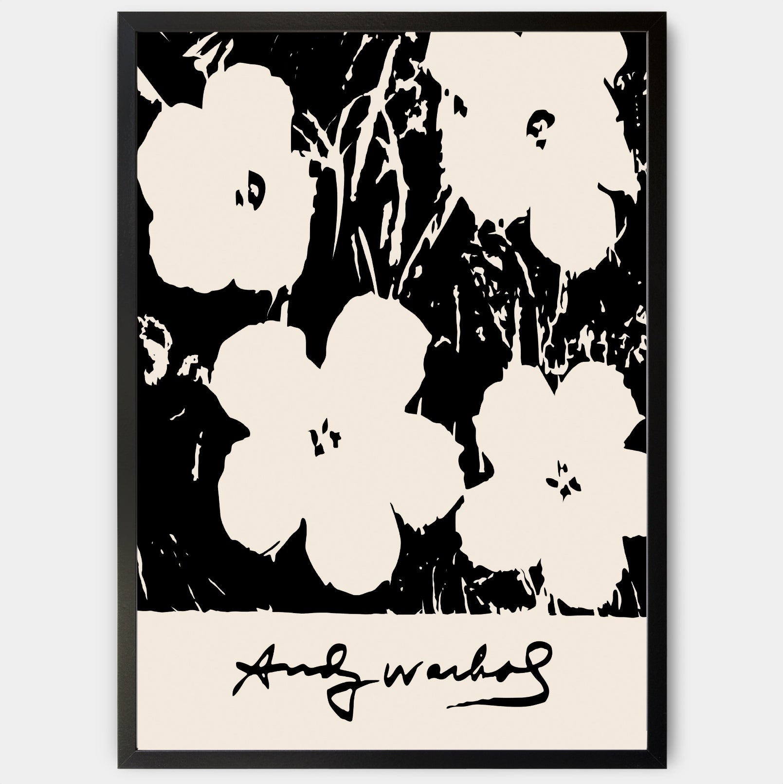 Andy Warhol poster with black and white flower graphics. The poster is sold without a frame, with the option to order a thin wooden frame with a thickness of 1.2 cm. There are three color options to choose from - white , black and oak design.