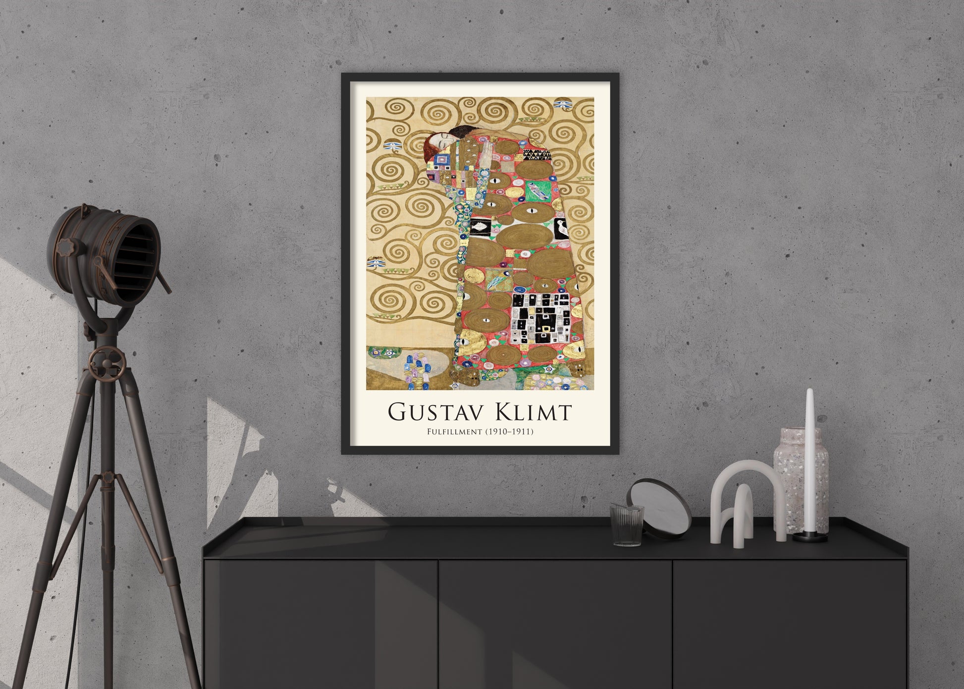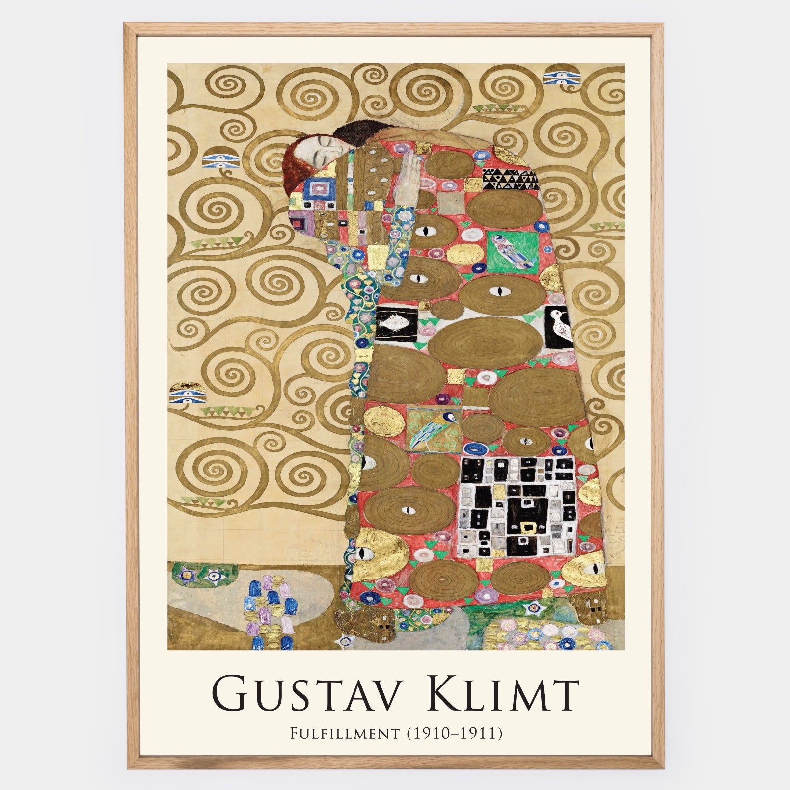 Poster with a motif of the work by Gustav Klimt called "Fulfillment". The poster is sold without a frame, with the option to order a thin wooden frame with a thickness of 1.2 cm. There are three color options to choose from - white , black and oak design.