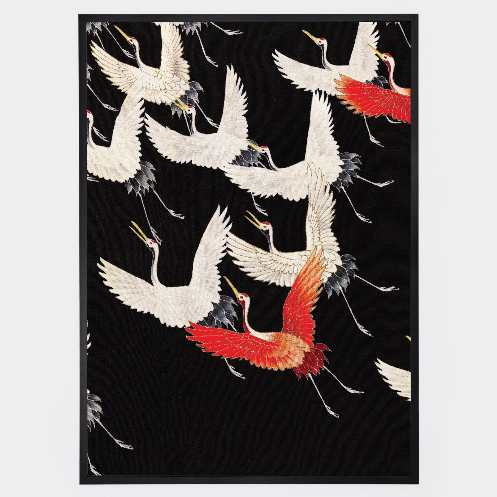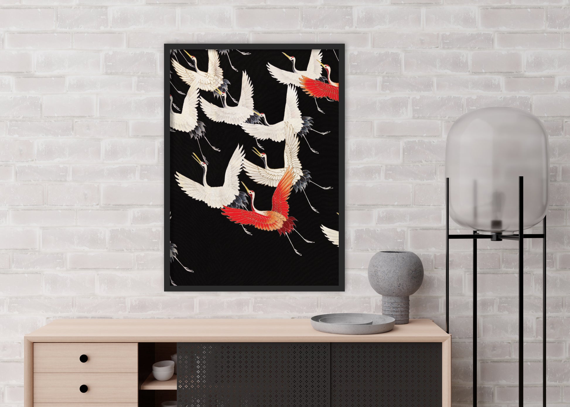 Flying Cranes poster on a black background. The poster is sold without a frame, with the option to order a thin wooden frame with a thickness of 1.2 cm. There are three color options to choose from - white , black and oak design.