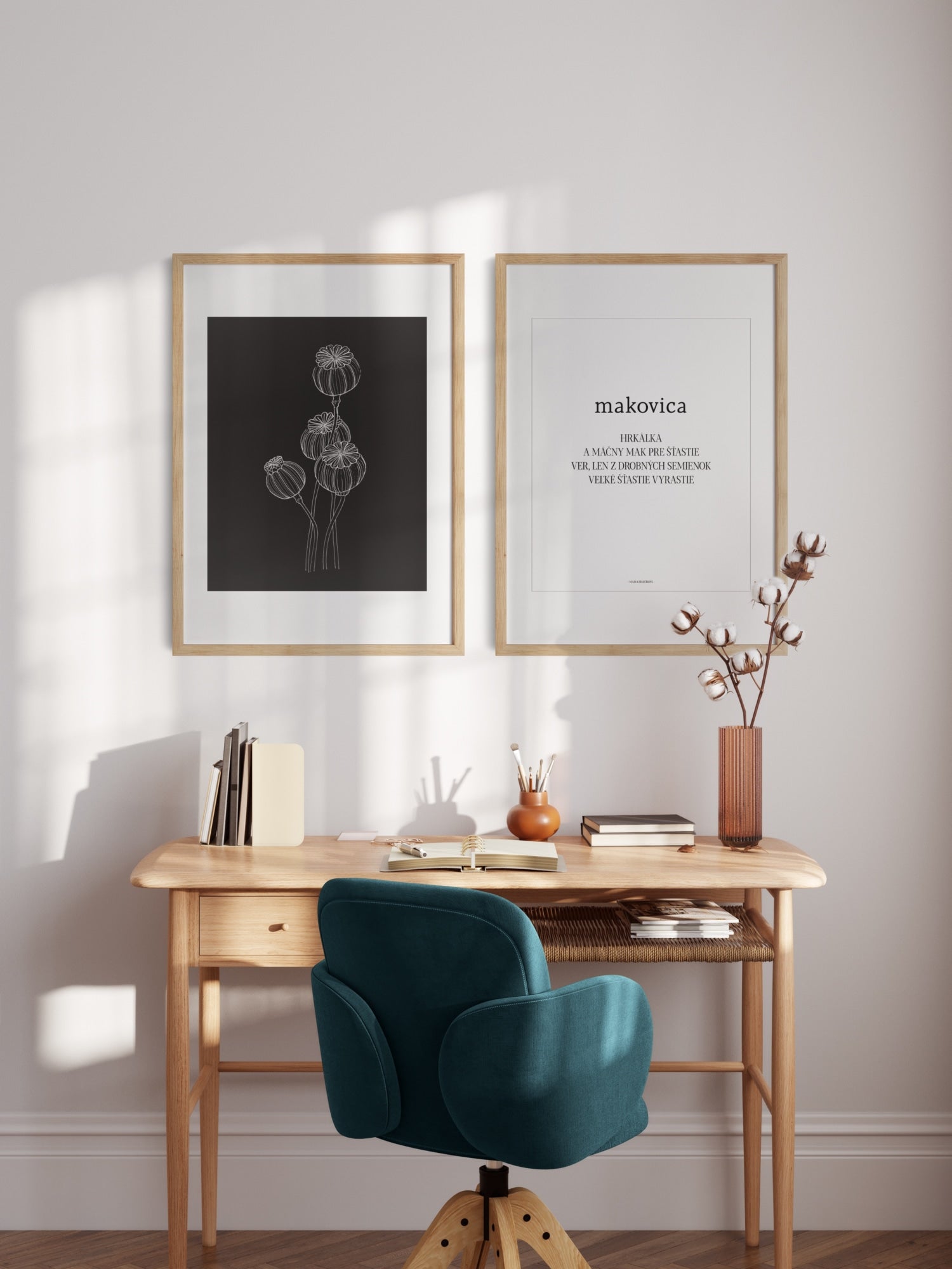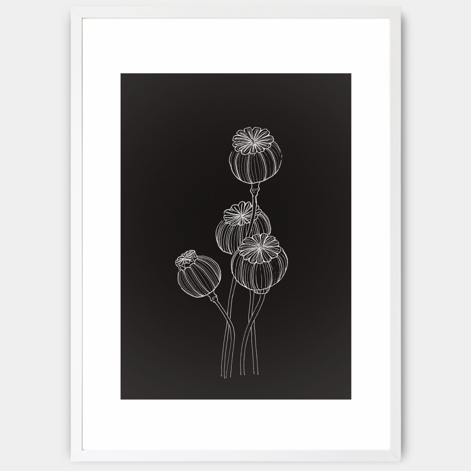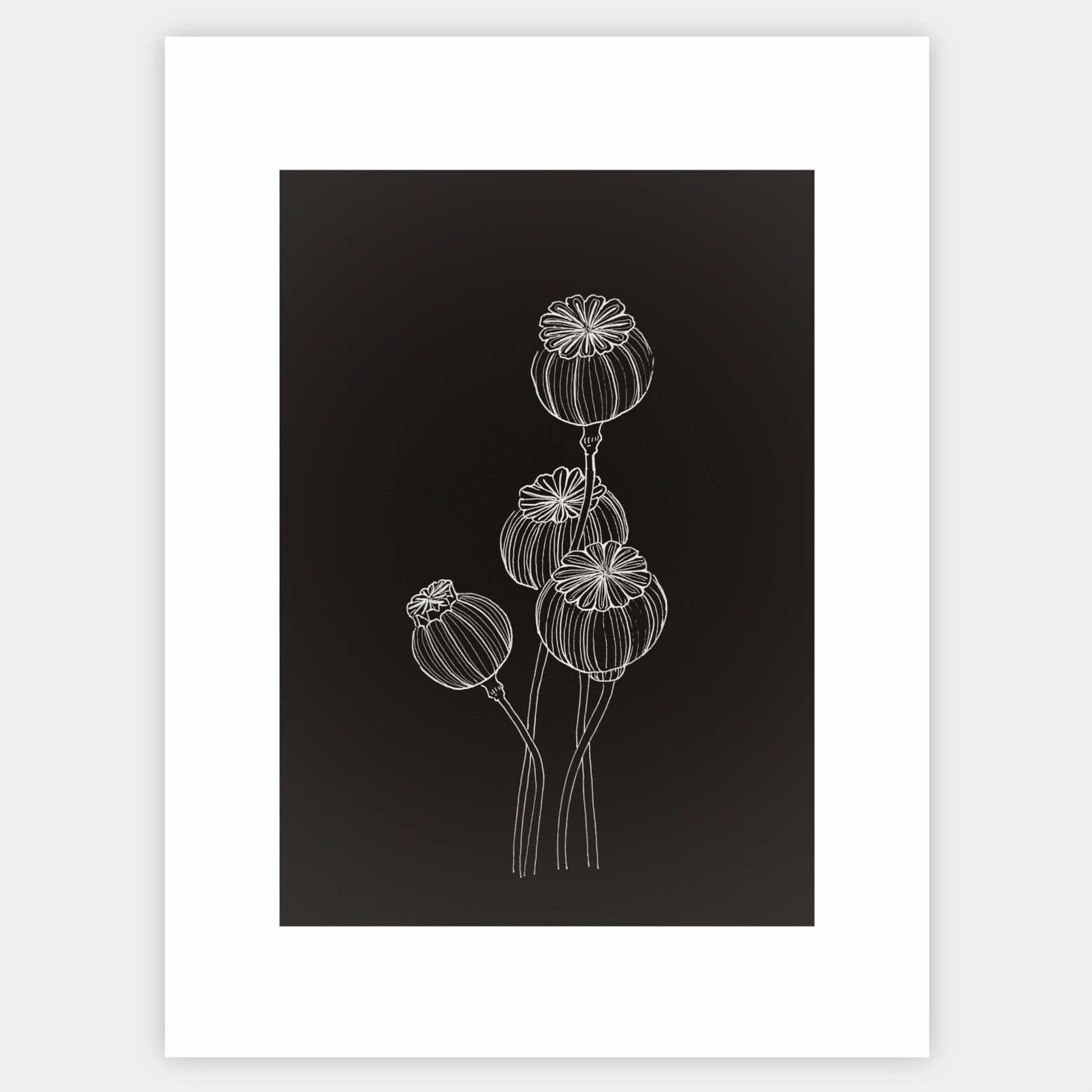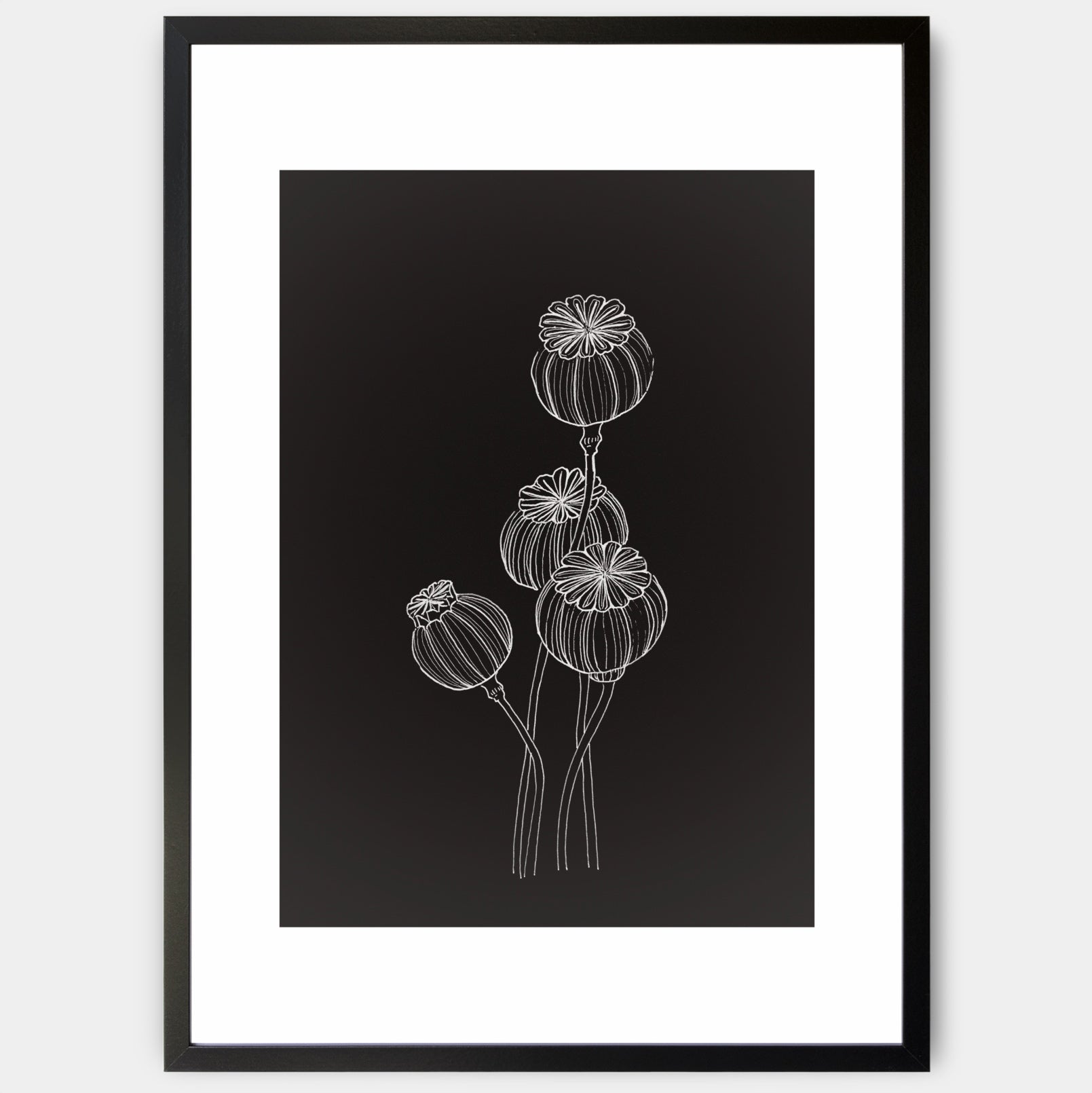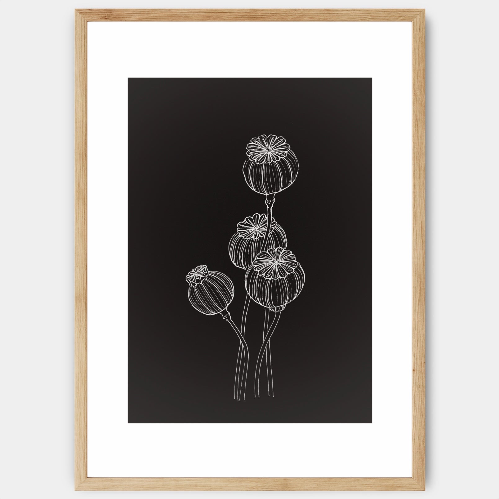 Print with a poppy motif on a black background from the Night and Day collection. An elegant white border is part of the print, designed so that the print can be supplemented with a standard mount. The poster is sold without a frame, with the option to order a thin wooden frame with a thickness of 1.2 cm. There are three color options to choose from - white , black and oak design.