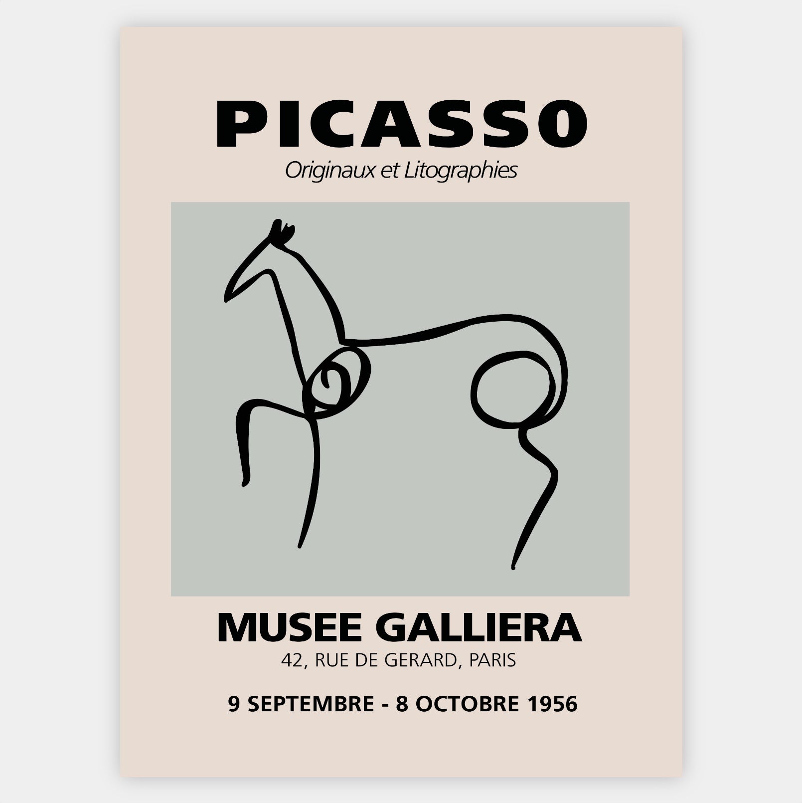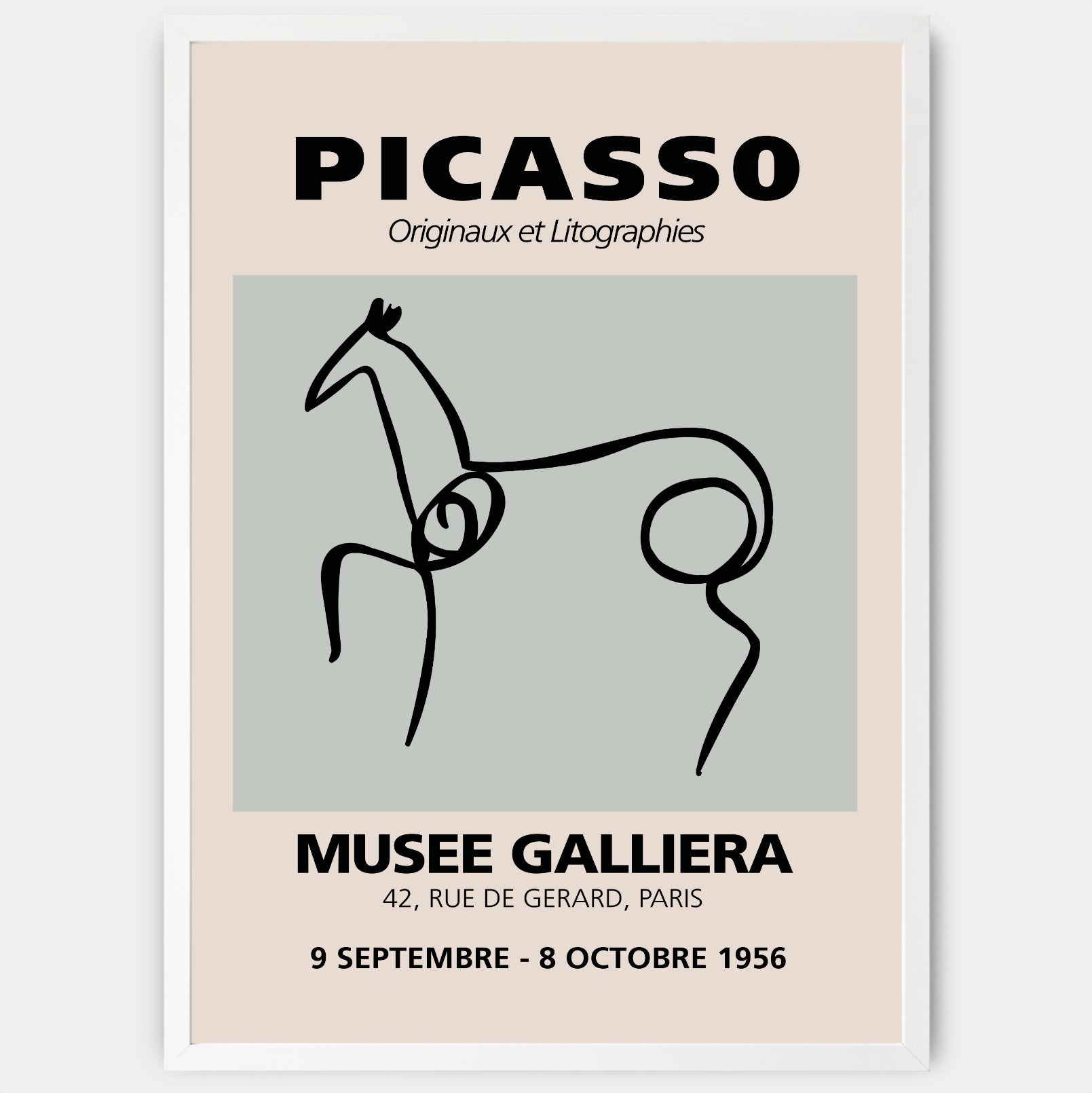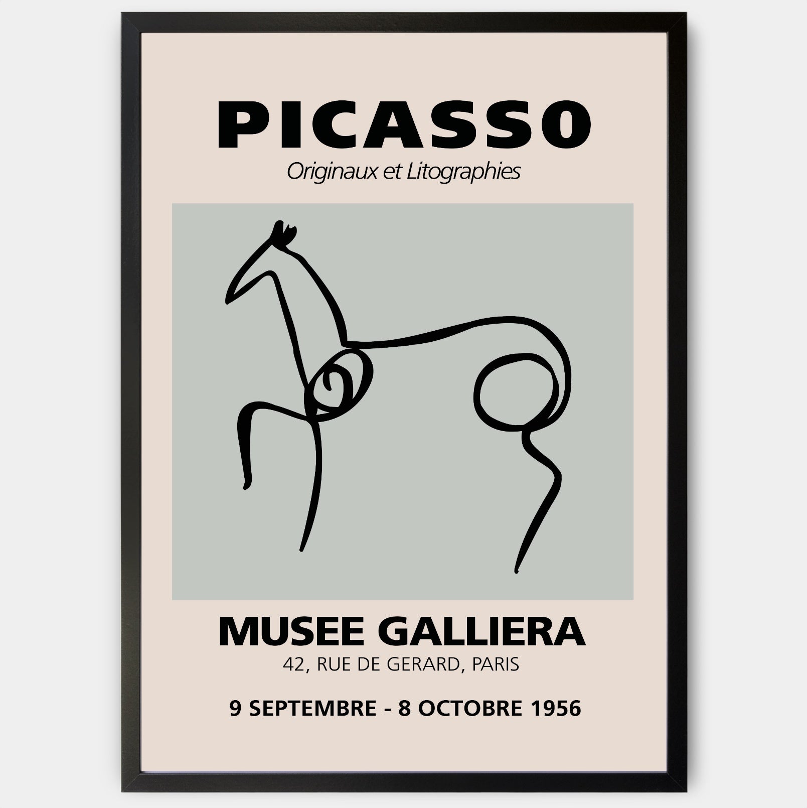Exhibition poster with a minimalist horse drawing by Pablo Picasso from 1956. The poster is sold without a frame, with the option to order a thin wooden frame with a thickness of 1.2 cm. There are three color options to choose from - white , black and oak design.
