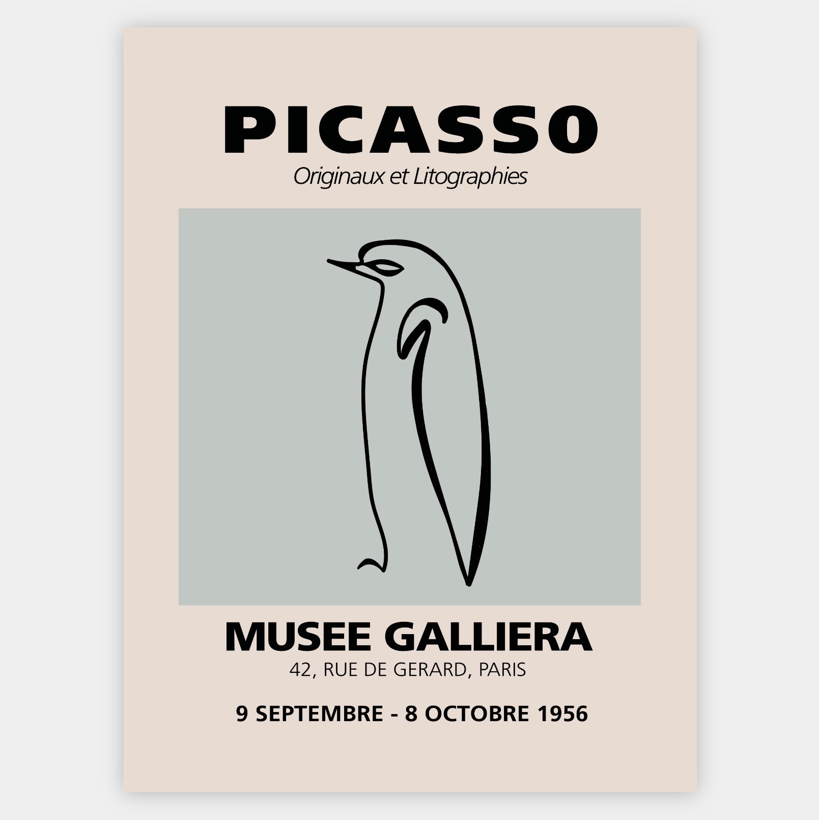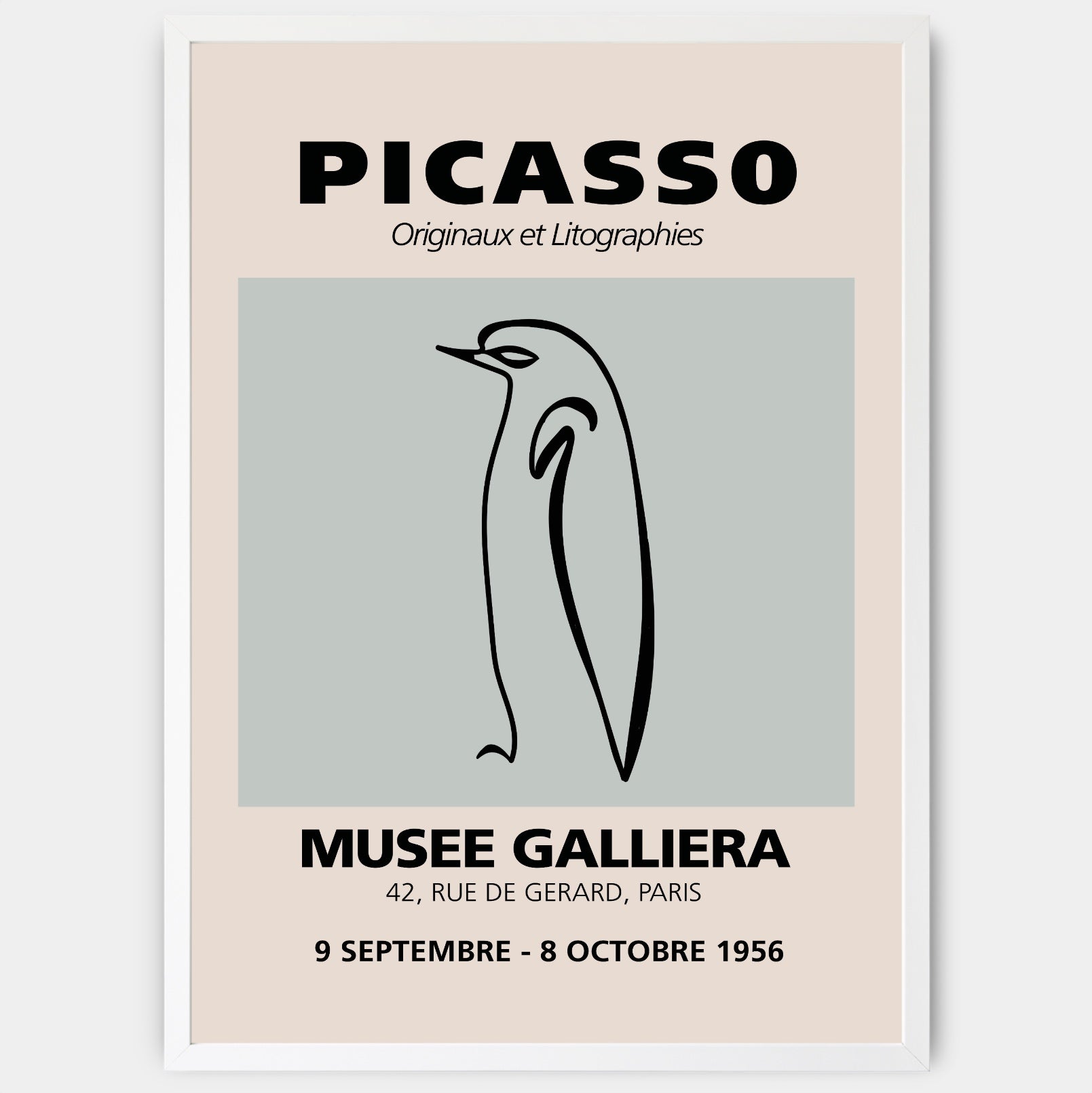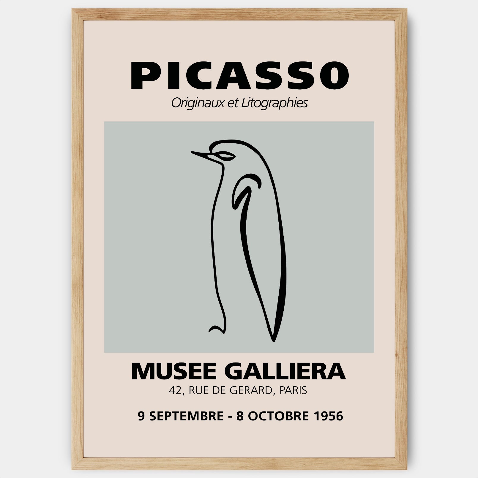 Exhibition poster with a minimalist penguin drawing by Pablo Picasso from 1956. The poster is sold without a frame, with the option to order a thin wooden frame with a thickness of 1.2 cm. There are three color options to choose from - white , black and oak design.