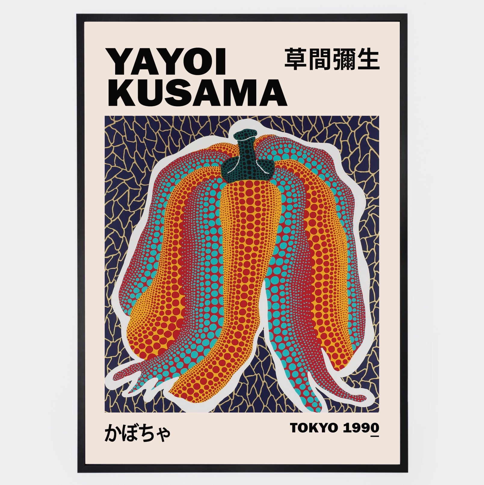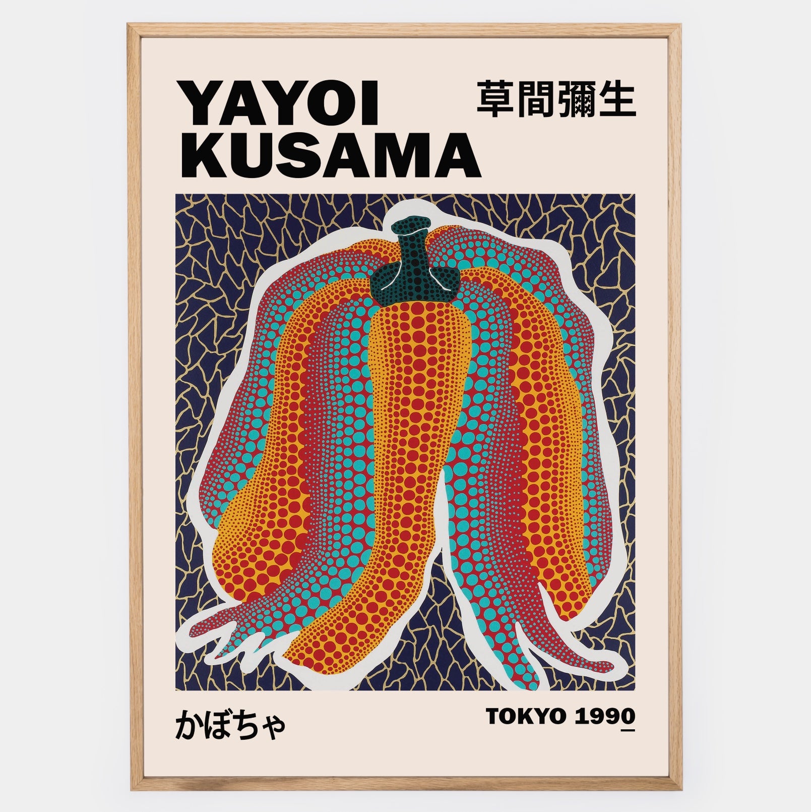 Pumpkin-themed poster by Yayoi Kusama. The poster is sold without a frame, with the option to order a thin wooden frame with a thickness of 1.2 cm. There are three color options to choose from - white , black and oak design.