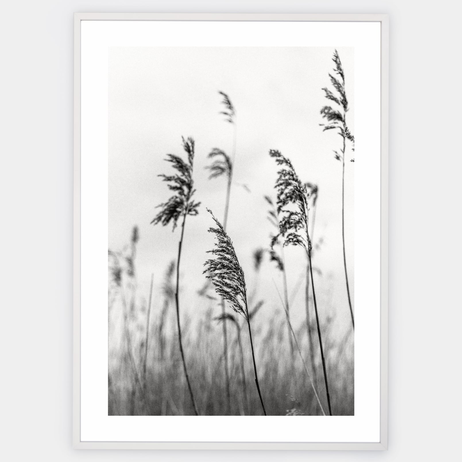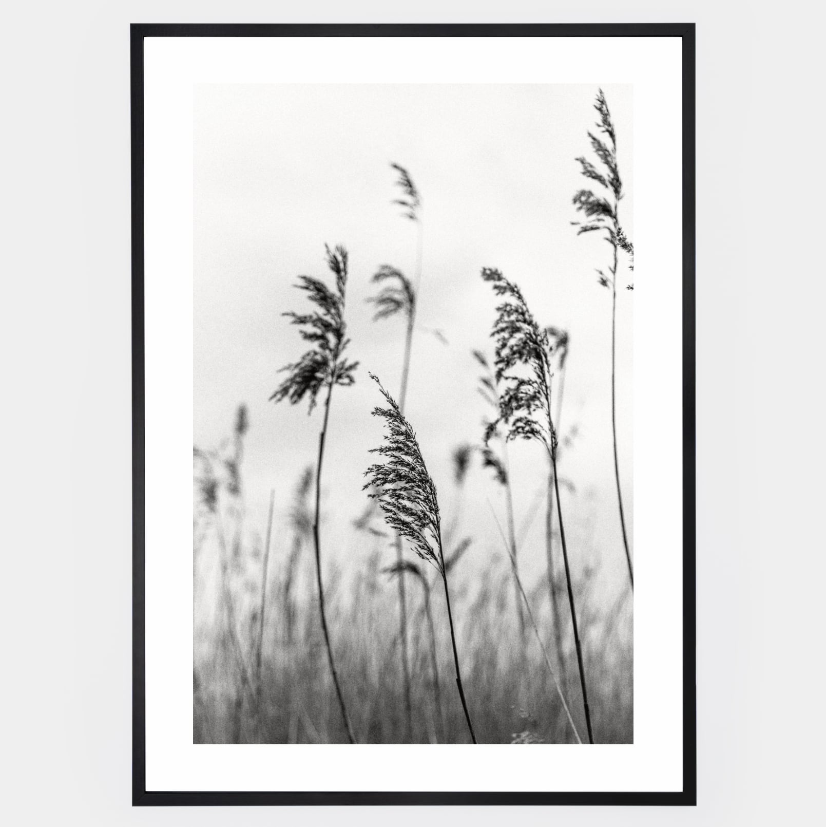 Poster with a black and white photograph of flowering grass. An elegant white border is part of the print. The poster is sold without a frame, with the option to order a thin wooden frame with a thickness of 1.2 cm. There are three color options to choose from - white , black and oak design.