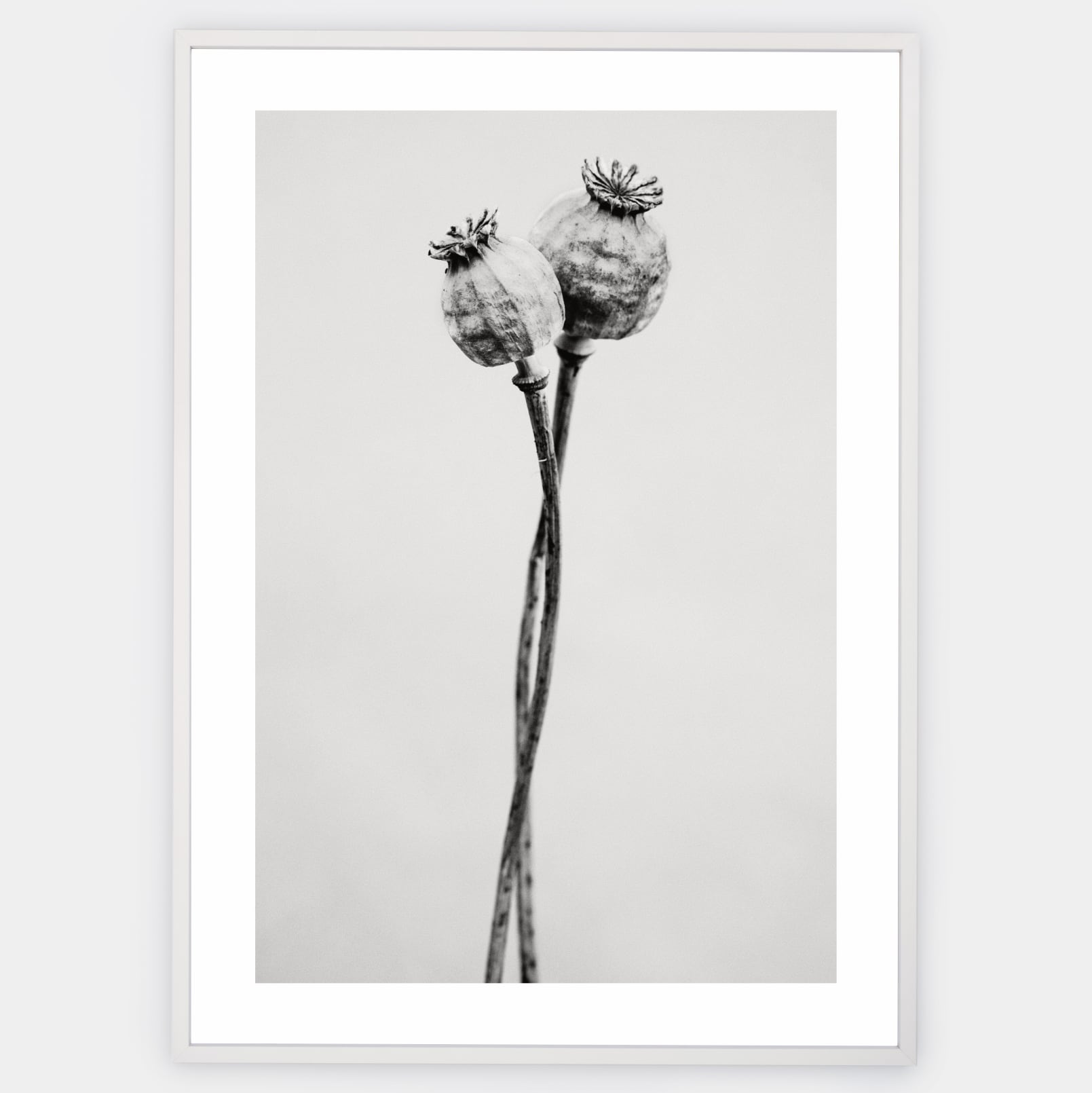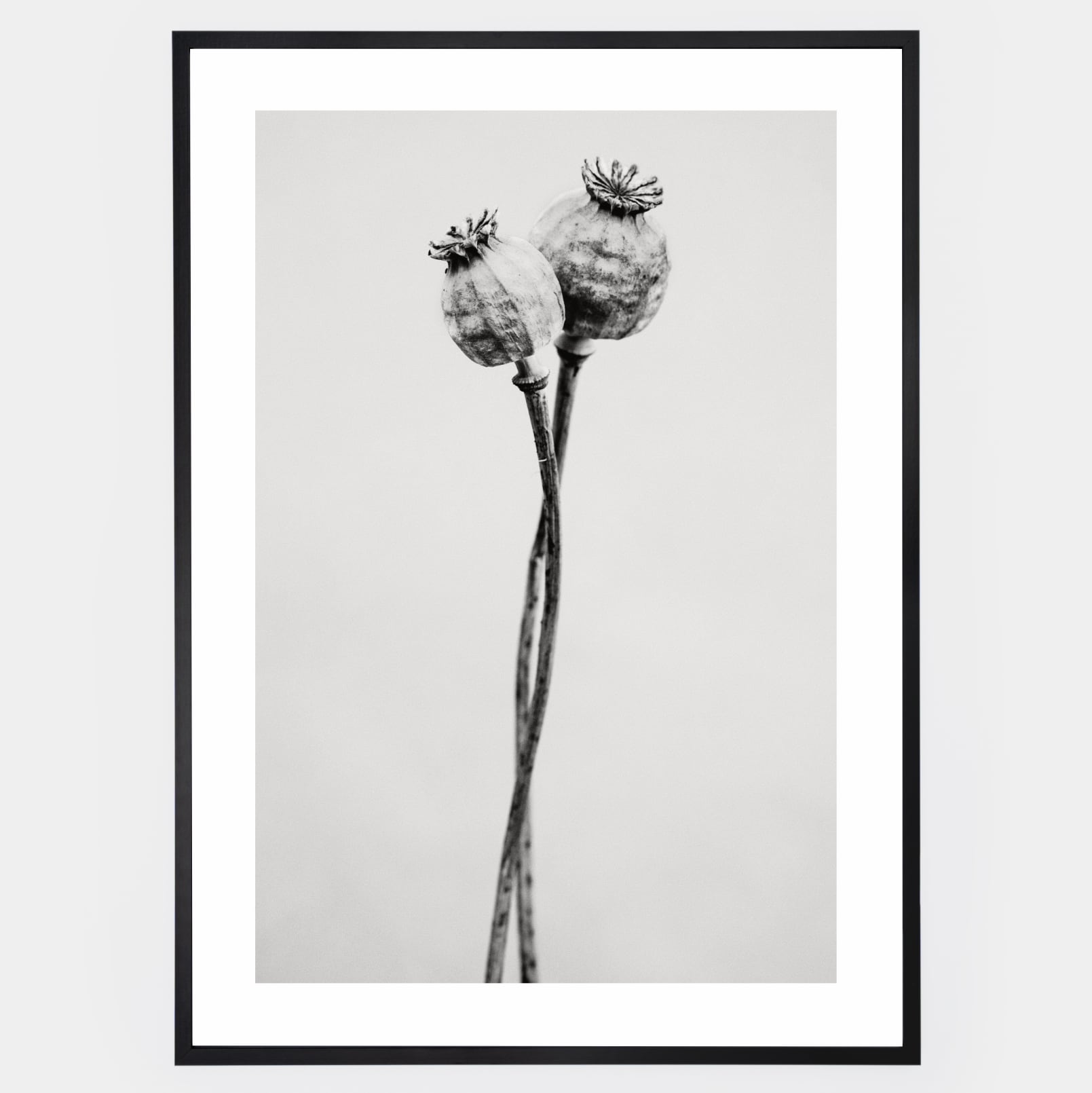 Poster with a black and white photo of two poppies. An elegant white border is part of the print. The poster is sold without a frame, with the option to order a thin wooden frame with a thickness of 1.2 cm. There are three color options to choose from - white , black and oak design.