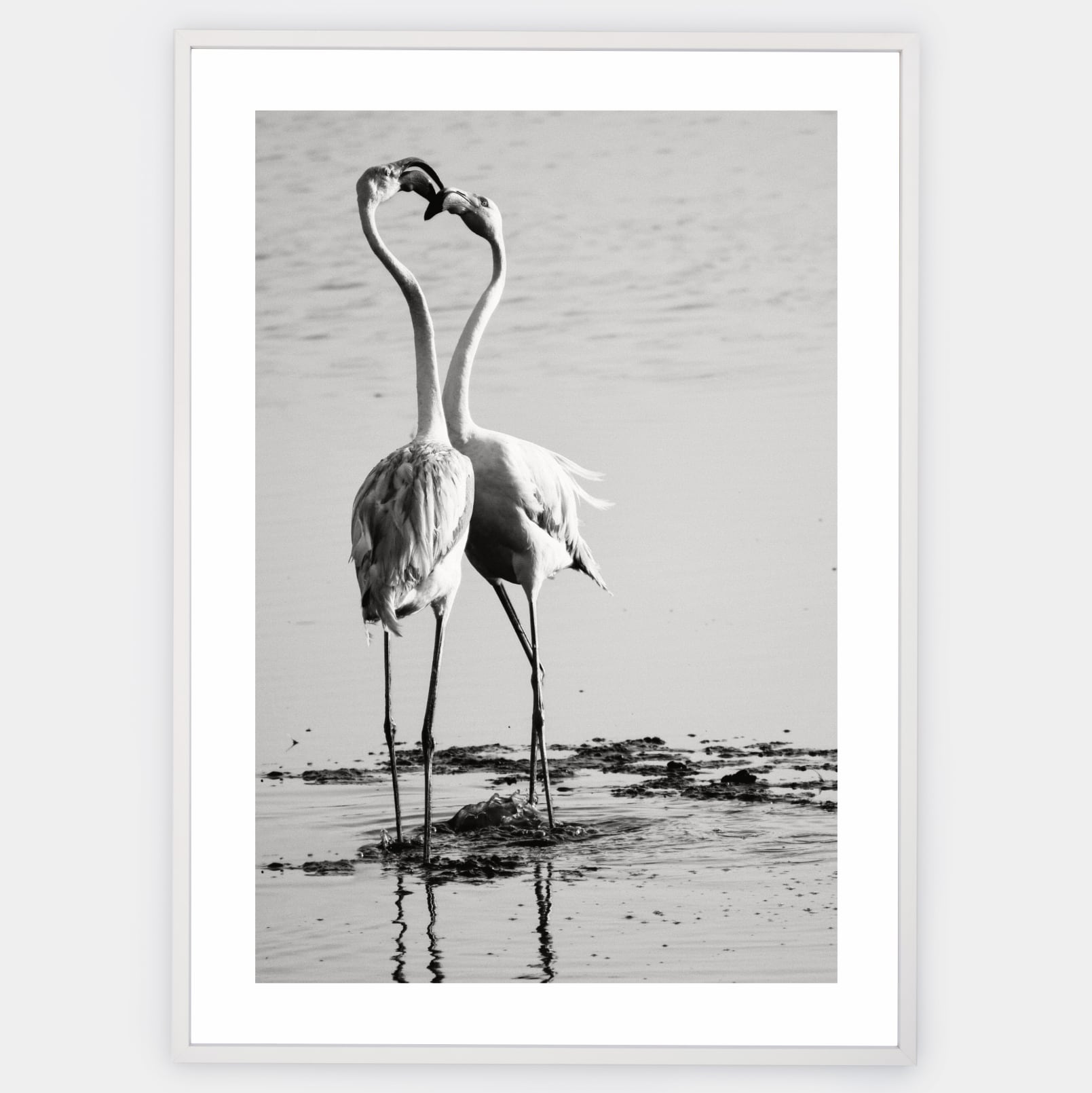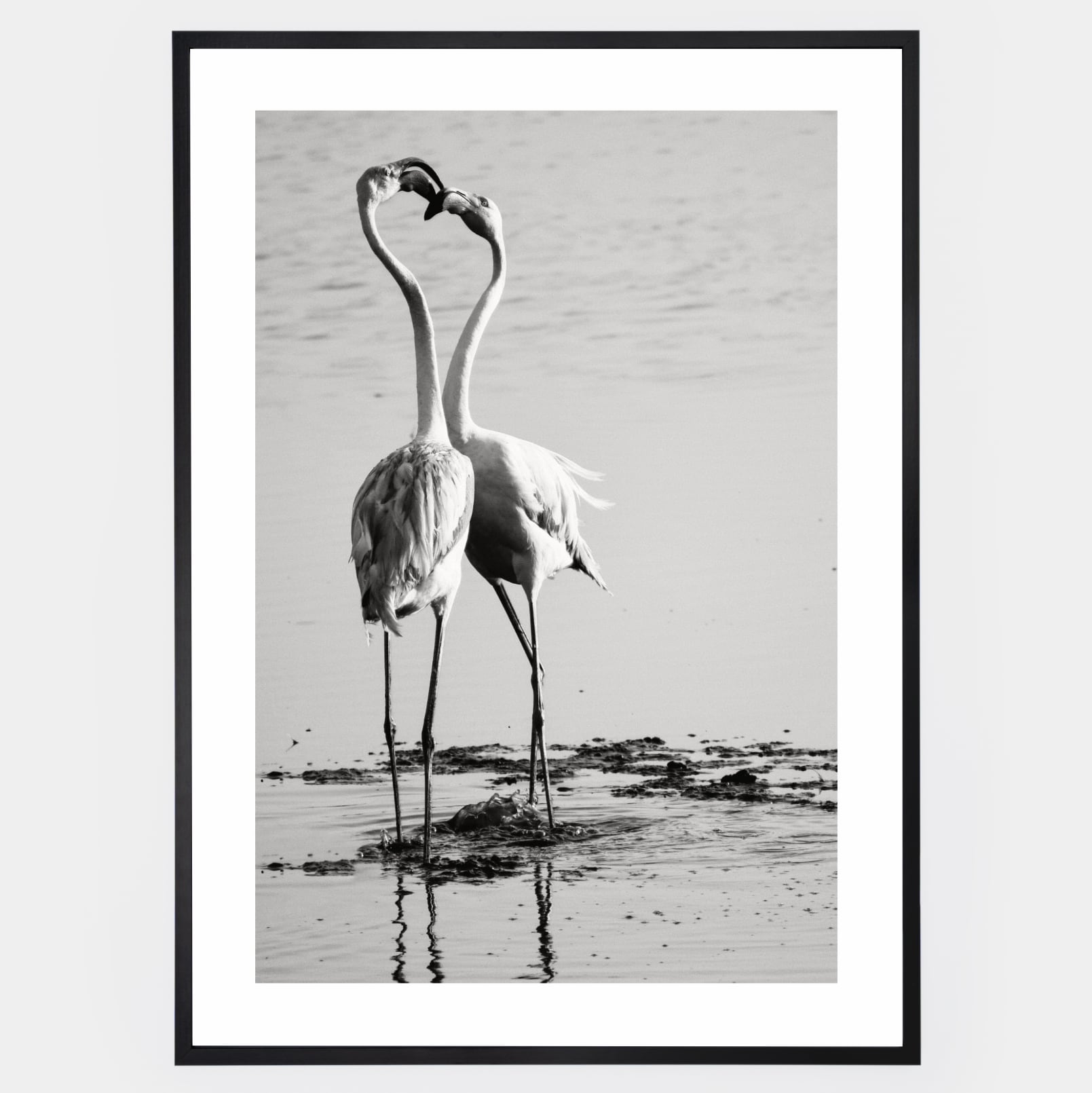 Poster with a black and white photo of flamingos. An elegant white border is part of the print. The poster is sold without a frame, with the option to order a thin wooden frame with a thickness of 1.2 cm. There are three color options to choose from - white , black and oak design.