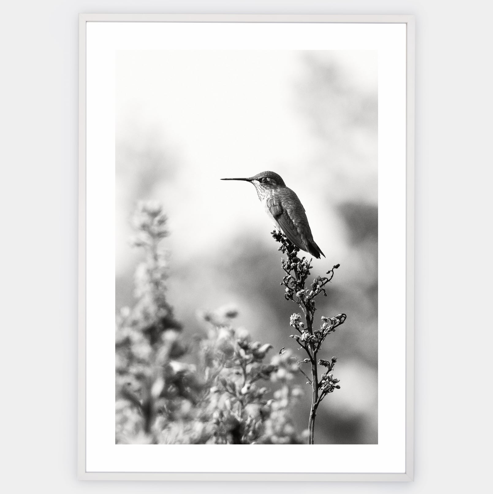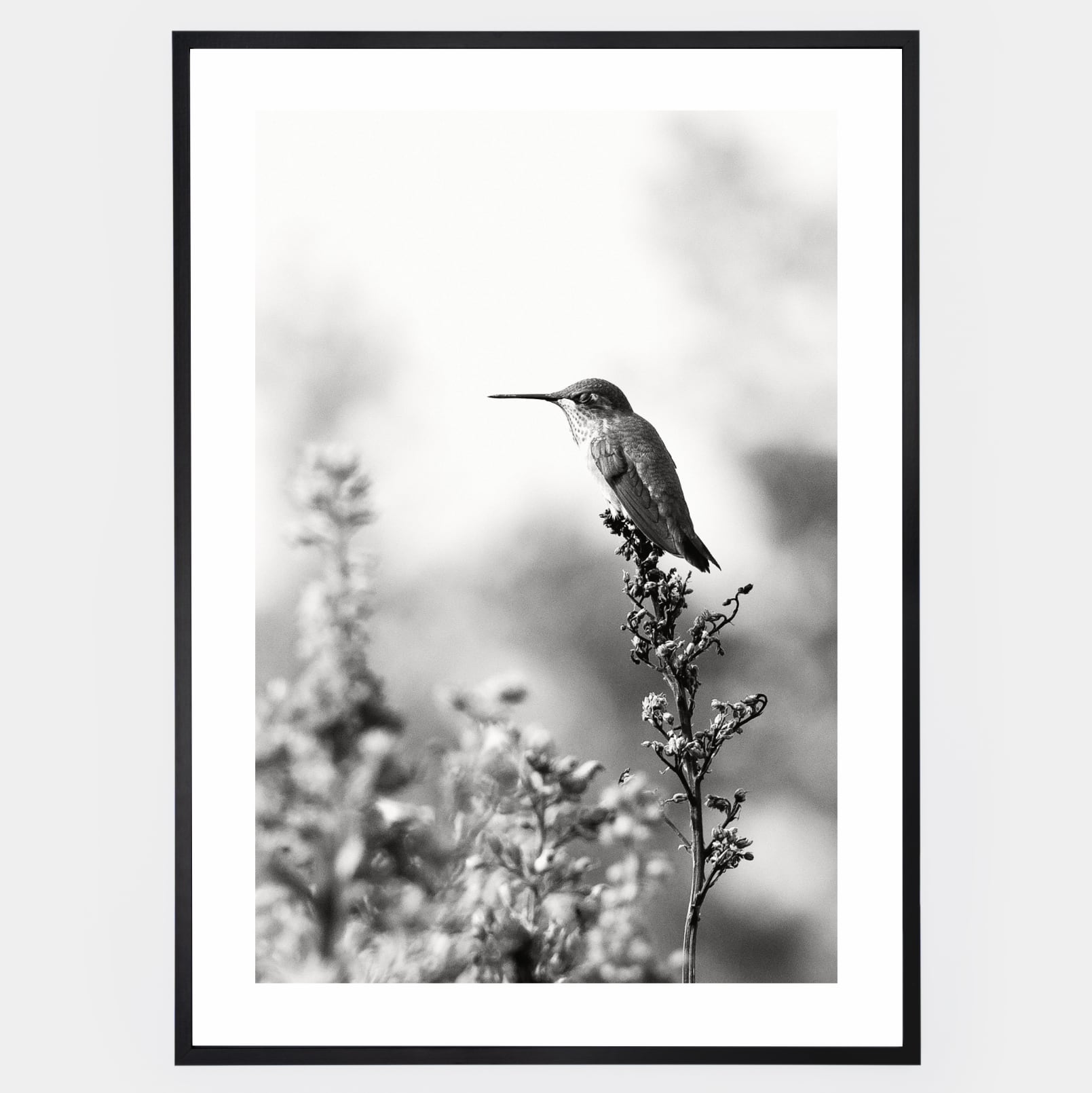 Poster with a black and white photo of a hummingbird. An elegant white border is included in the print. The poster is sold without a frame, with the option to order a thin wooden frame with a thickness of 1.2 cm. There are three color options to choose from - white , black and oak design.