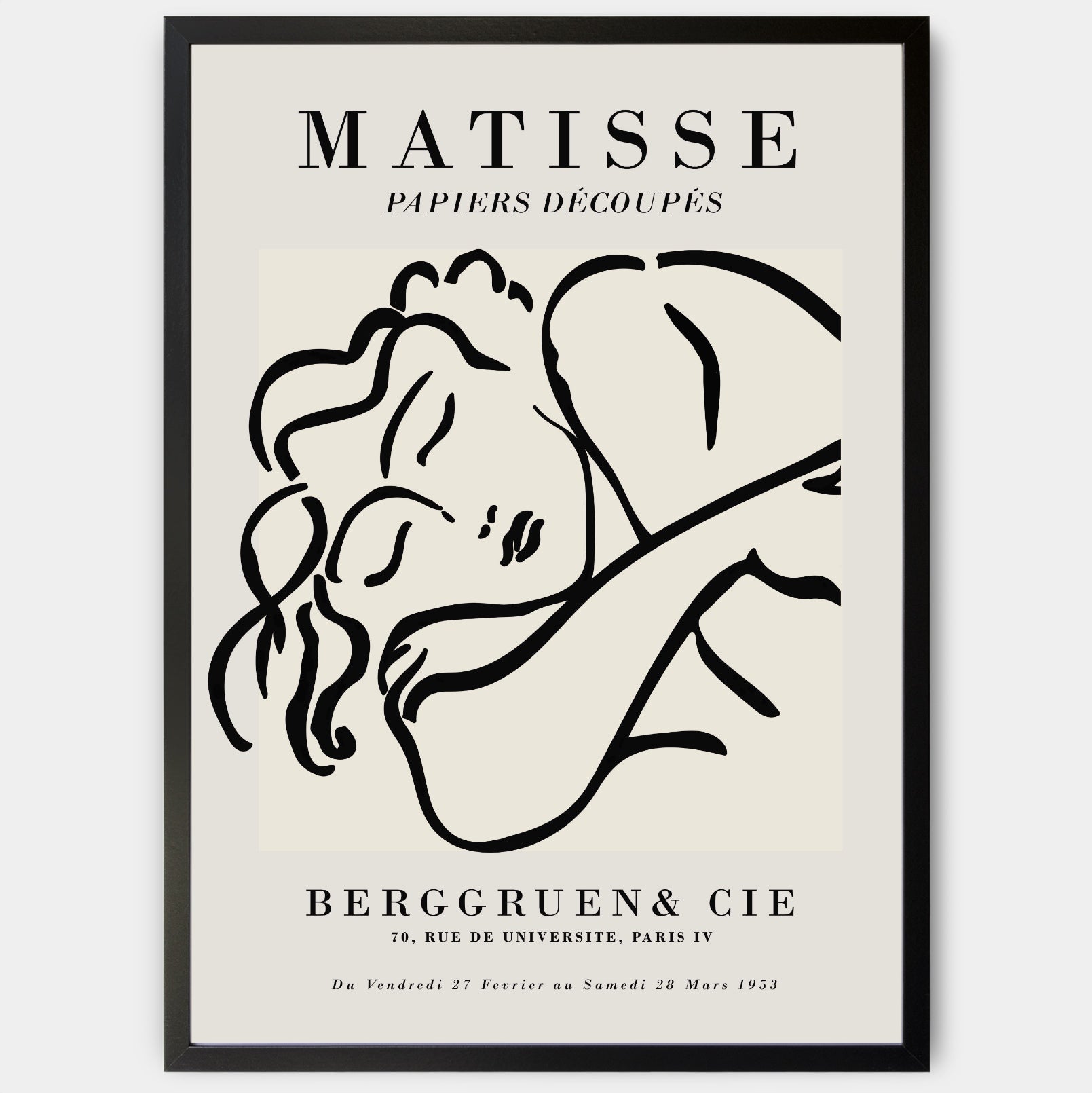 Exhibition poster with the motif of Henri Matisse's Sleeping Woman Sketch in gray from 1953. The poster is sold without a frame, with the option to order a thin wooden frame with a thickness of 1.2 cm. There are three color options to choose from - white , black and oak design.