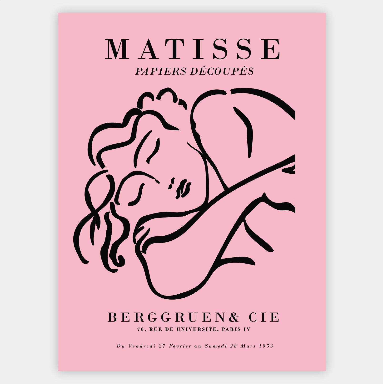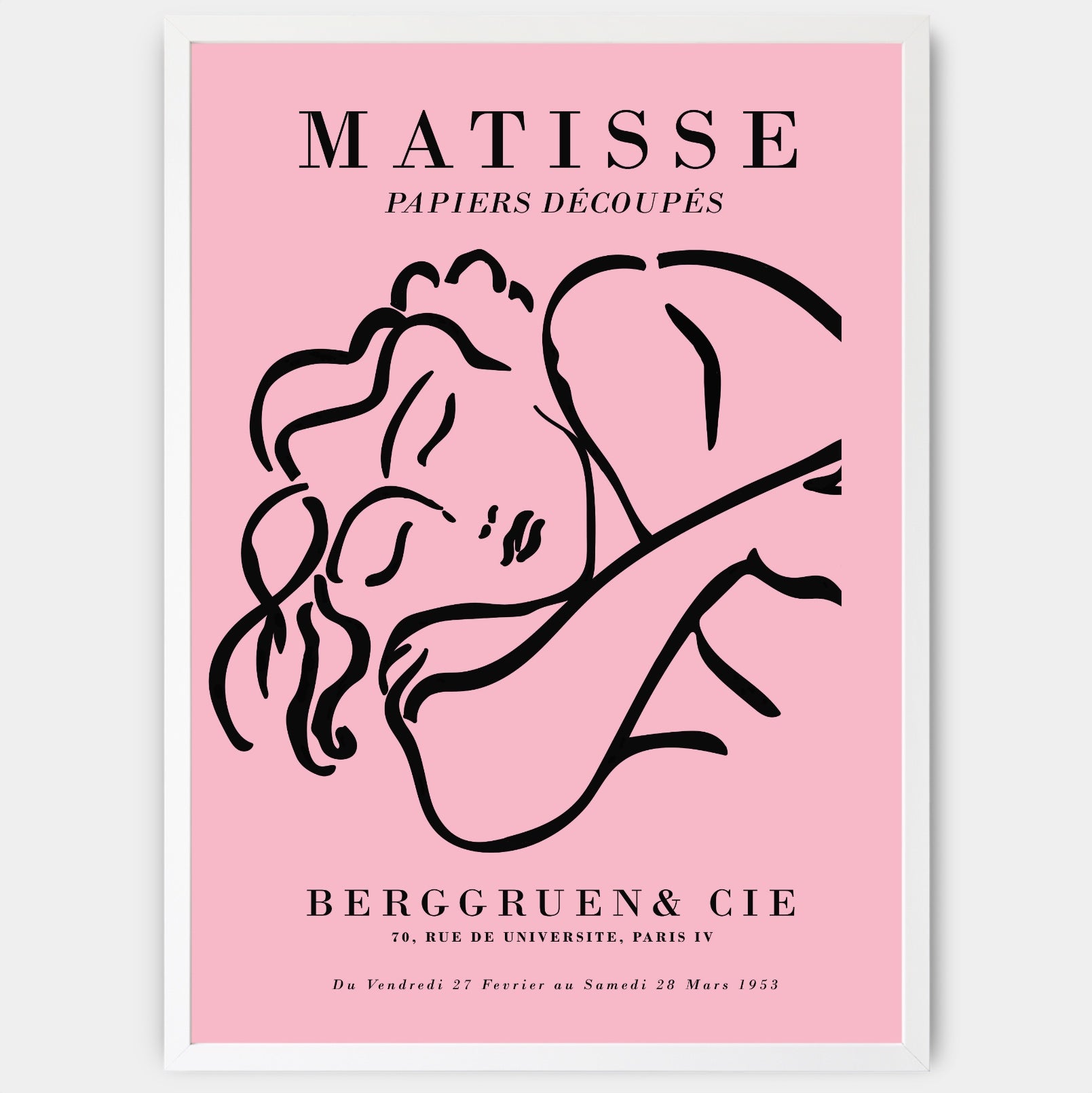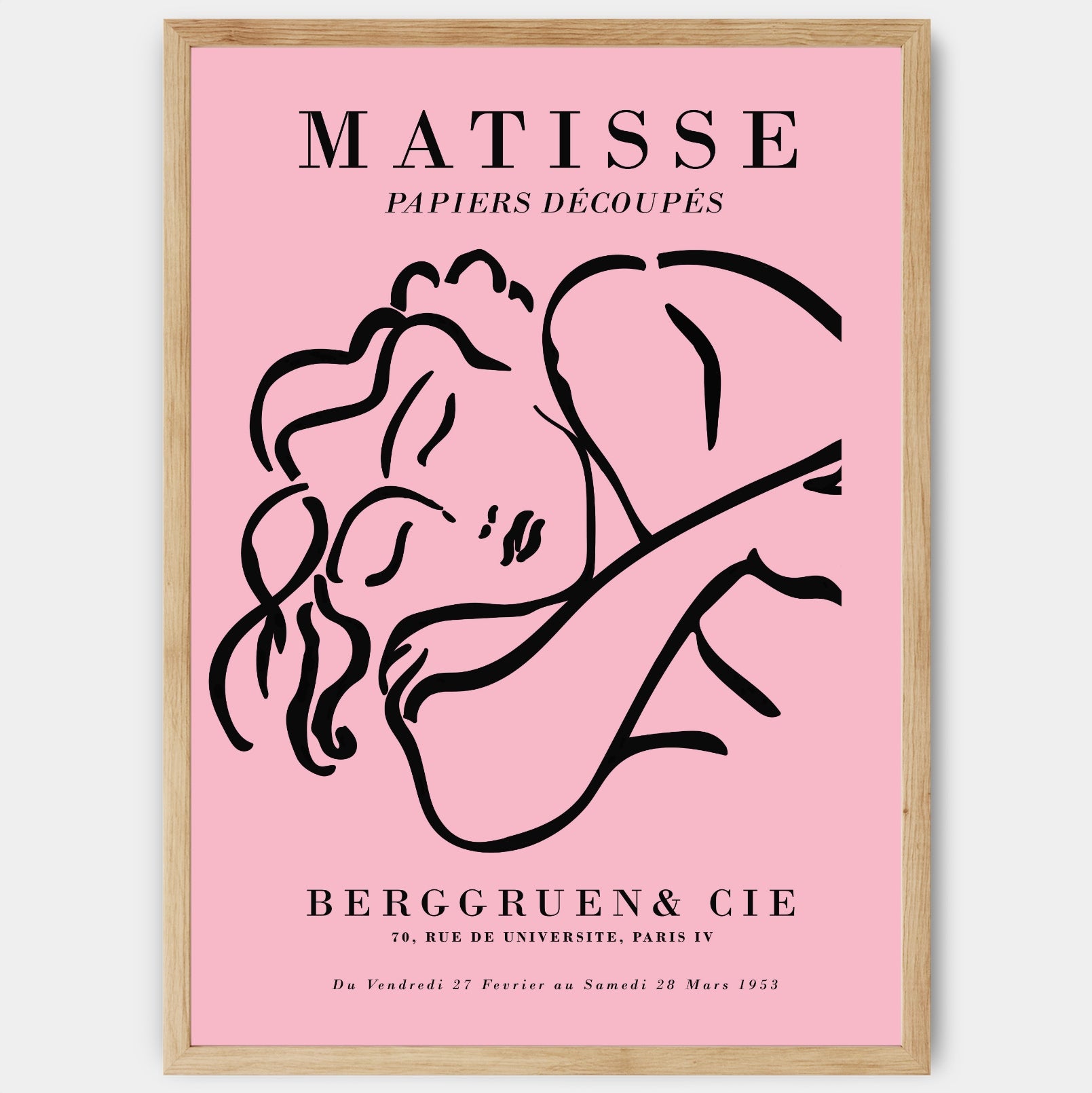 Exhibition poster with the motif of Henri Matisse's Sleeping Woman Sketch in pink from 1953. The poster is sold without a frame, with the option to order a thin wooden frame with a thickness of 1.2 cm. There are three color options to choose from - white , black and oak design.