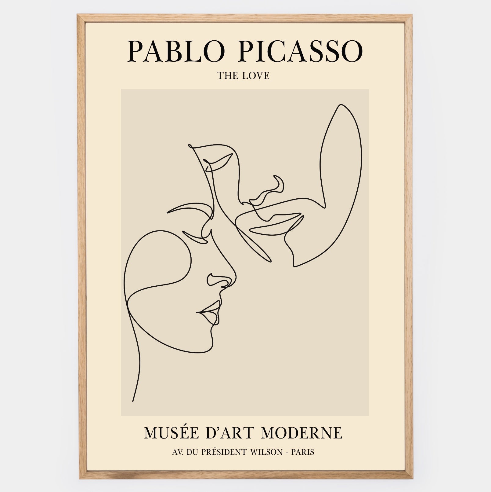 A poster of a minimalist drawing of touching faces based on a motif by Pablo Picasso. The poster is sold without a frame, with the option to order a thin wooden frame with a thickness of 1.2 cm. There are three color options to choose from - white , black and oak design.