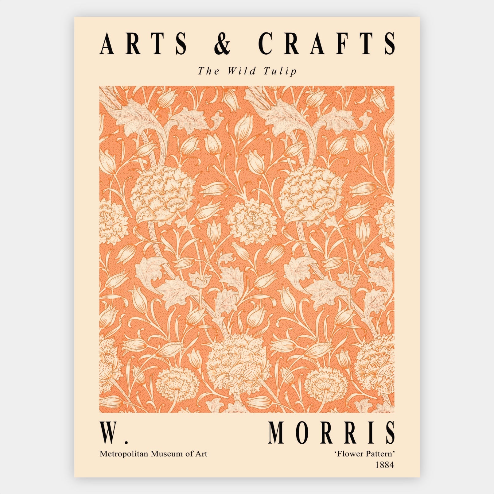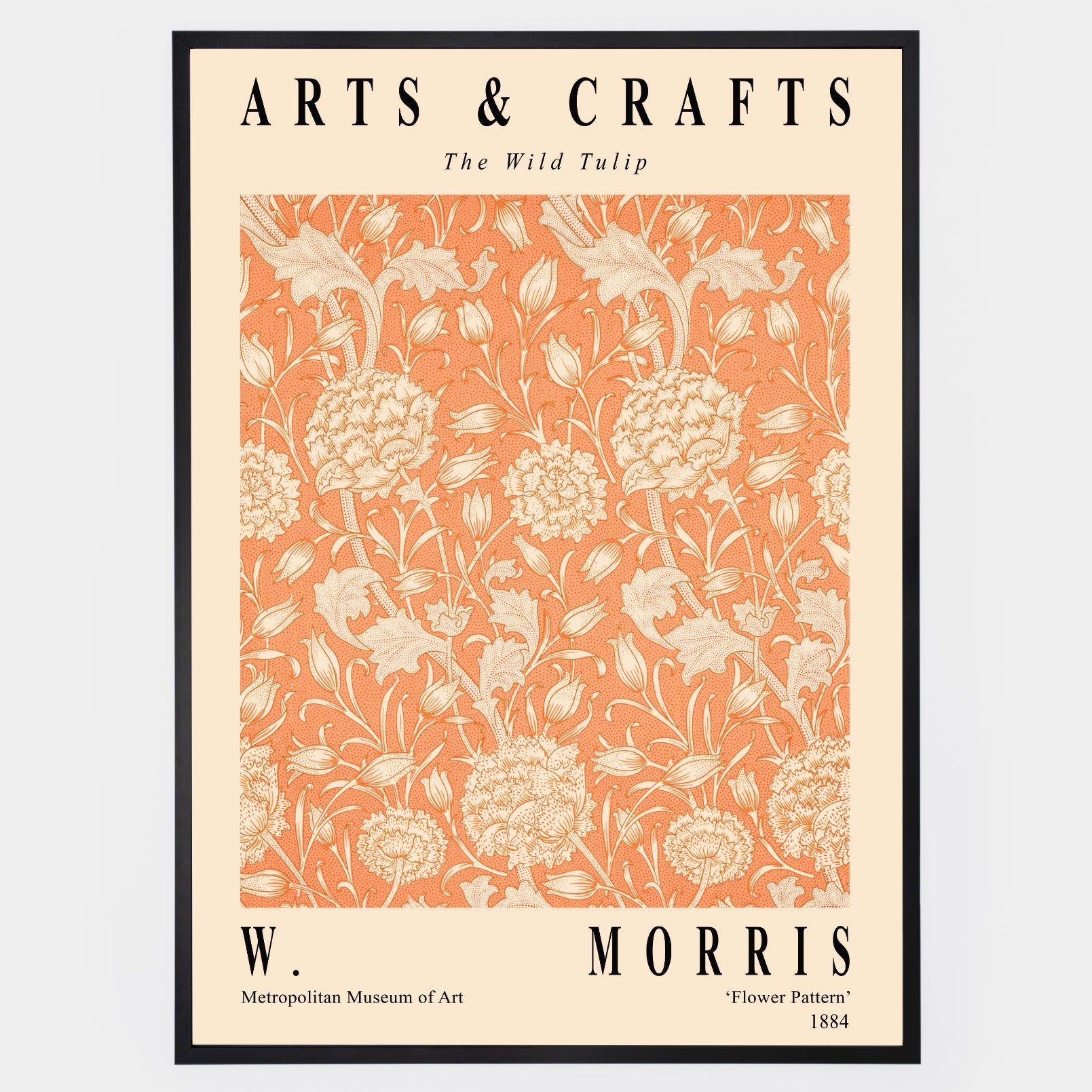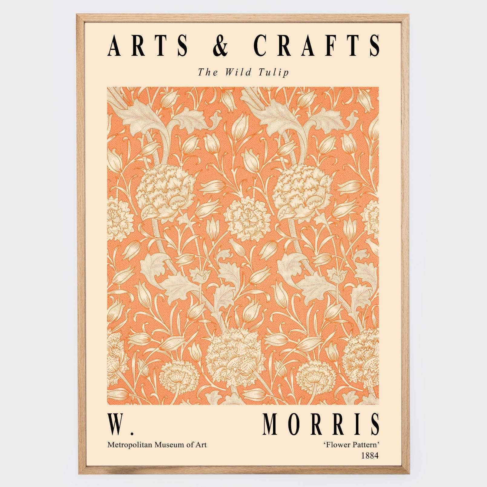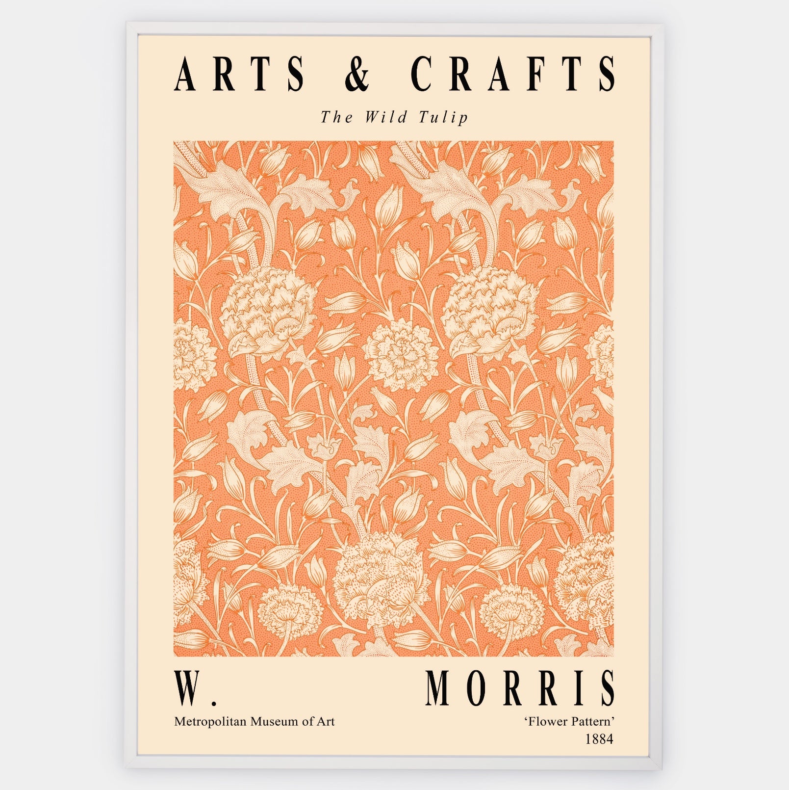 A poster inspired by a William Morris pattern with wild tulip flowers. The poster is sold without a frame, with the option to order a thin wooden frame with a thickness of 1.2 cm. There are three color options to choose from - white , black and oak design.