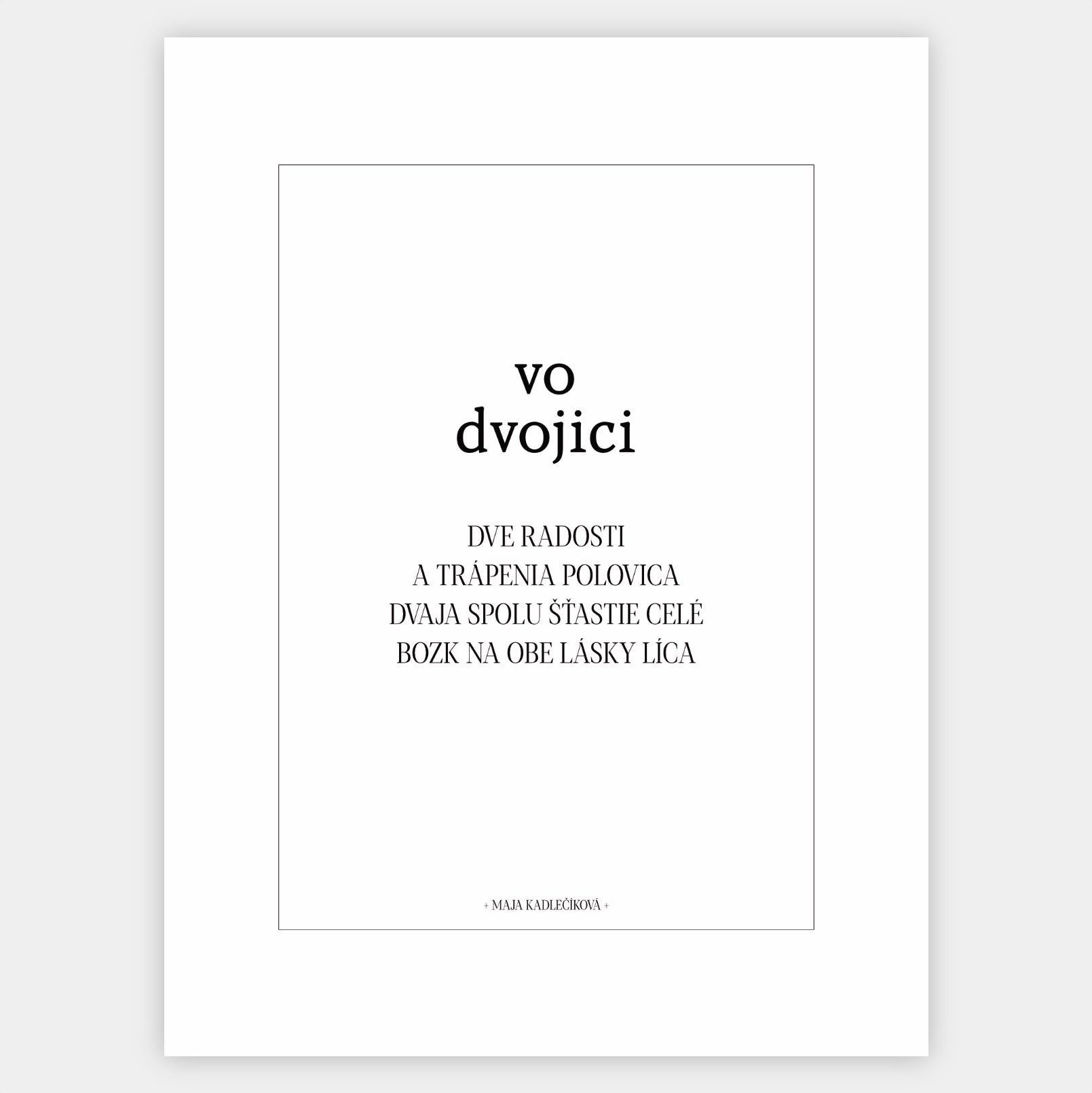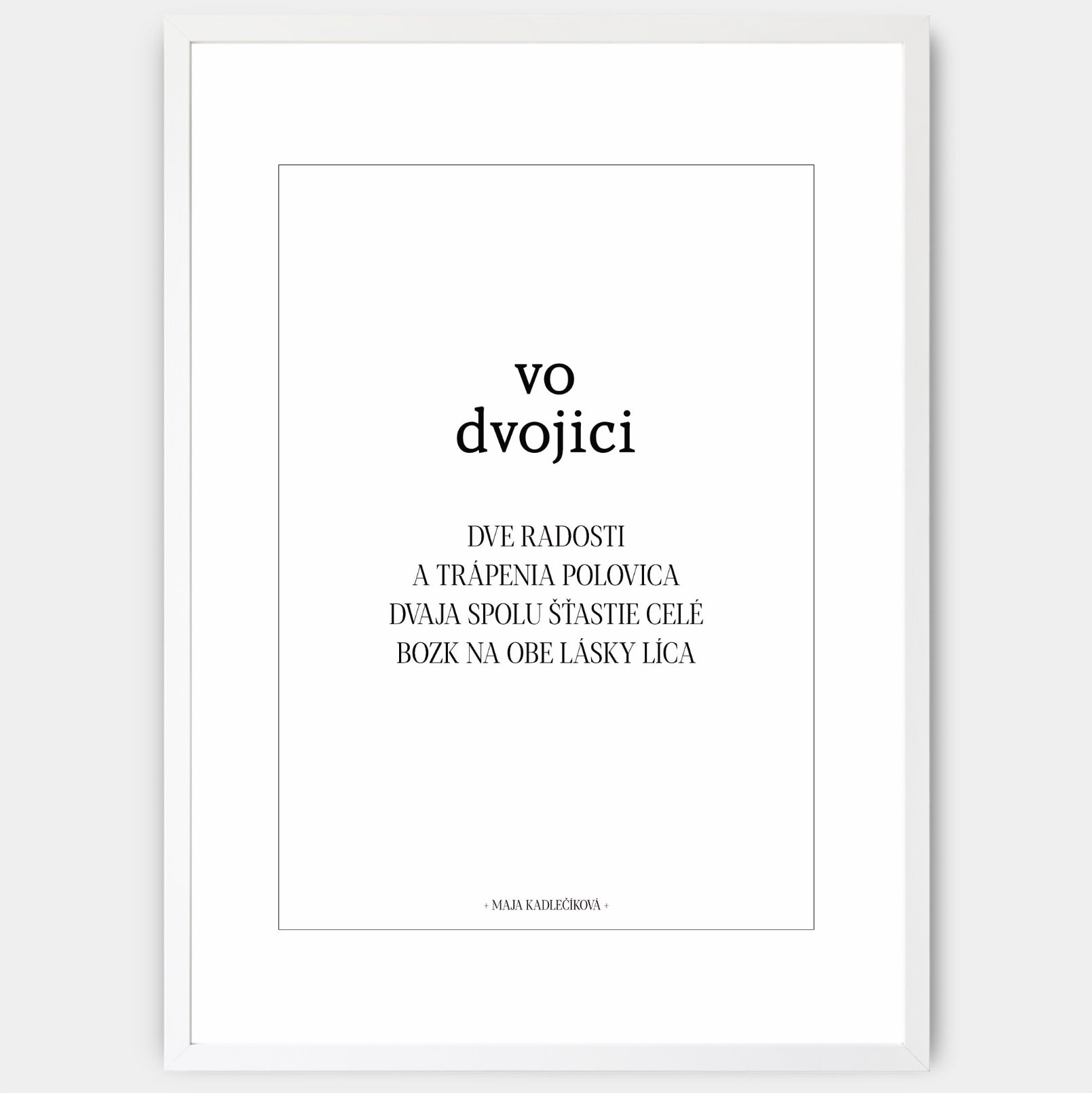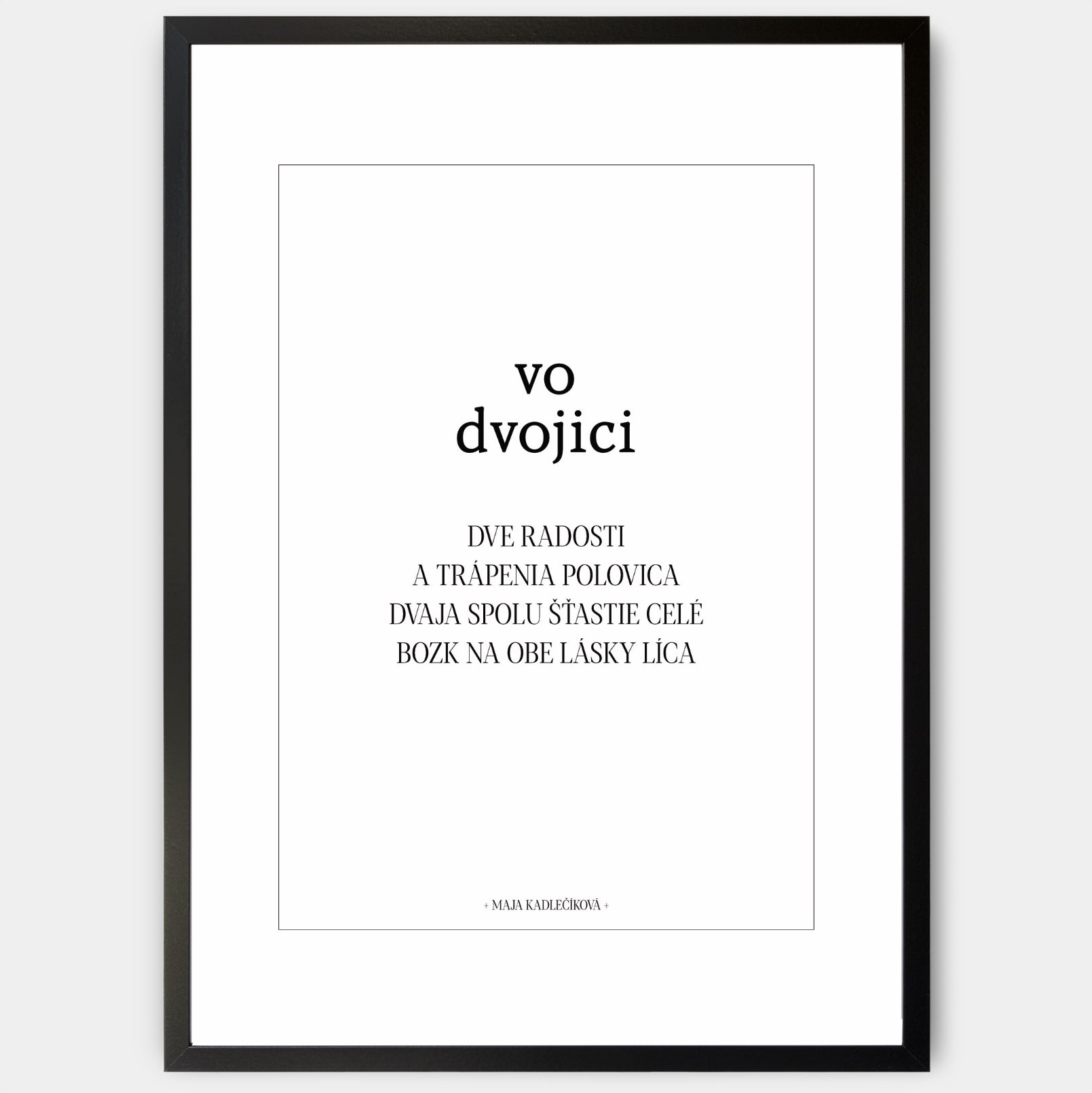 The poster with the poem "In Pairs" from the Night and Day collection is complemented by a poster of the same name with the visual of two leaves . It is designed so that it can be supplemented with a standard passe-partout. The poster is sold without a frame, with the option to order a thin wooden frame with a thickness of 1.2 cm. There are three color options to choose from - white , black and oak design.