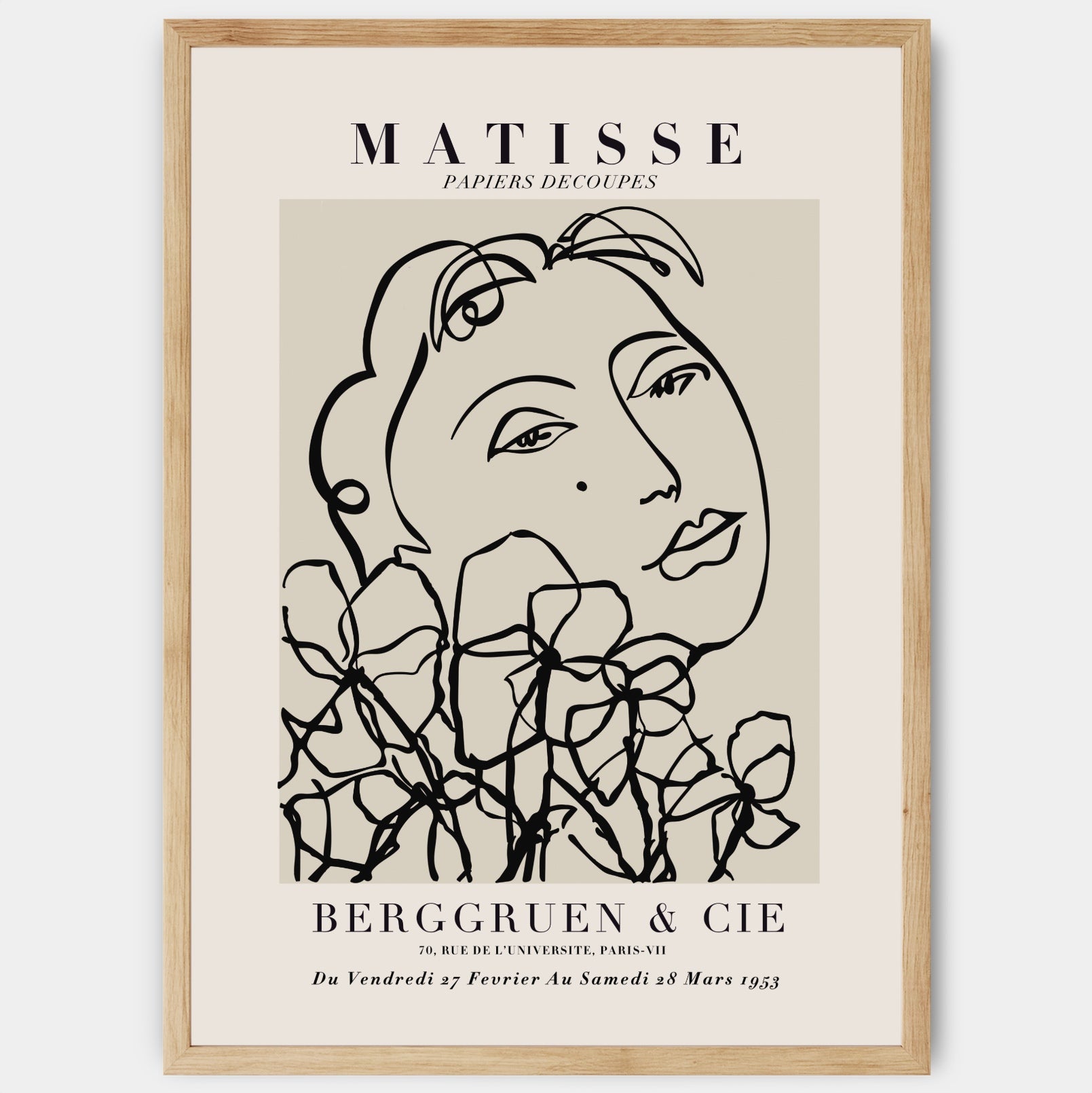 A remake of an exhibition poster featuring the drawing Woman with Flowers by Henri Matisse from 1953. The poster is sold without a frame, with the option to order a thin wooden frame with a thickness of 1.2 cm. There are three color options to choose from - white , black and oak design.