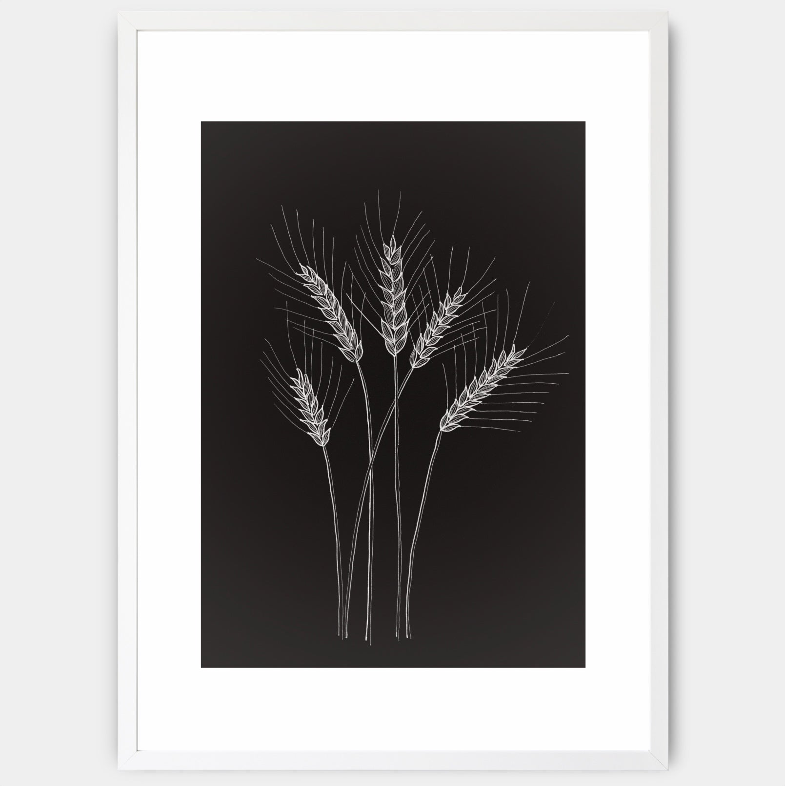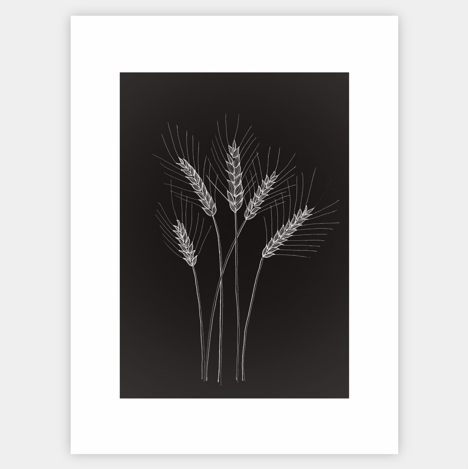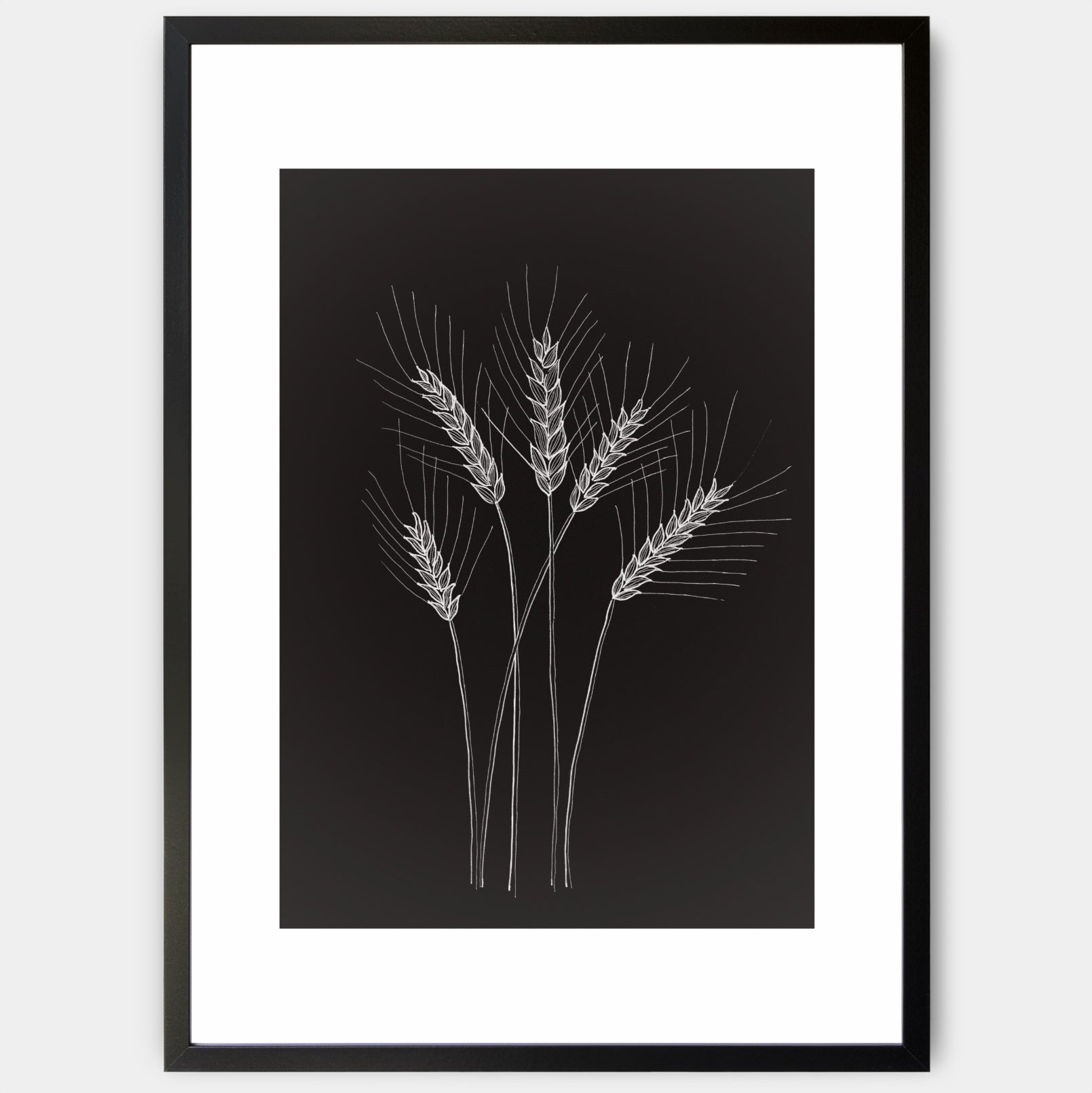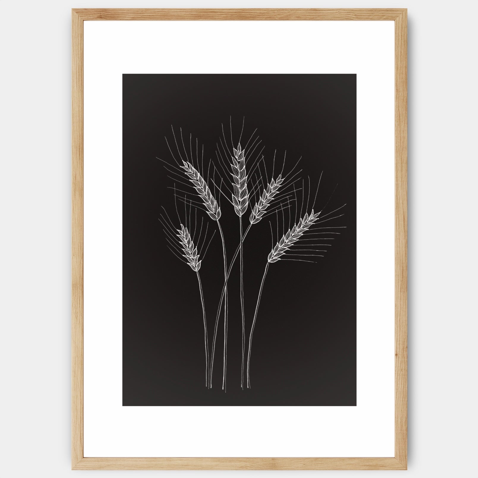 A poster with a motif of wheat ears on a black background from the Night and Day collection. An elegant white border is part of the print, designed so that the print can be supplemented with a standard passe-partout. The poster is sold without a frame, with the option to order a thin wooden frame with a thickness of 1.2 cm. There are three color options to choose from - white , black and oak design.