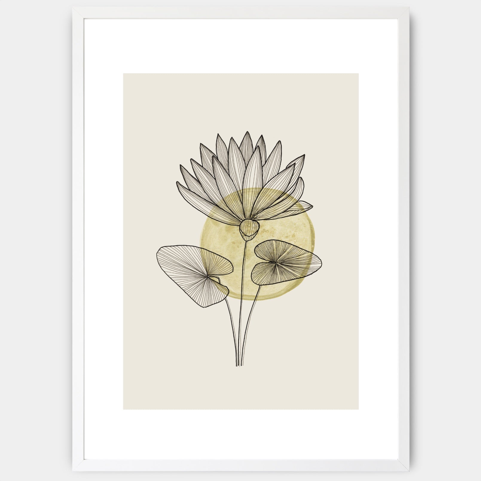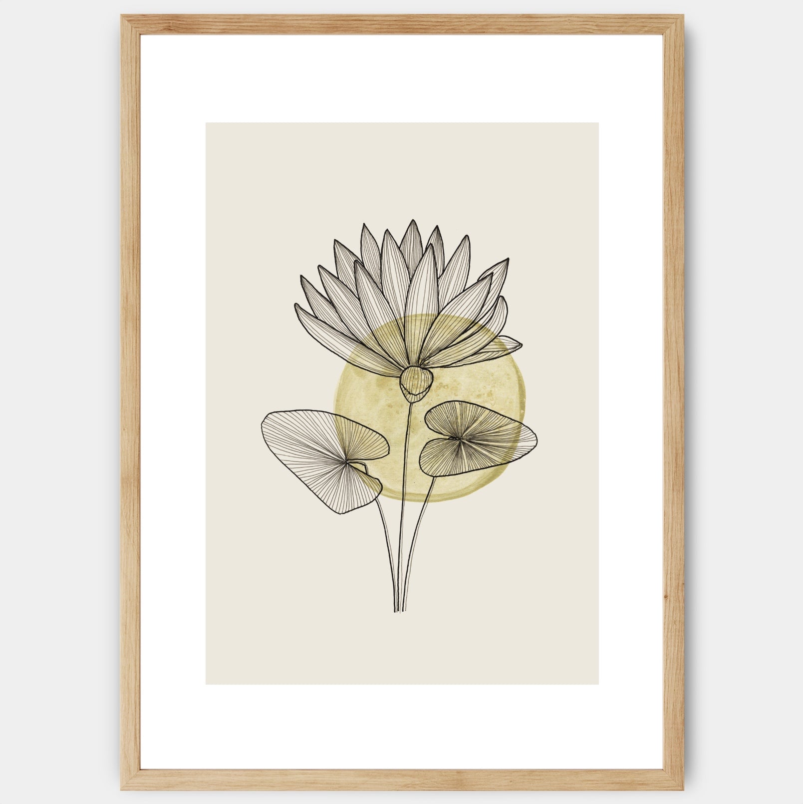 Poster with a water lily motif in beige and gold. An elegant white border is part of the print, designed so that the print can be supplemented with a standard passe-partout. The poster is sold without a frame, with the option to order a thin wooden frame with a thickness of 1.2 cm. There are three color options to choose from - white , black and oak design.