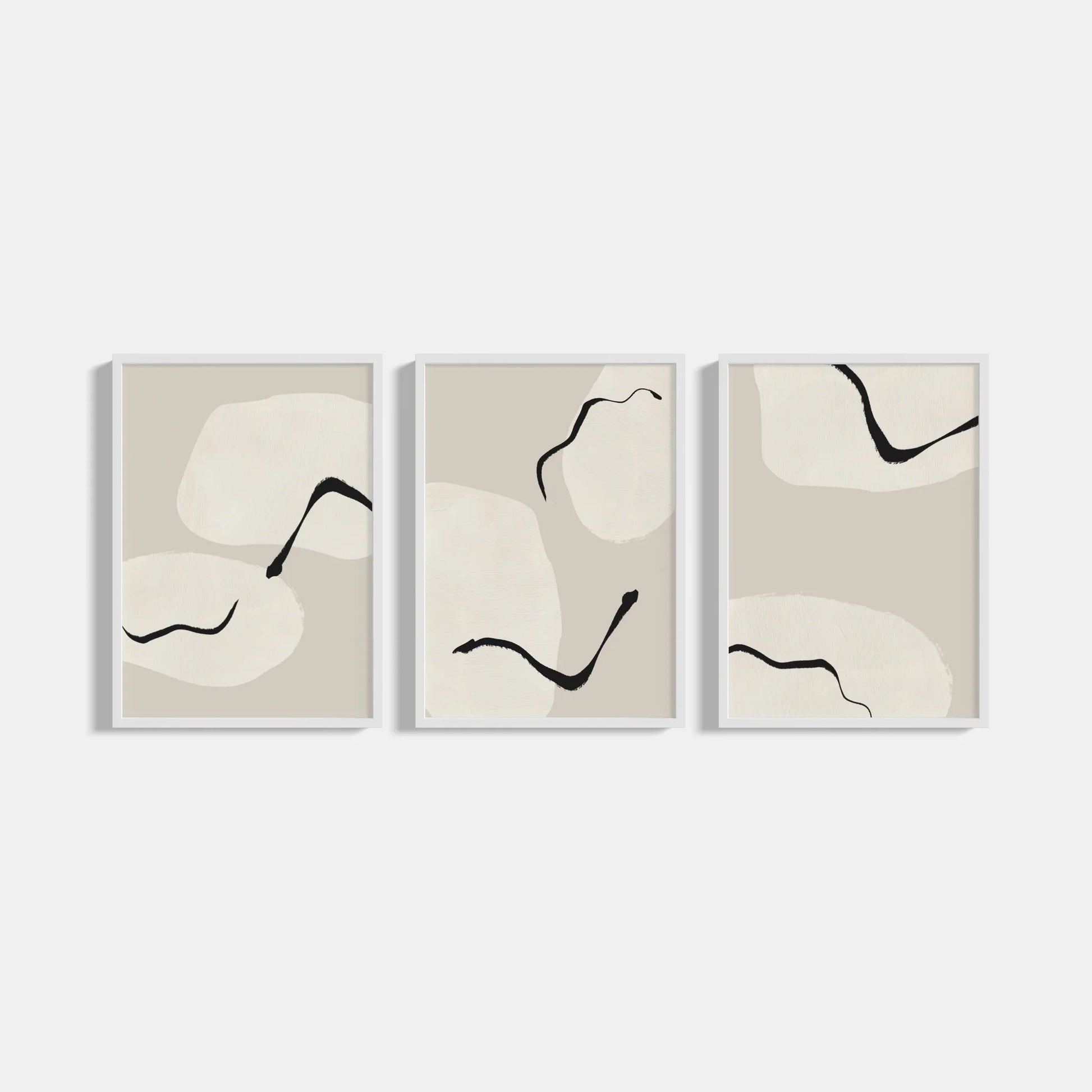 Set of three posters with an abstract motif in beige. Contains 3 posters measuring 50x70cm, without frames. The posters can be purchased with white, black or oak frames .