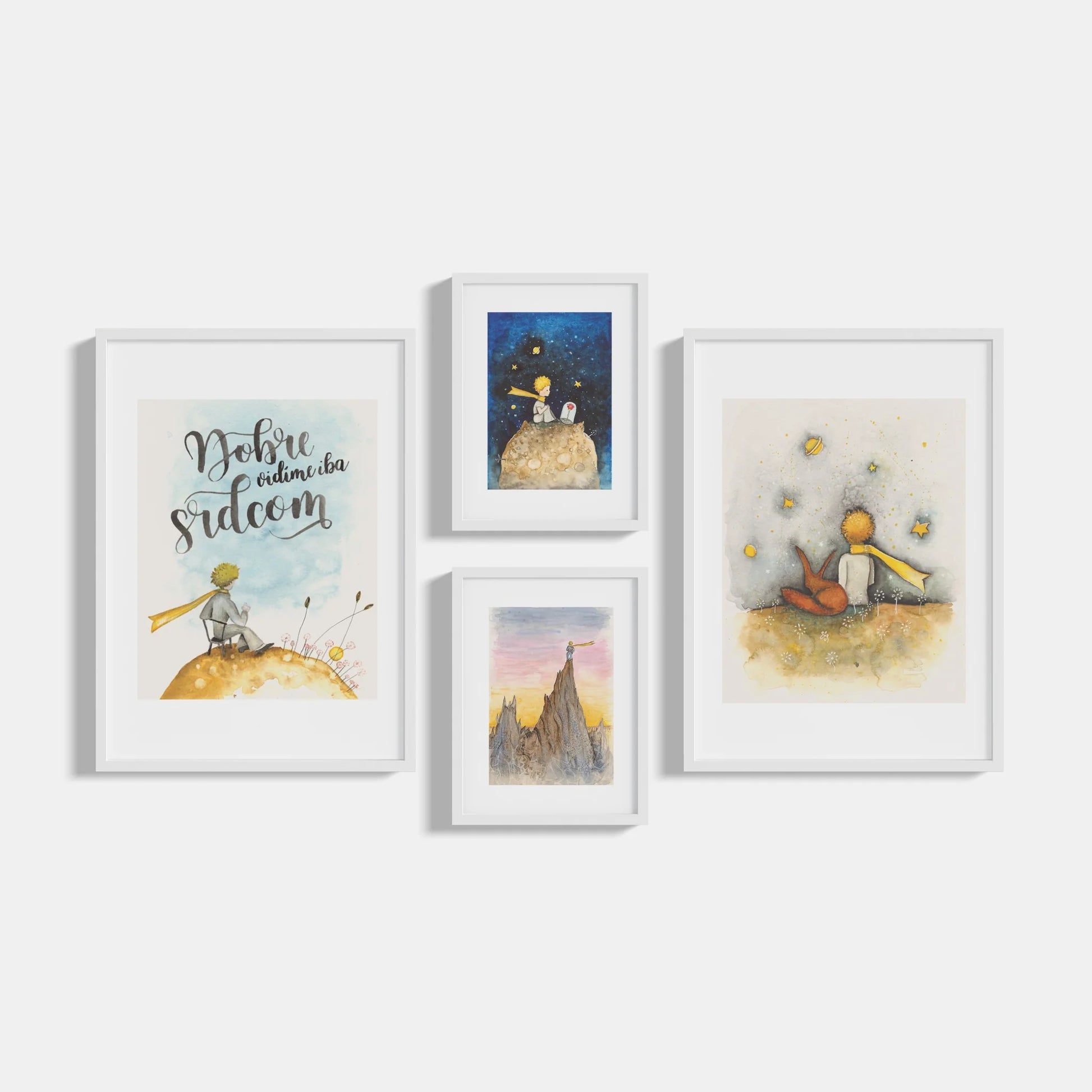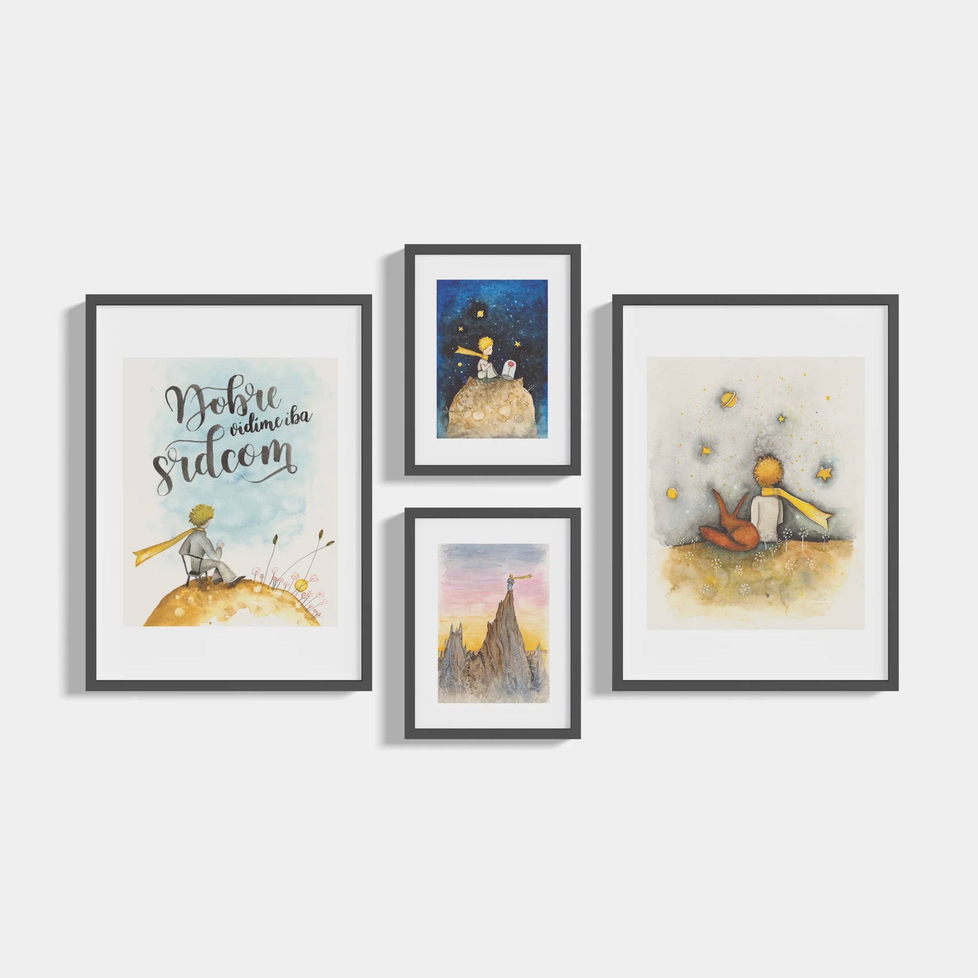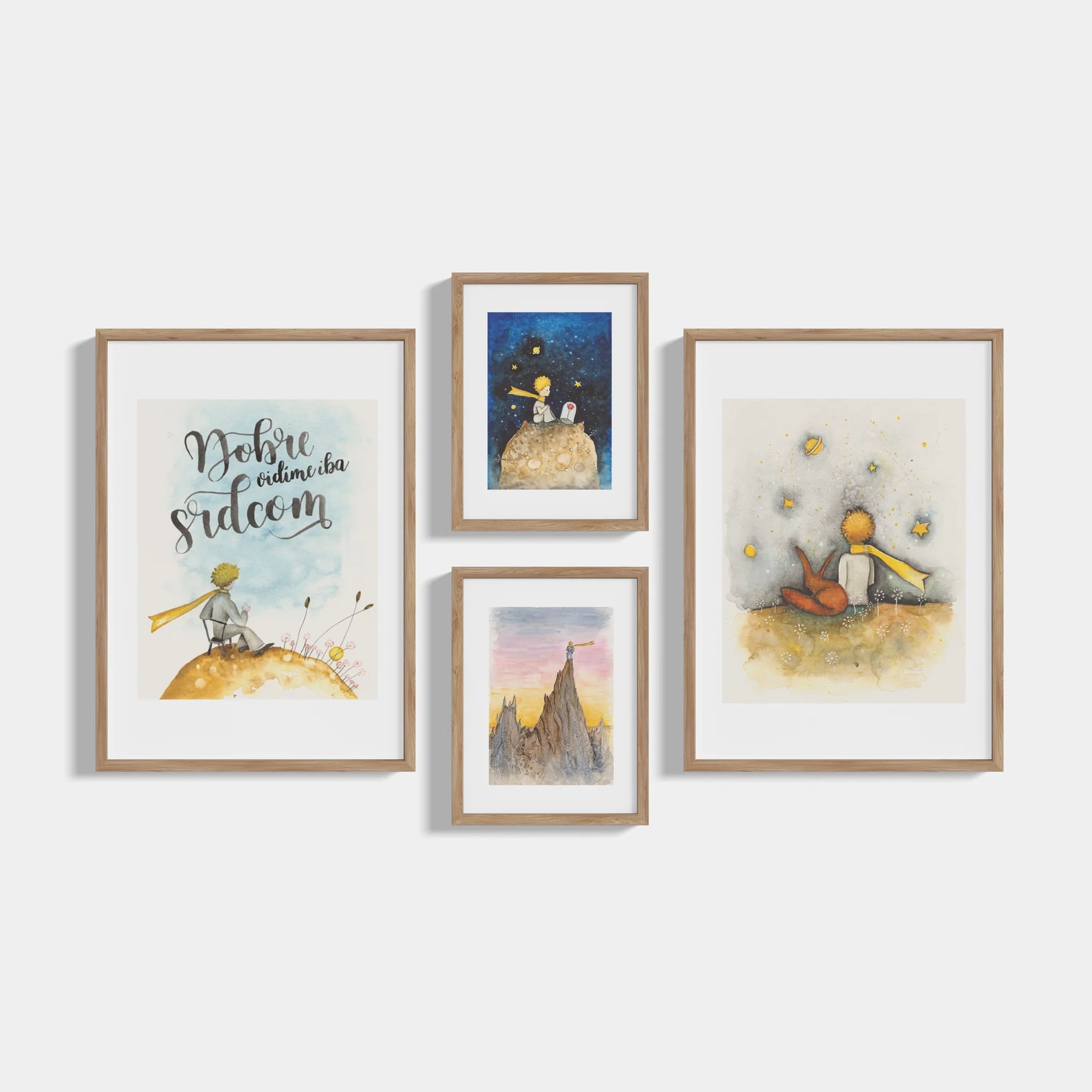 Set of four posters with the Little Prince motif. Contains 2 posters measuring 50x70cm and 2 posters measuring 30x40cm, without frames. The visuals are adapted so that they can be supplemented with a standard mount. The posters can be purchased with white, black or oak frames .