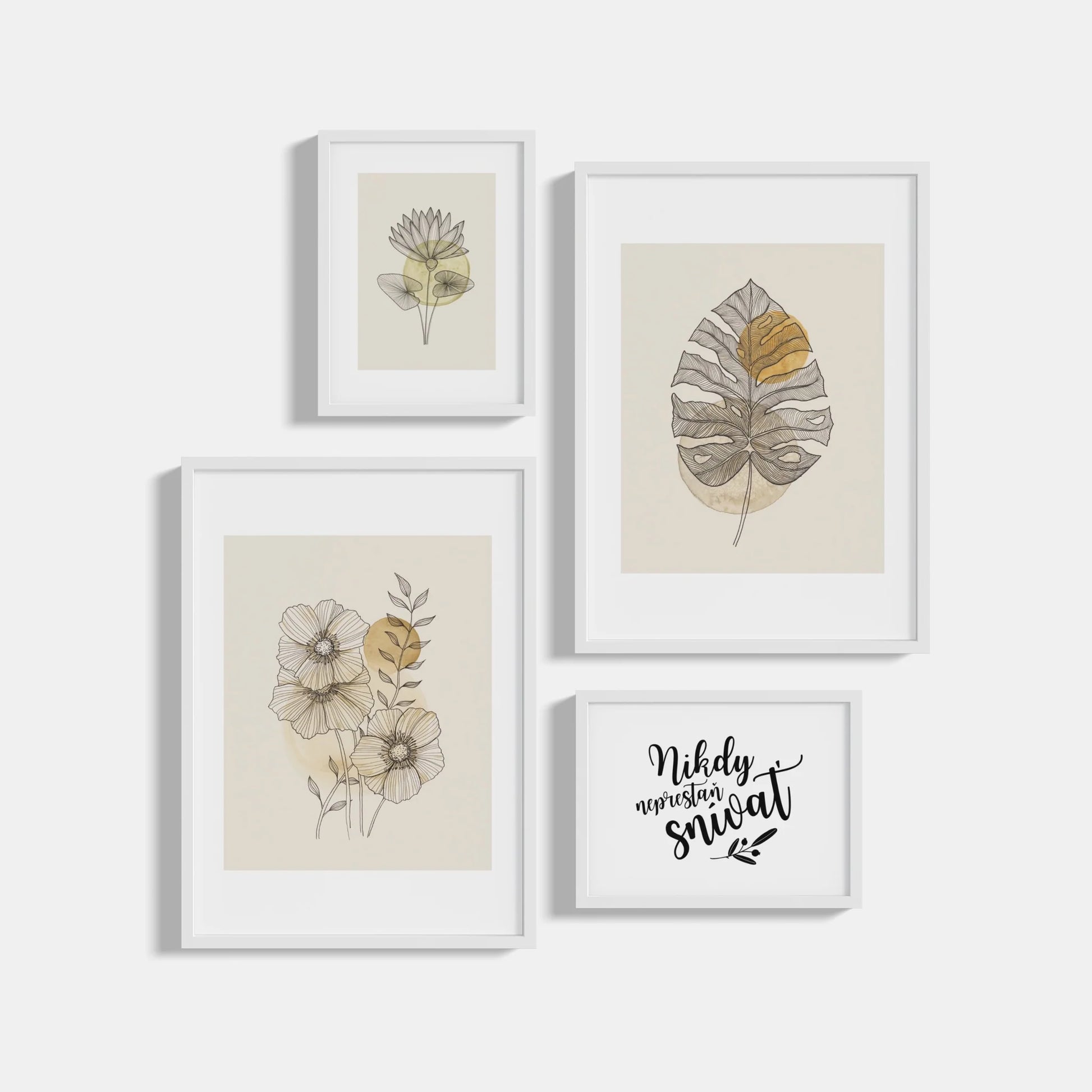 Set of four posters with a floral motif in natural shades. Contains 2 posters measuring 50x70cm and 2 posters measuring 30x40cm, without frames. The posters can be purchased with white, black or oak frames .