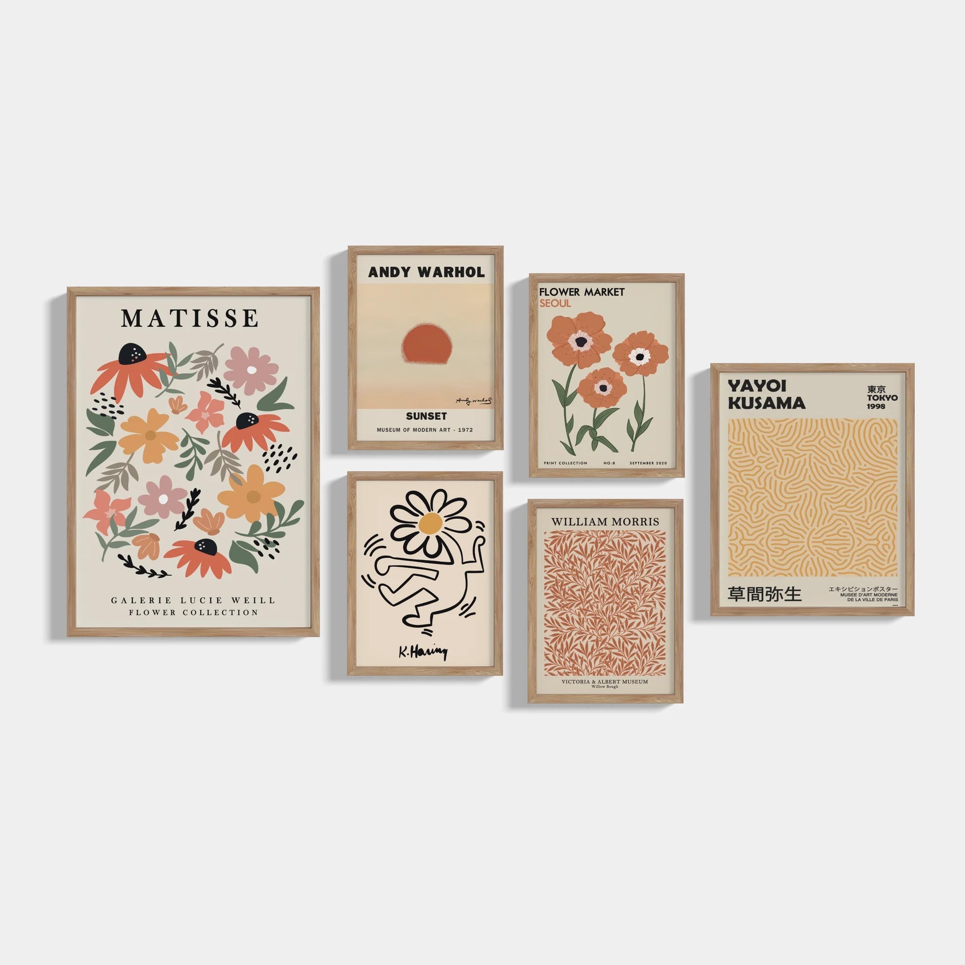 Set of six posters with motifs of works by famous artists. Contains 1 poster measuring 50x70cm, 1 poster measuring 40x50cm and 4 posters measuring 30x40cm, without frames. The posters can be purchased with white, black or oak frames .