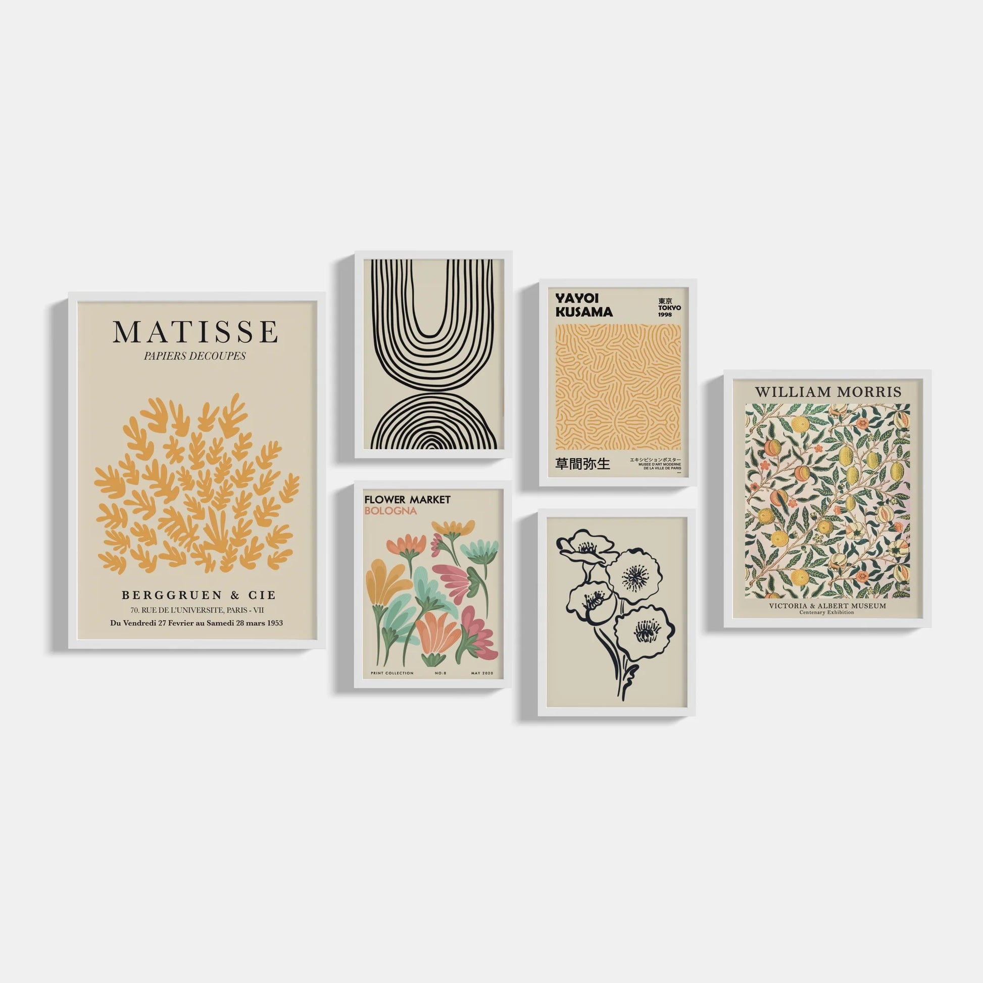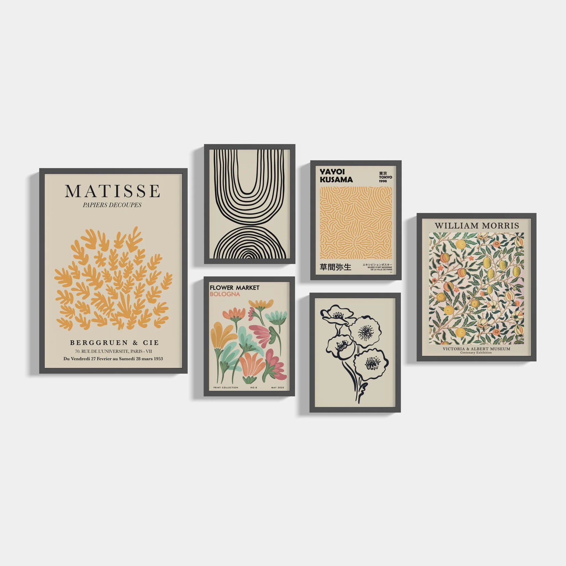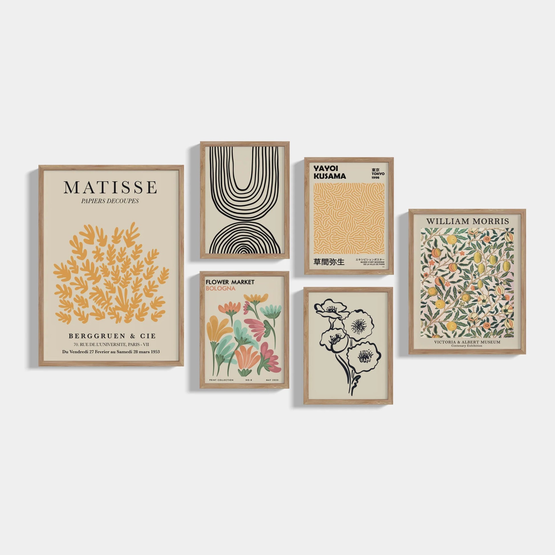 Set of six modern posters. Contains 1 poster measuring 50x70cm, 1 poster measuring 40x50cm and 4 posters measuring 30x40cm, without frames. The posters can be purchased with white, black or oak frames .