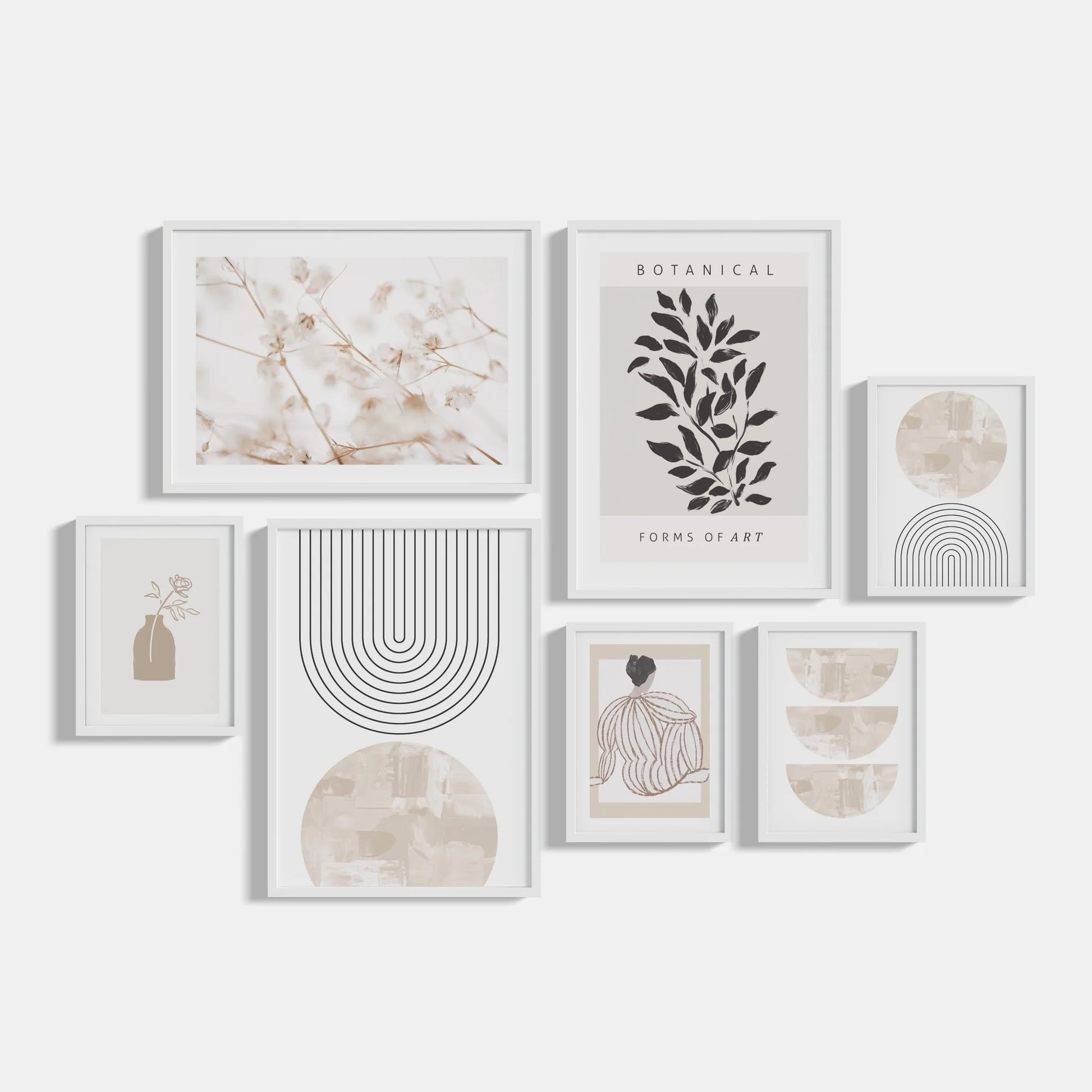 Set of seven minimalist posters in natural shades. Contains 3 posters measuring 50x70cm and 4 posters measuring 30x40cm, without frames. The posters can be purchased with white, black or oak frames .