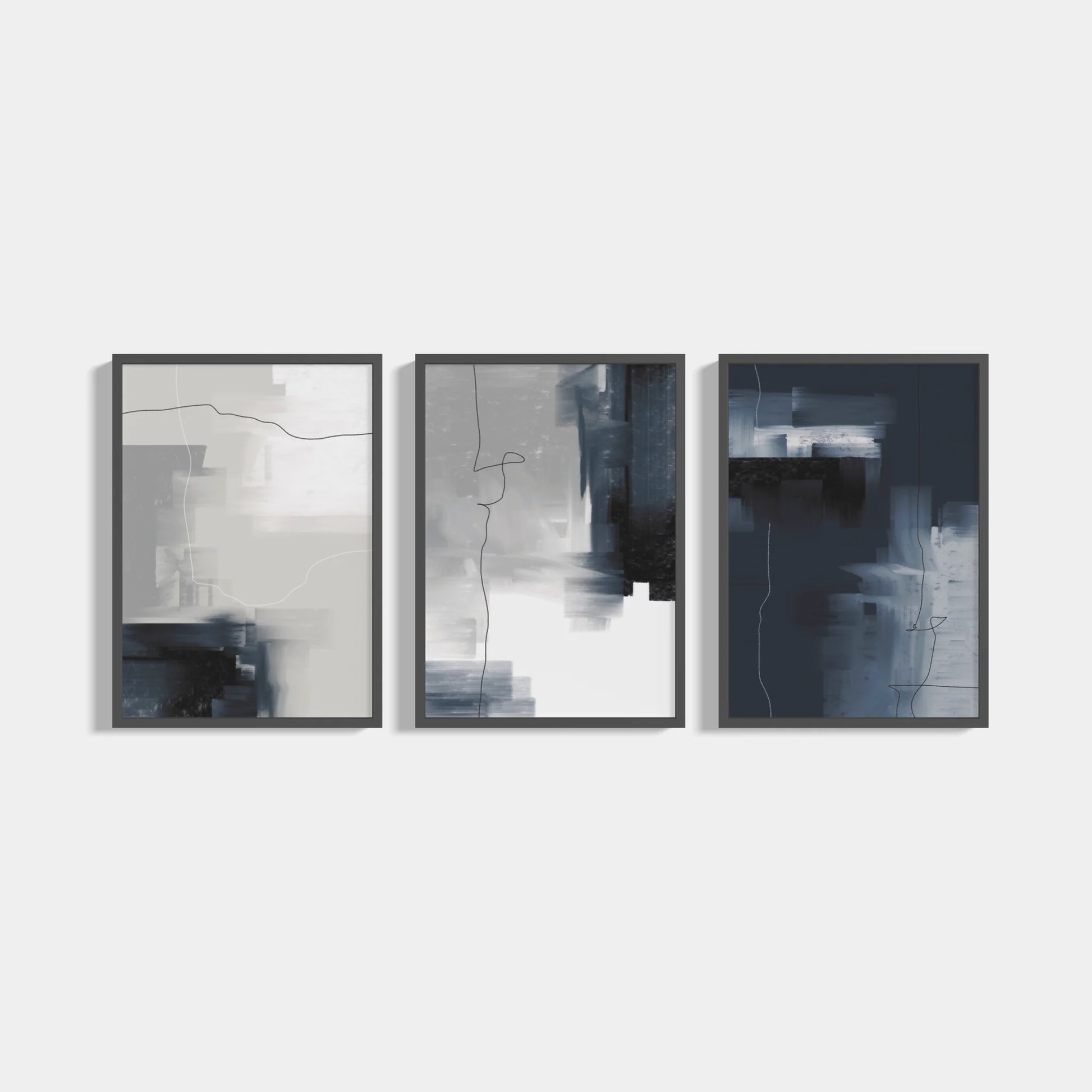 Set of three posters with an abstract motif in dark blue. Contains 3 posters measuring 50x70cm, without frames. The posters can be purchased with white, black or oak frames .
