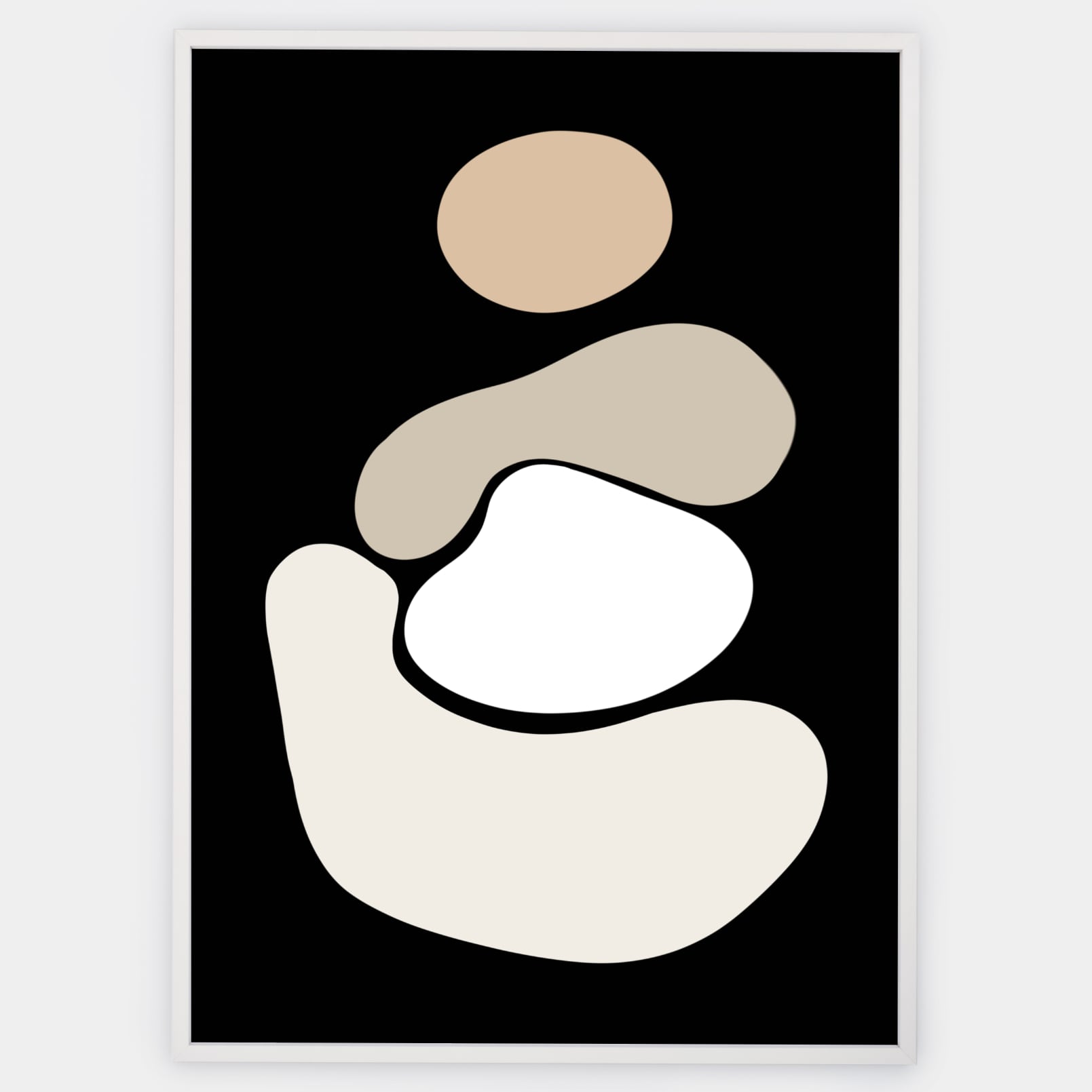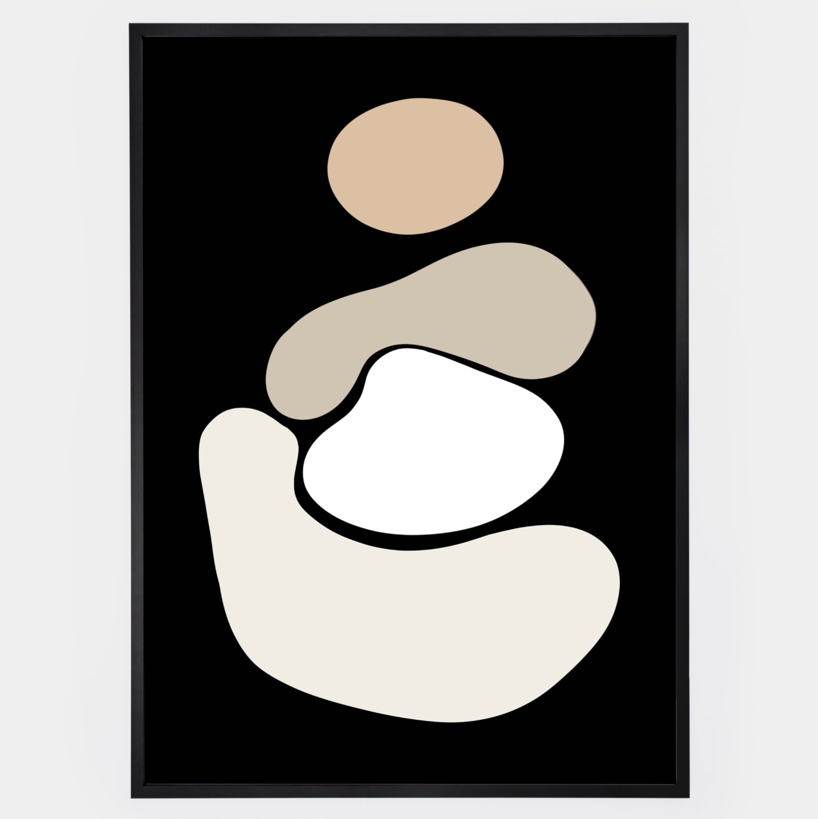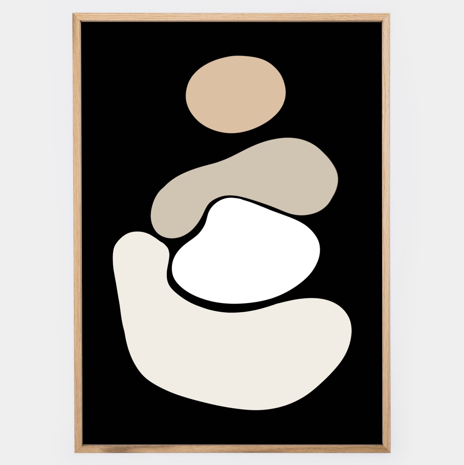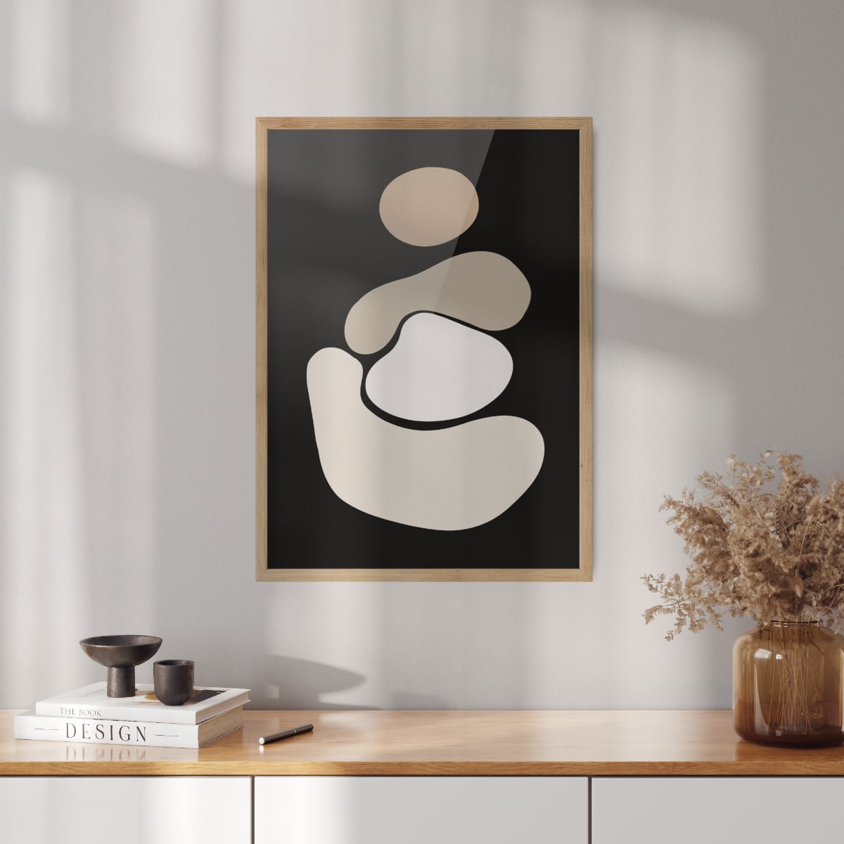 Boho plagát s grafikou "Drops" na čiernom podklade. Poster sa predáva bez rámu s možnosťou doobjednať tenký drevený rám o hrúbke 1,2 cm. Na výber sú tri farebné prevedenia - biely, čierny a dubový dizajn.