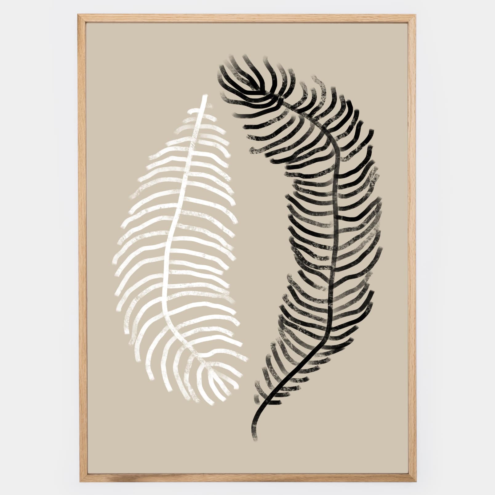 Boho plagát s grafikou "Feather" na béžovom podklade. Poster sa predáva bez rámu s možnosťou doobjednať tenký drevený rám o hrúbke 1,2 cm. Na výber sú tri farebné prevedenia - bielyčierny a dubový dizajn.