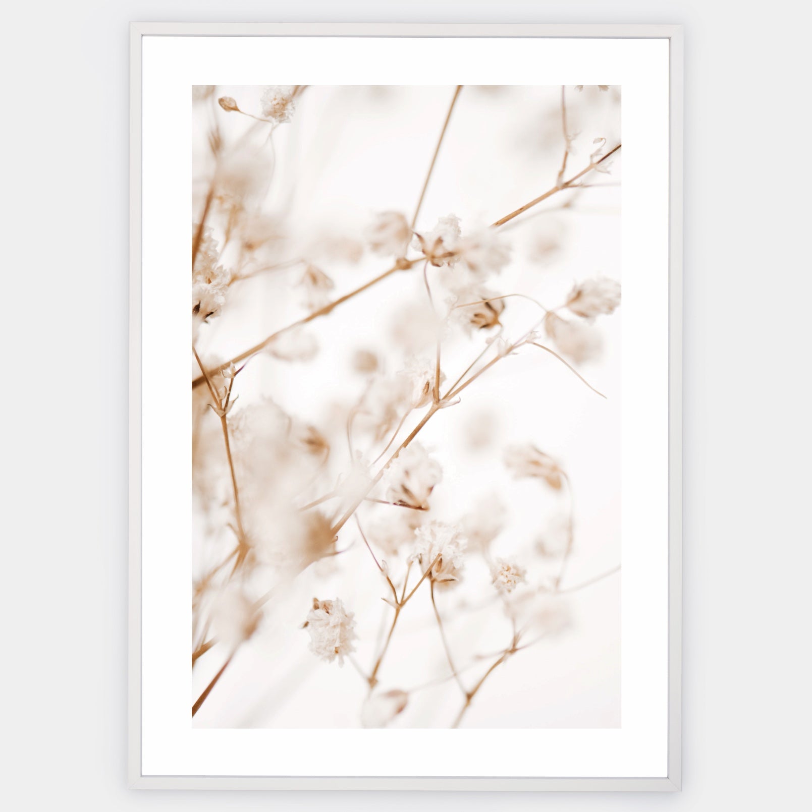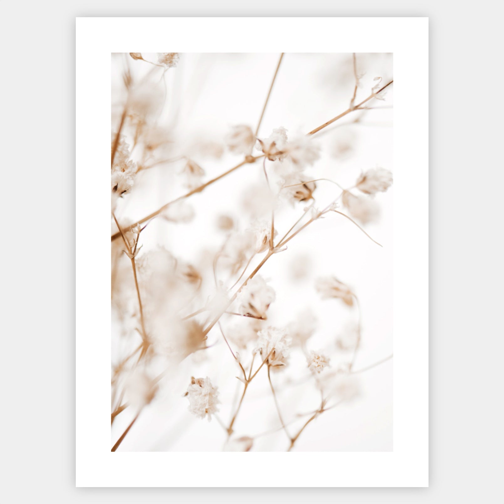 Boho plagát s fotografiou sušenej gypsomilky. Elegantný biely okraj je súčasťou printu. Poster sa predáva bez rámu s možnosťou doobjednať tenký drevený rám o hrúbke 1,2 cm. Na výber sú tri farebné prevedenia - biely, čierny a dubový dizajn.