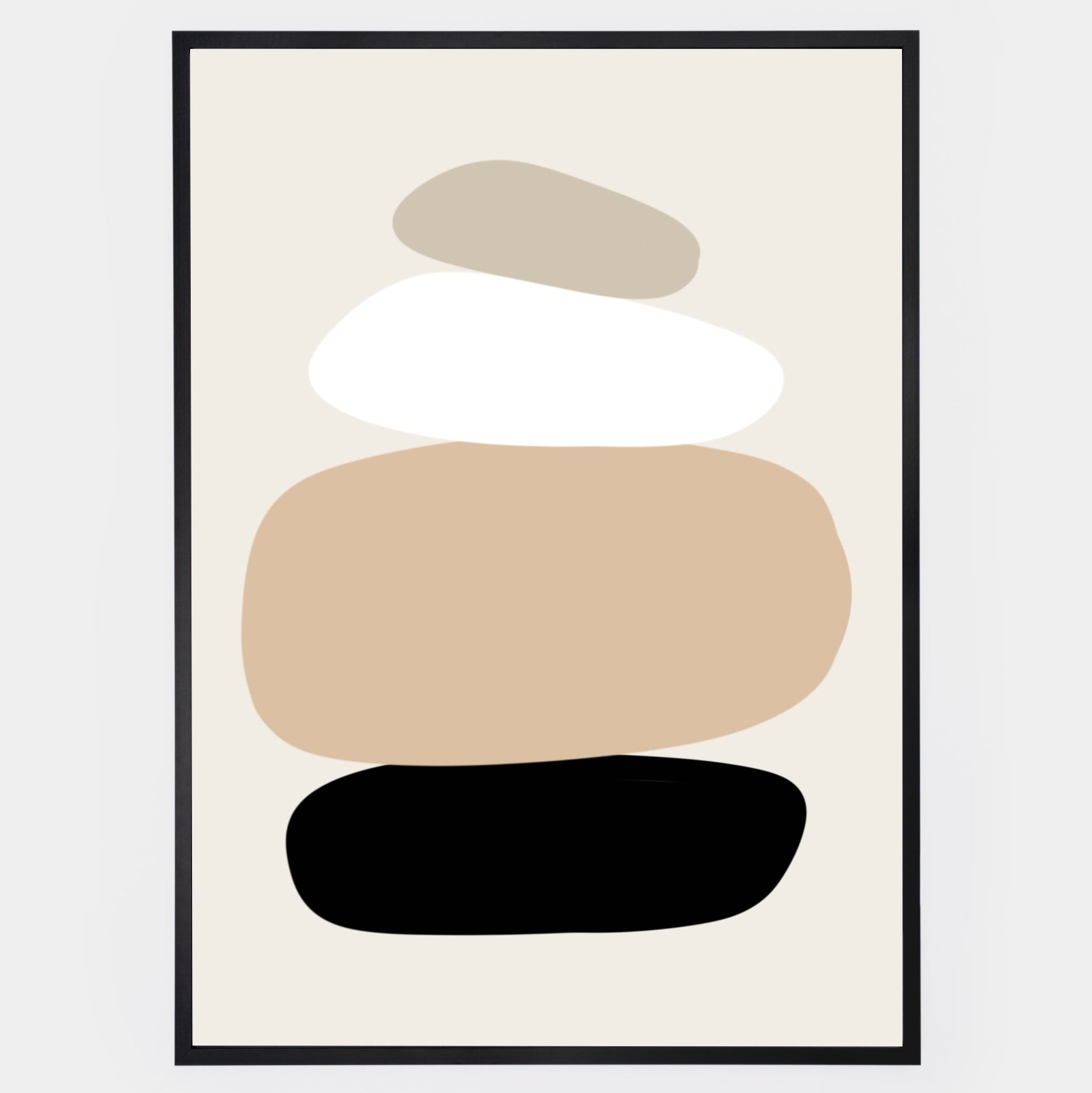 Boho plagát s grafikou "Stones" na béžovom podklade. Poster sa predáva bez rámu s možnosťou doobjednať tenký drevený rám o hrúbke 1,2 cm. Na výber sú tri farebné prevedenia - biely, čierny a dubový dizajn.